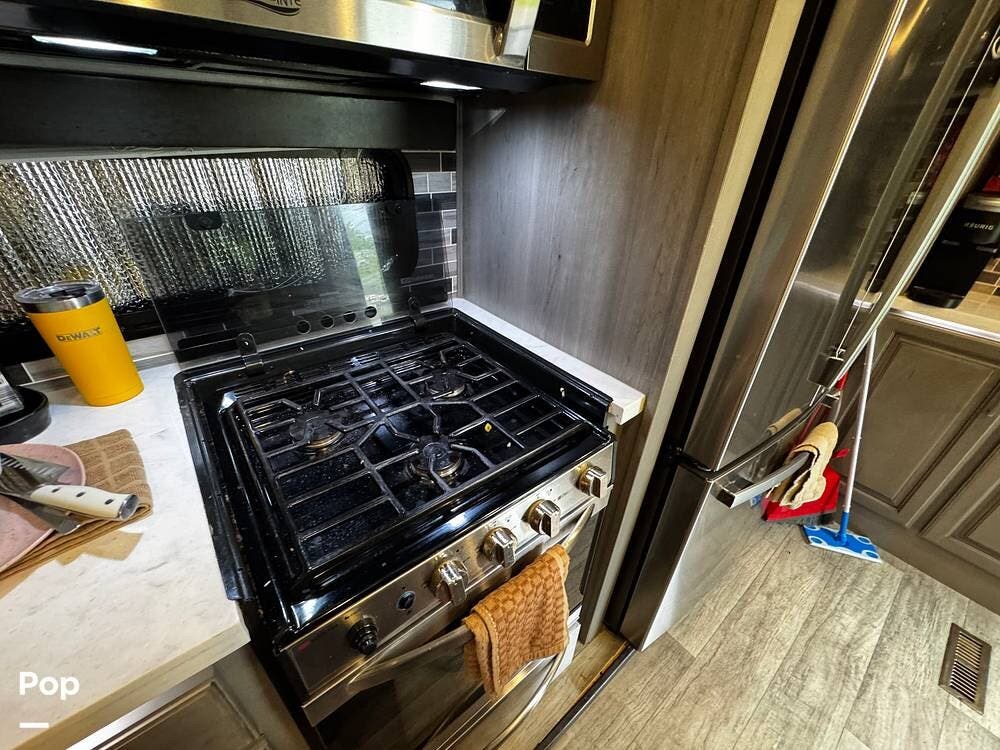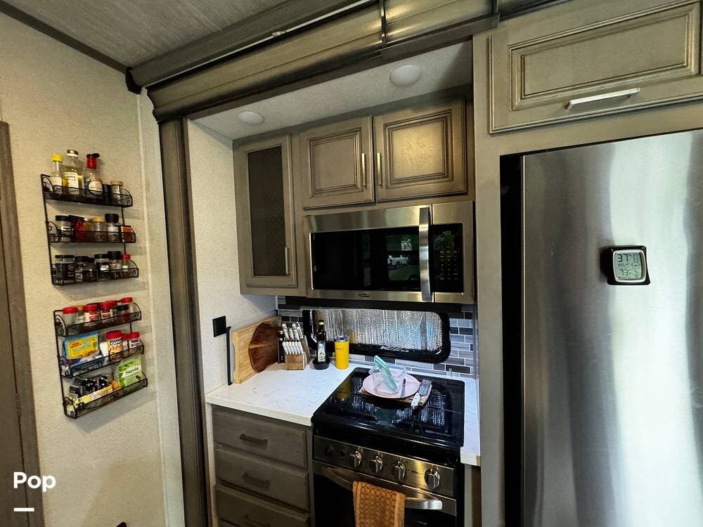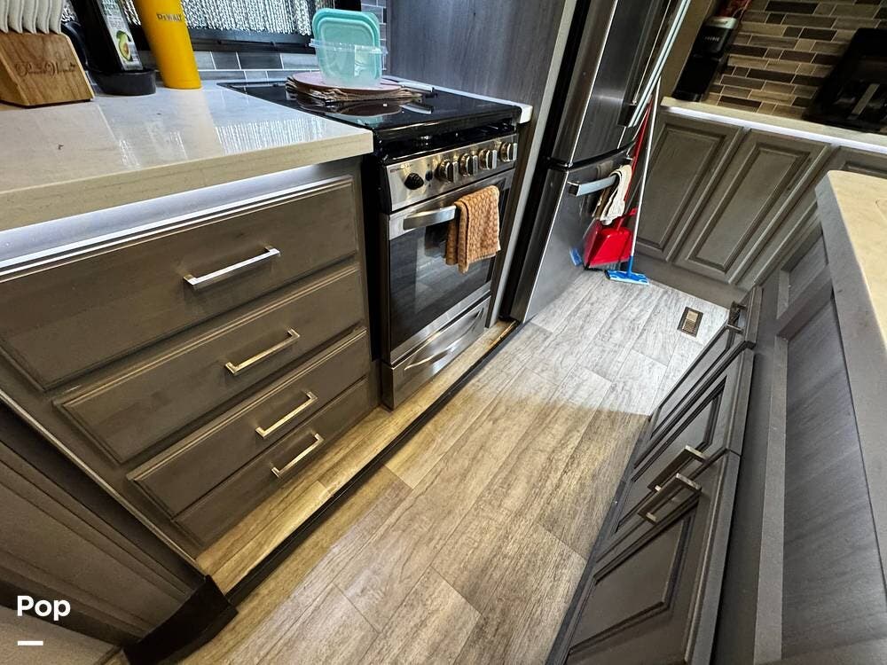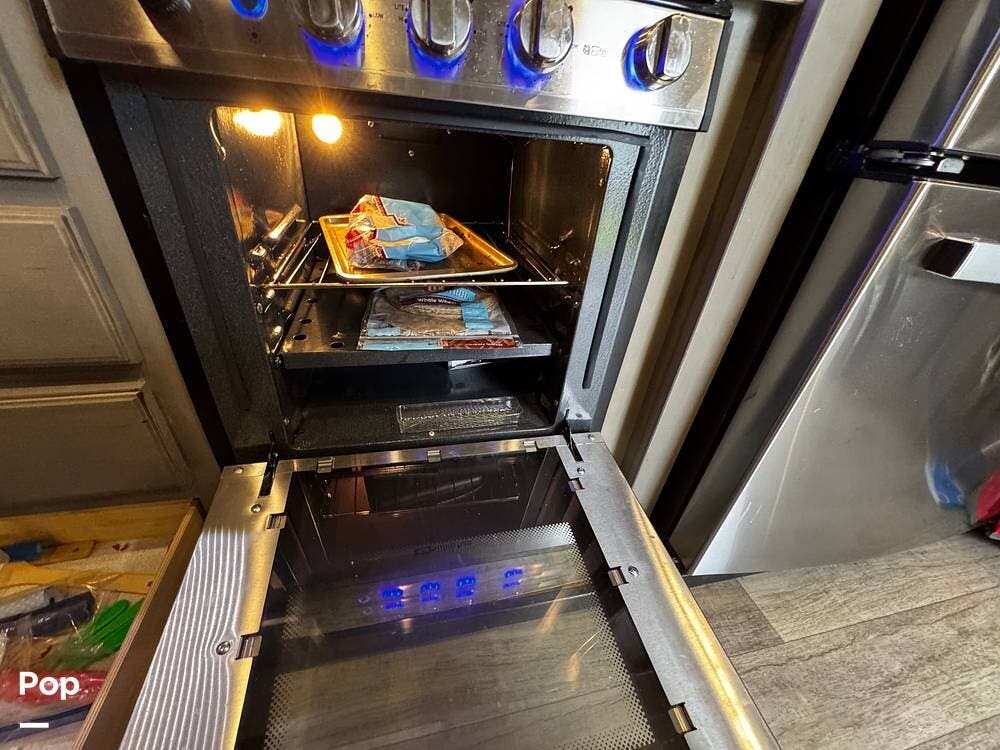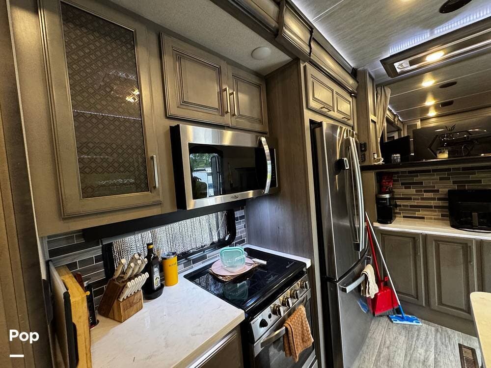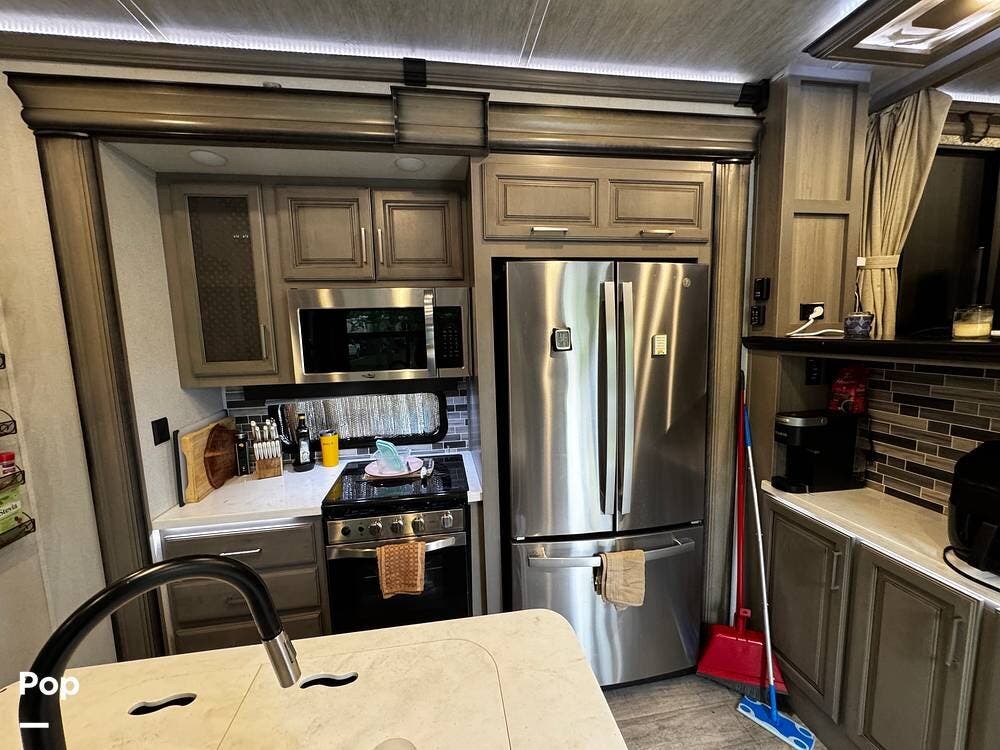 Moving toward the heart of this RV, the kitchen boasts premium finishes and modern amenities. It's a culinary enthusiast's dream, featuring an island sink, a full-size residential refrigerator, and a 4-seat dinette for dining in style. The 3-burner gas stove, microwave, and gas oven offer plenty of cooking options, while the pantry provides additional storage for all your essentials. Conveniently located nearby is a half-bathroom for added comfort.