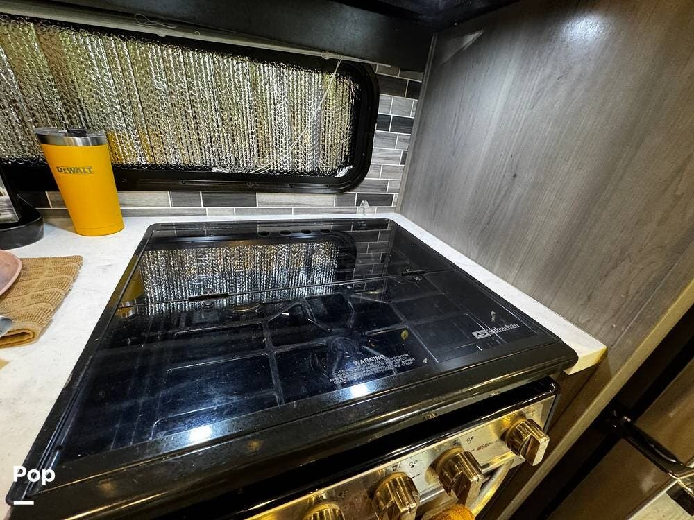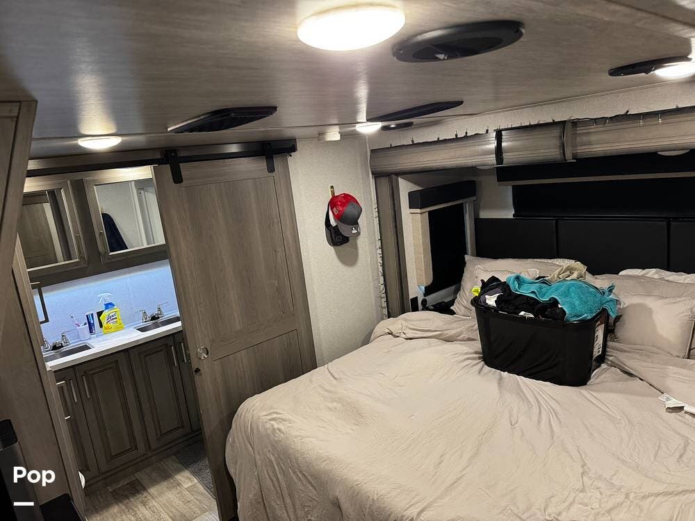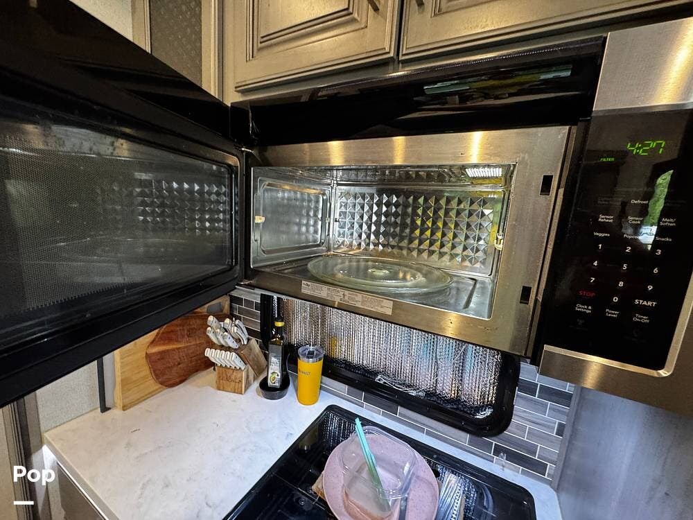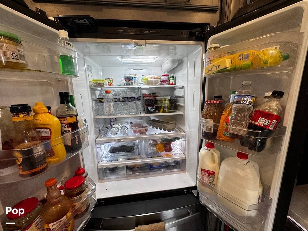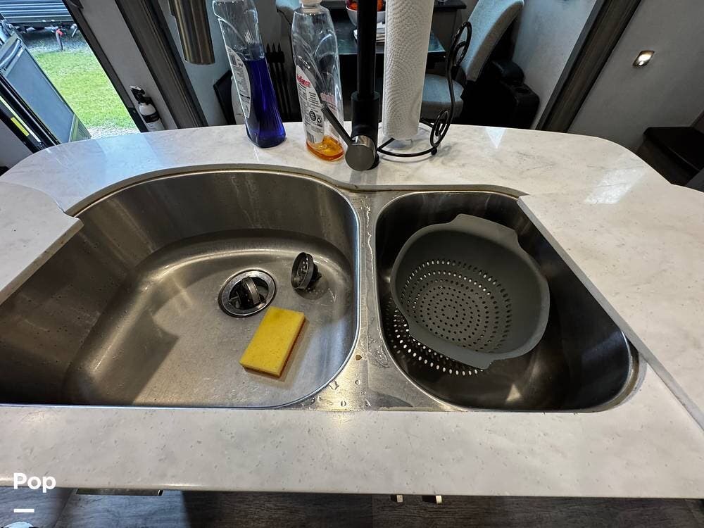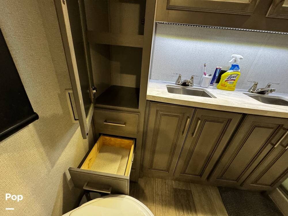 Moving toward the heart of this RV, the kitchen boasts premium finishes and modern amenities. It's a culinary enthusiast's dream, featuring an island sink, a full-size residential refrigerator, and a 4-seat dinette for dining in style. The 3-burner gas stove, microwave, and gas oven offer plenty of cooking options, while the pantry provides additional storage for all your essentials. Conveniently located nearby is a half-bathroom for added comfort.
