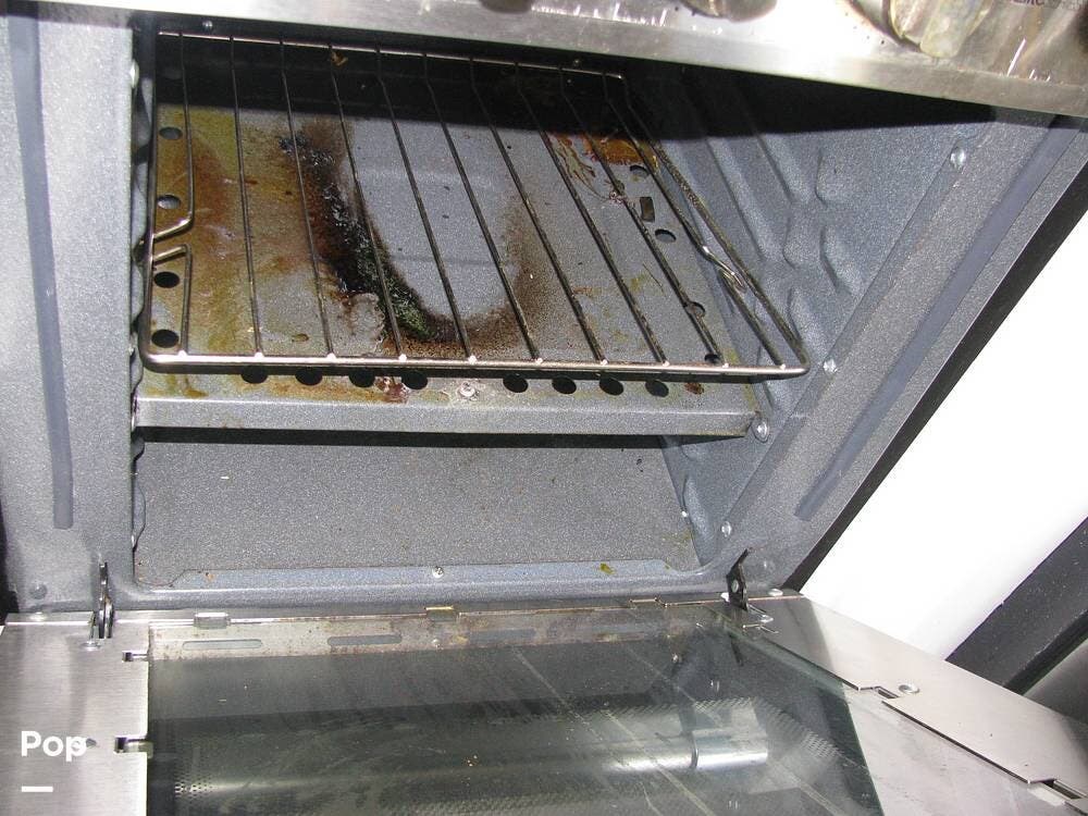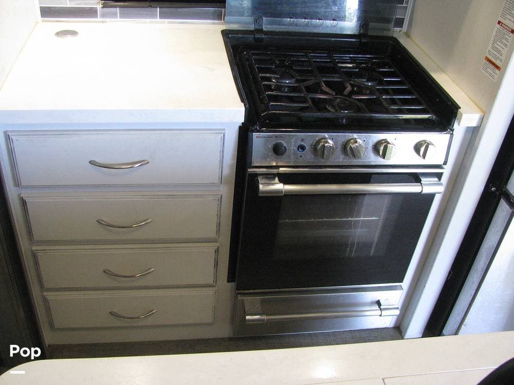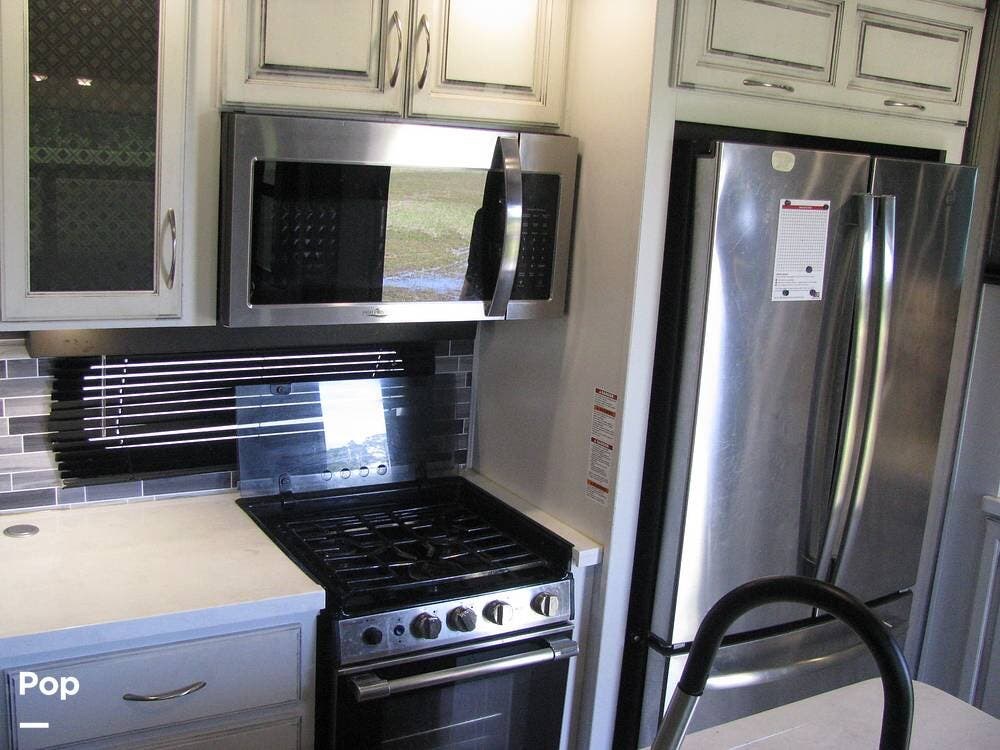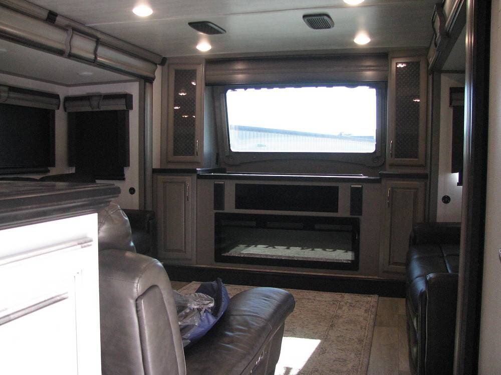 The forward living room area has three sofas a fireplace and large TV. From there, you step down to the kitchen-dining area, which has all the appliances you need for camping or living, as well as a lovely dining table and chairs.