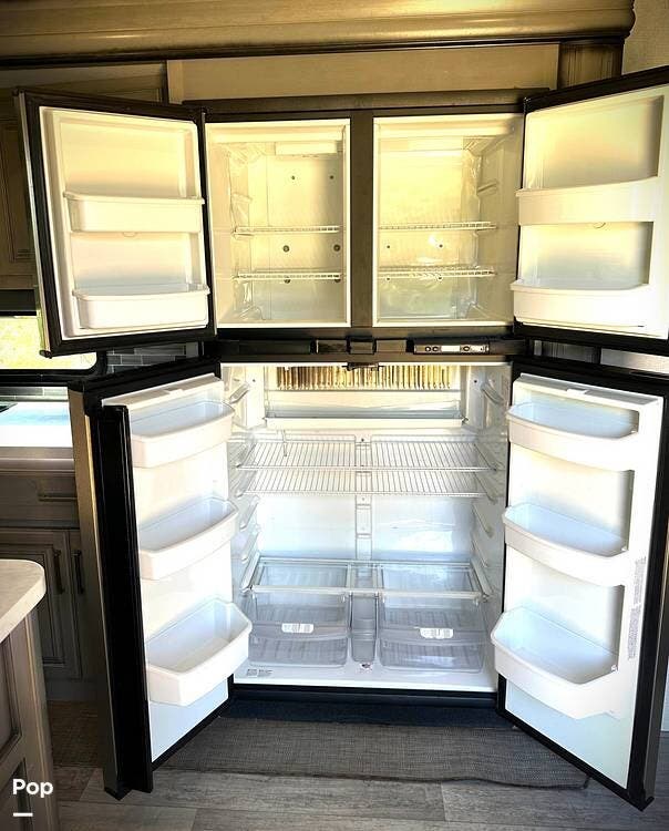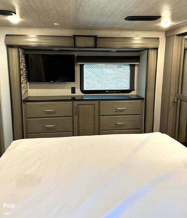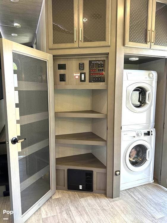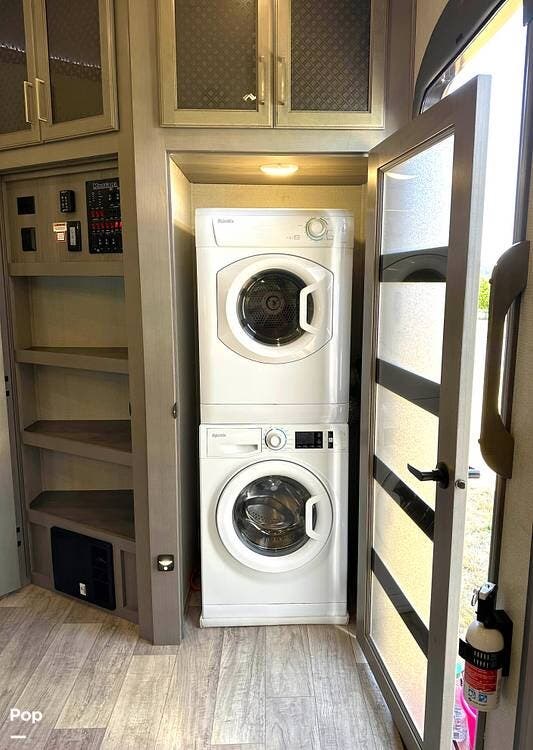 Adding to the right at home feeling is the stack washer and dryer with a fantastic amount of cupboards, cabinets, closets, and drawers. You'll have room for all your camping gear with the exterior pass-through storage and side compartments.
