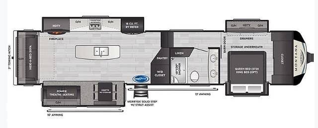 Built for year-round adventures, the Montana 3780RL comes with the Four Season Living Package, including a heated and enclosed underbelly, 12v heat pads on holding tanks, dual attic vents, reflective foil insulation, and Astrofoil-insulated slide floors. MORryde Step Above entry steps with strut assist, Hitch Vision with LED lighting, and an electric patio awning with integrated LEDs make setup and camp life a breeze.