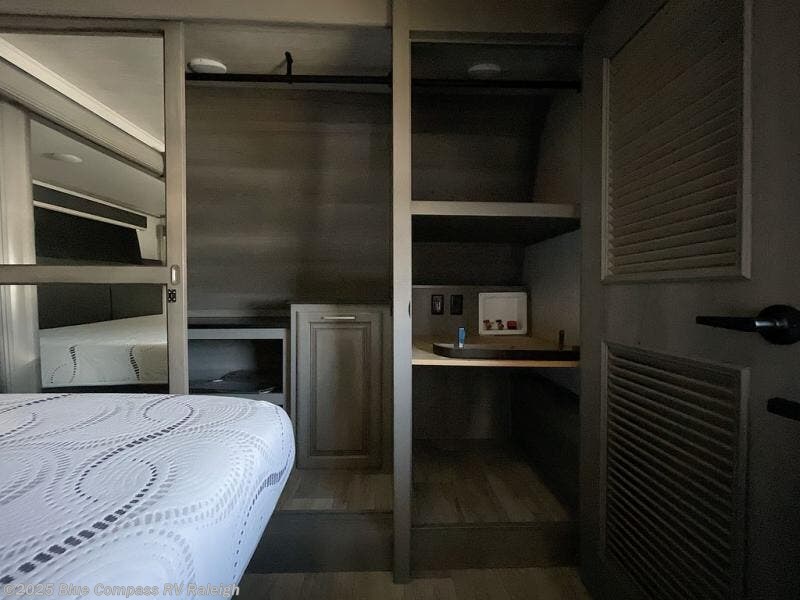 The thing that you will love most about this Montana fifth wheel is the kitchen! Because the kitchen has opposing slides, you have plenty of space to work around the island. There is also a coffee station that you can use whenever you need a specialty brew, and the pantry, floor cabinets, and overhead cabinets provide you with great storage. Right next to the kitchen is the separate living room which also has opposing slides so that you have room to lounge on the two hide-a-bed sofas or on the power theater seating, and if you need some privacy while you relax, you can simply head up to the queen bed slide in the private bedroom. The bedroom is where you will find the clothing hamper, under-bed storage, preparations for the optional washer/dryer, and a barn door to close it off.