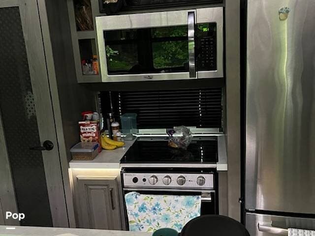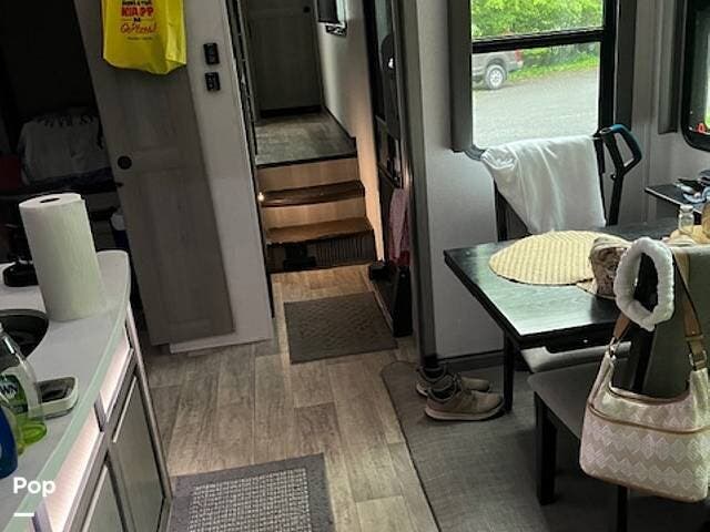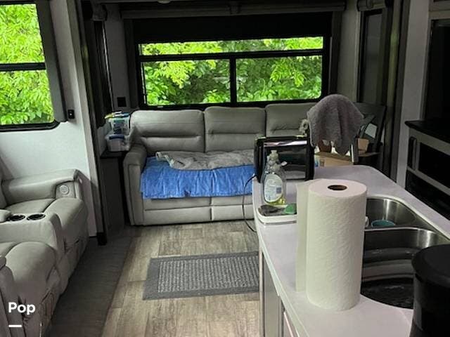 This one-owner Montana was clearly chosen with family and comfort in mind. From the moment you step inside, it feels open, warm, and thoughtfully designed for real life on the road. The spacious living area invites everyone to gather, whether it's movie night by the fireplace or relaxing on the sofa sleeper after a long day of adventure. The kitchen island becomes the natural hub of the home -- perfect for cooking together, serving snacks, or lingering over morning coffee. With a large pantry and smart storage throughout, you'll have room for everything without clutter.