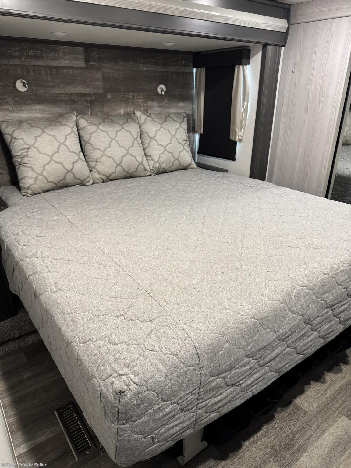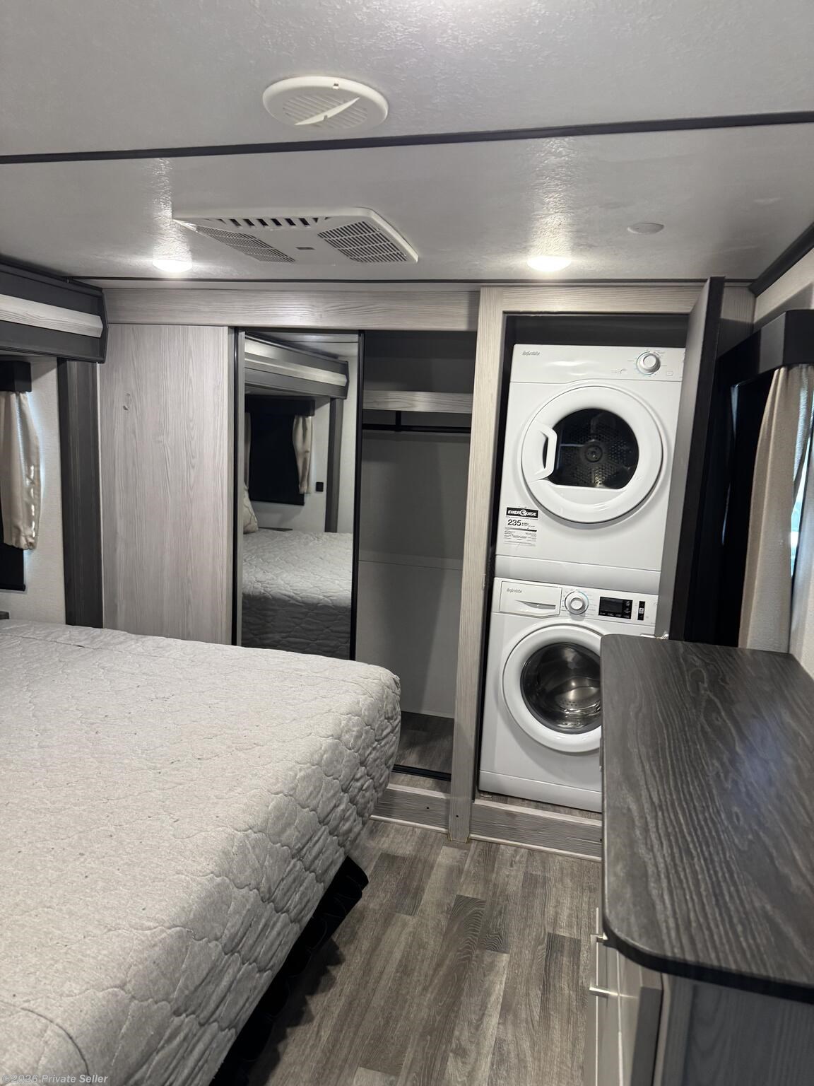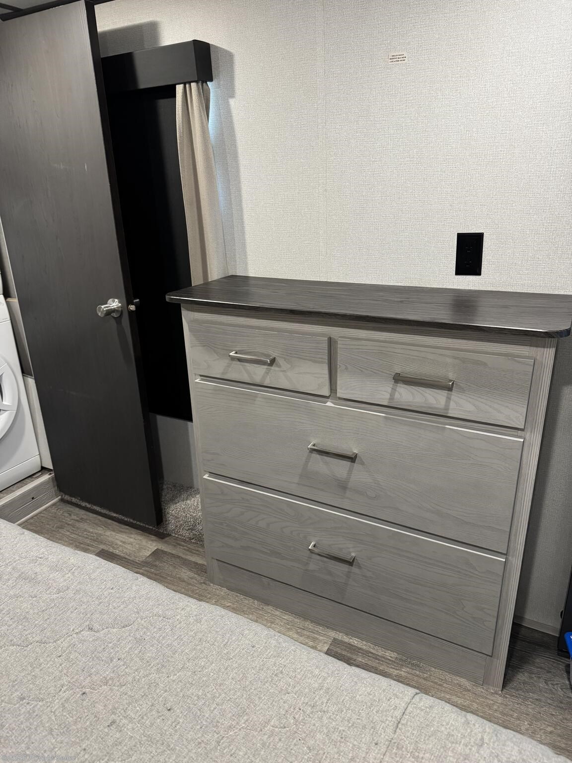 The front bedroom offers a large comfortable space with a 3rd slide-out to accommodate a king-size bed, a 2nd A/C unit (un-ducted) above the bed with its own thermostat, & blackout shades. It has a large wardrobe storage closet, a stacked washer/dryer, and 4-drawer dresser with nearby TV hookups.