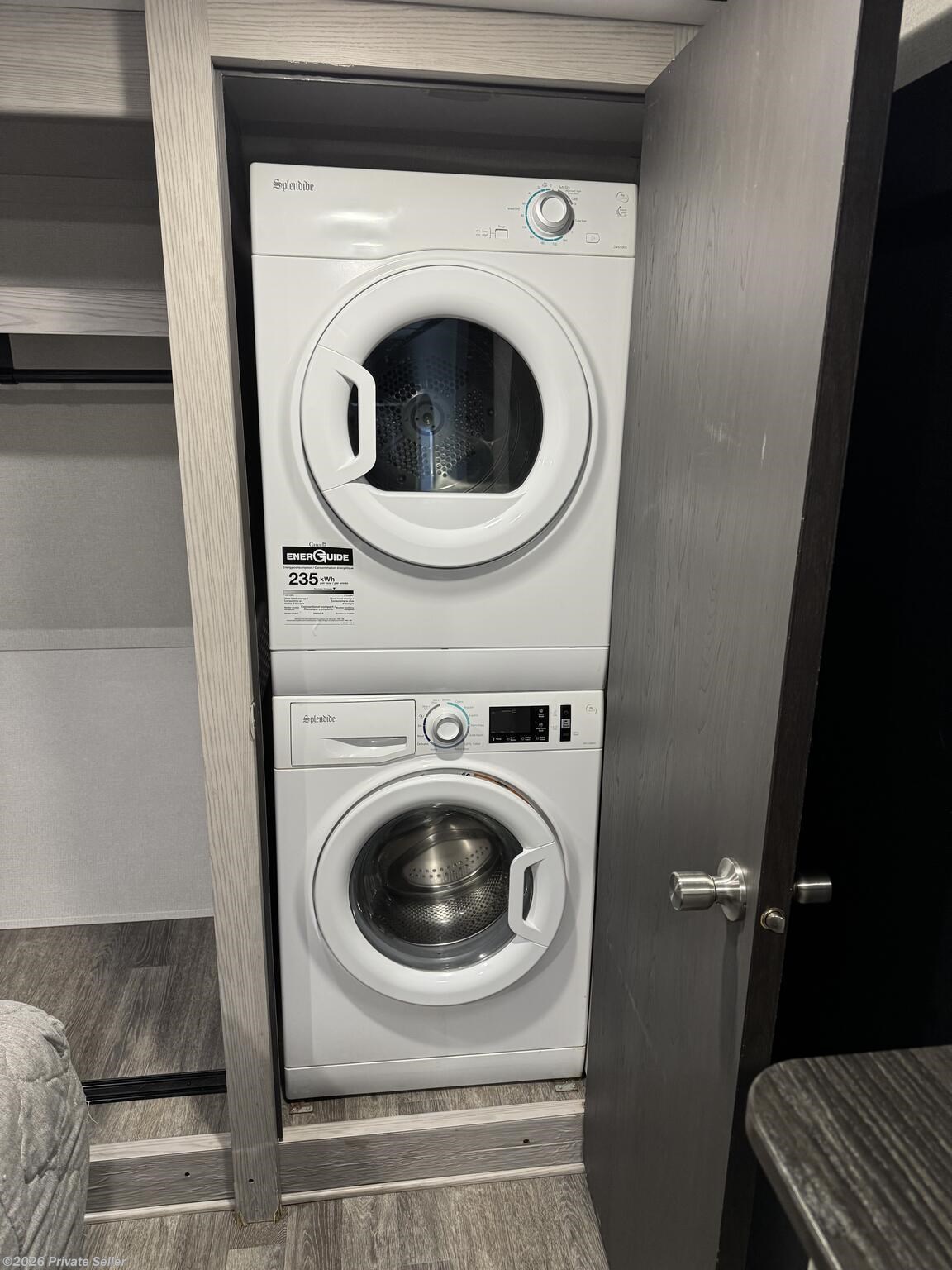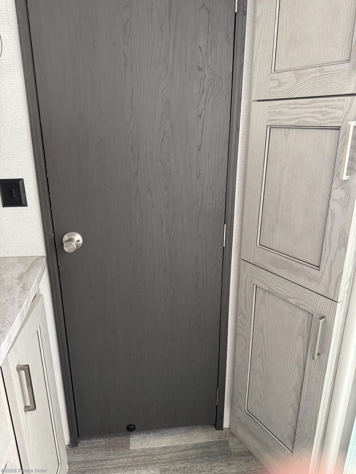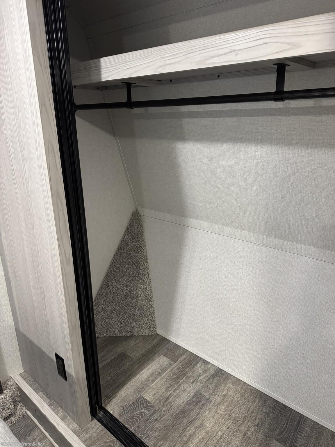The front bedroom offers a large comfortable space with a 3rd slide-out to accommodate a king-size bed, a 2nd A/C unit (un-ducted) above the bed with its own thermostat, & blackout shades. It has a large wardrobe storage closet, a stacked washer/dryer, and 4-drawer dresser with nearby TV hookups.