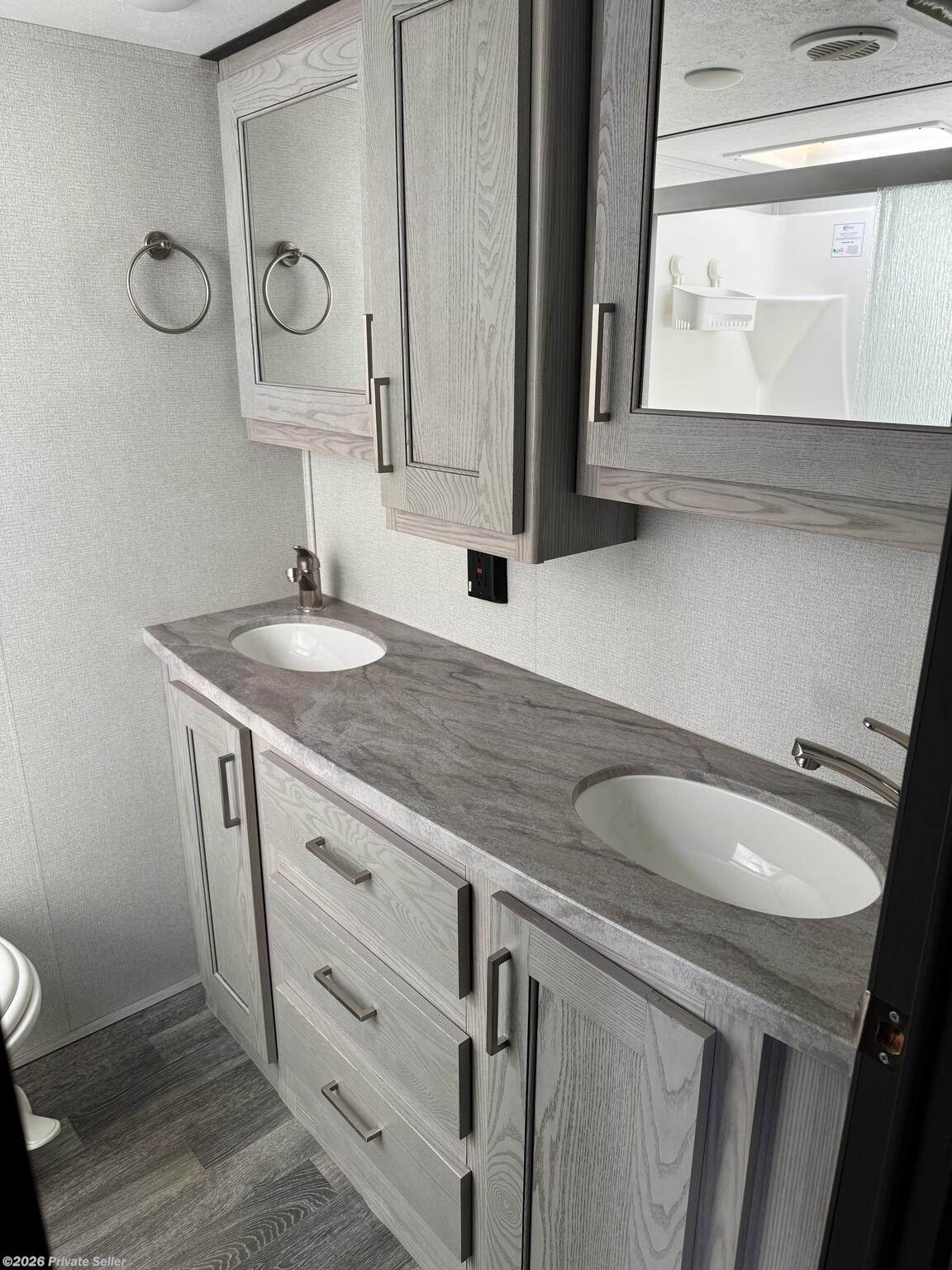A private bathroom has a spacious shower that includes a shower wand, a skylight and seat. The vanity includes double sinks with mirrored medicine cabinets and lots of storage space. Also included is a 3-door floor to ceiling linen closet, a high-profile ceramic toilet, & an exhaust fan.