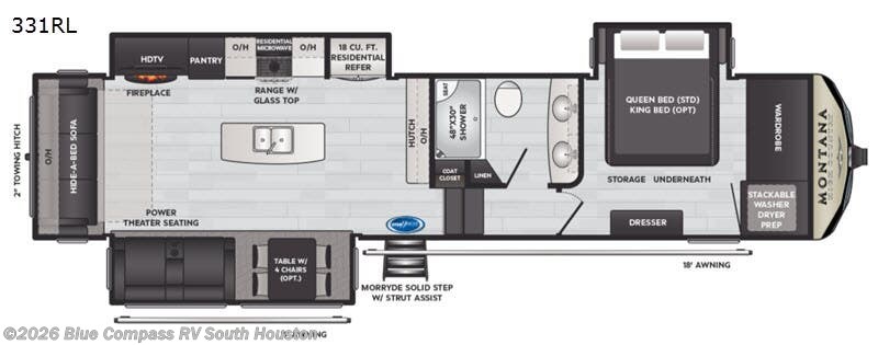 With each Montana High Country fifth wheel by Keystone you will enjoy family-friendly features, lightweight floorplans, and drop-frame construction for maximum storage. Each model is built for four season living with the heated and enclosed underbelly and the astrofoil insulated slide floors and underbelly. The Mystic Ash cabinetry, hardwood decorative slideout fascia, and accent crown molding create a luxurious fifth wheel everyone can get used to. These models include a Whisper Quiet A/C system to cool your space quietly and evenly, plus there is a 35,000 BTU furnace that will allow you to extend your camping season. The Montana High Country fifth wheels are equipped with a Road armor shock absorbing hitch pin for easy towing, and set-up will be a breeze with the Hitch Vision with LED lighting. There are many more features to love about these fifth wheels, like the MaxTurn front cap, the Solera series power awning(s), the residential appliances, and the list goes on!