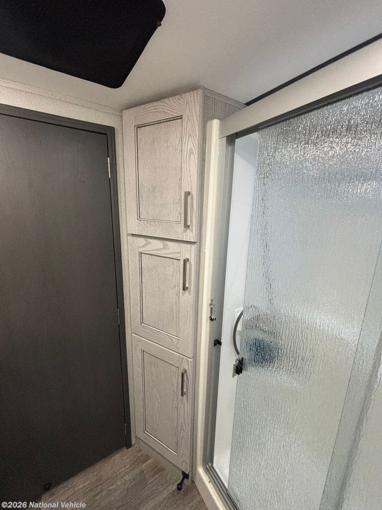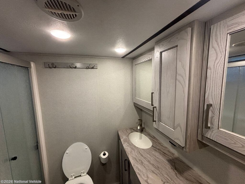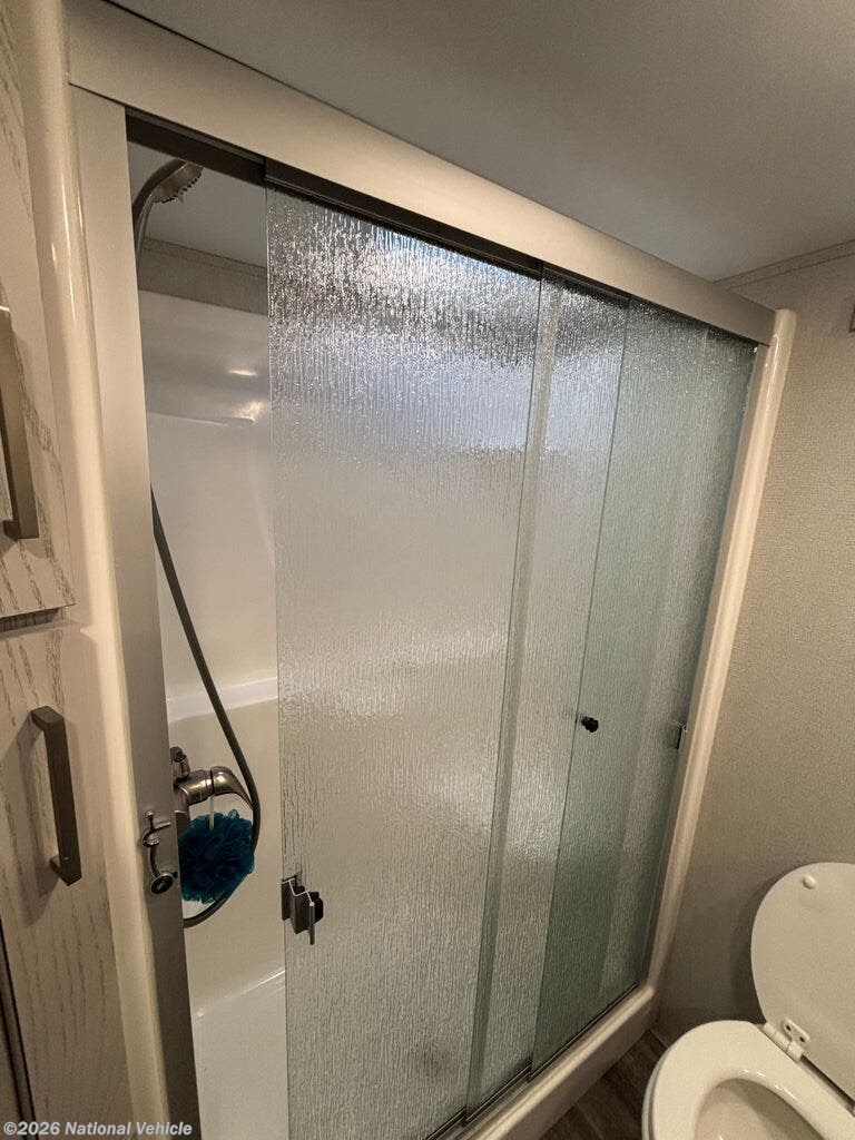 The full bathroom features residential fixtures, ample counter space, and a large shower with glass doors?bringing home-like comfort to your travels.