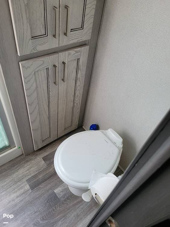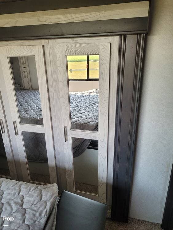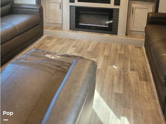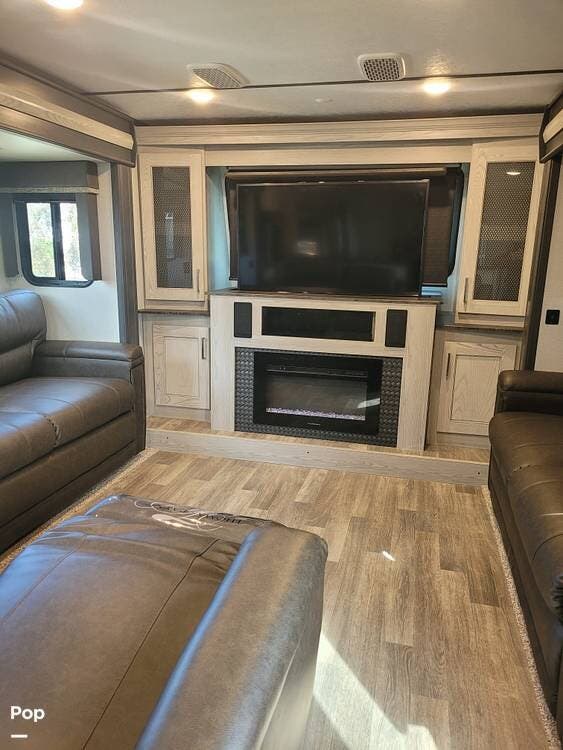 Inside, the living area welcomes you with plush seating, an entertainment center featuring a large TV, and a warm electric fireplace, creating a cozy retreat after a day on the road. Expansive windows and well-placed lighting make the space bright and inviting.