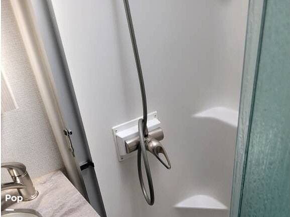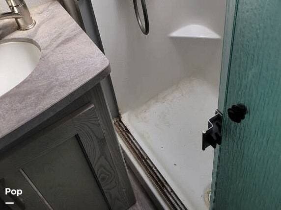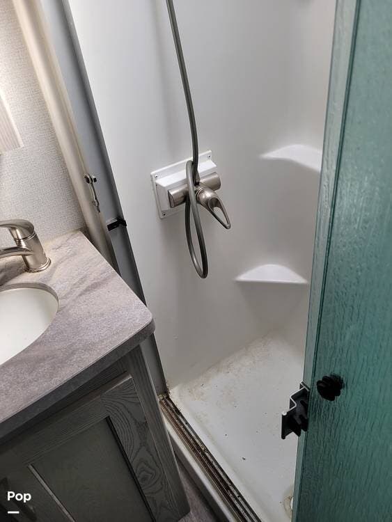 The bathroom features a power vent fan, a roomy shower with a glass enclosure, and elegant finishes to give you the feeling of home wherever you roam.