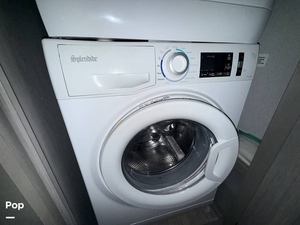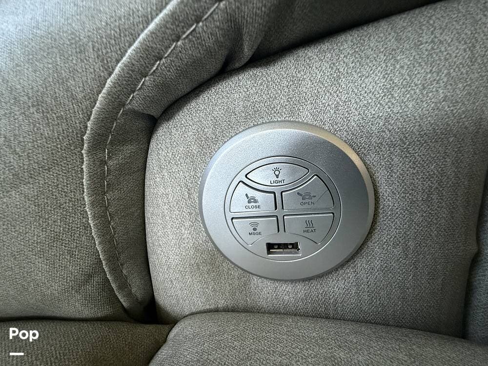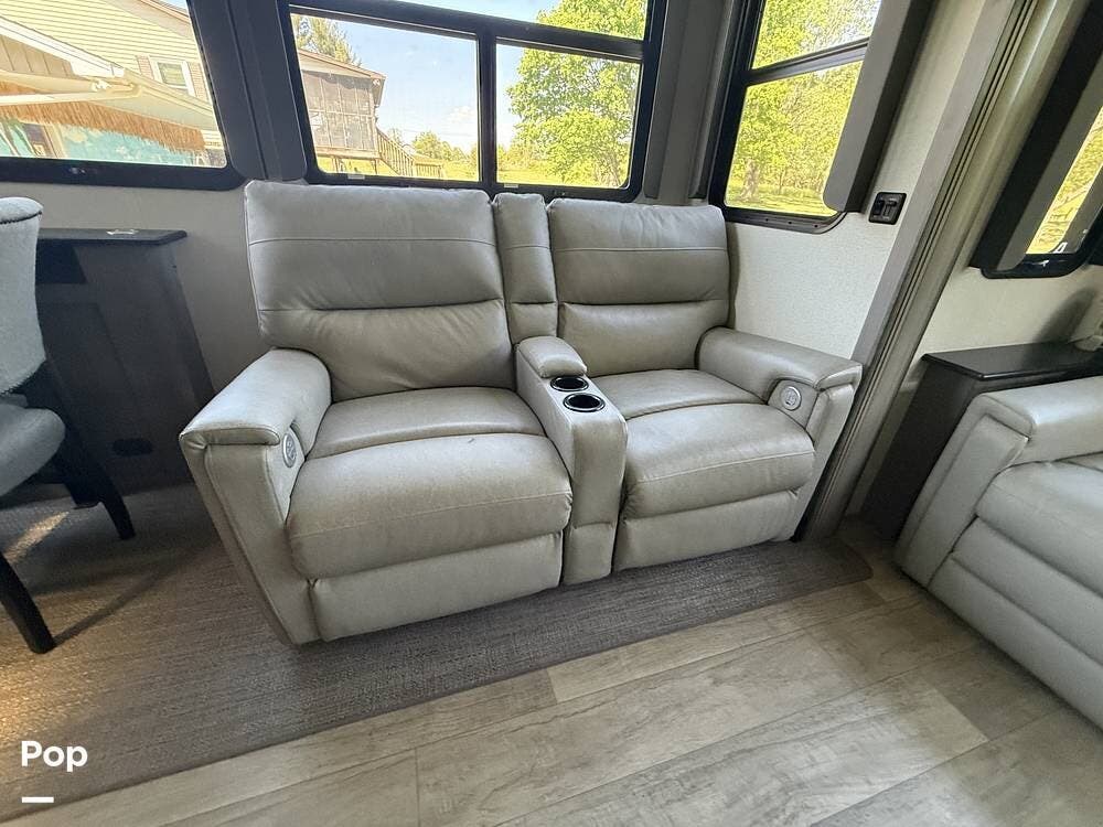 Internally, it features a separate washer and dryer, a central vacuum, a queen-size bed with under-bed storage, flat-panel TVs, a fireplace, a sleep sofa with tri-fold beds, and theater seating with electric recliners that have massage, seat warmers, USB charging ports, lighted cup holders, and a center storage console!