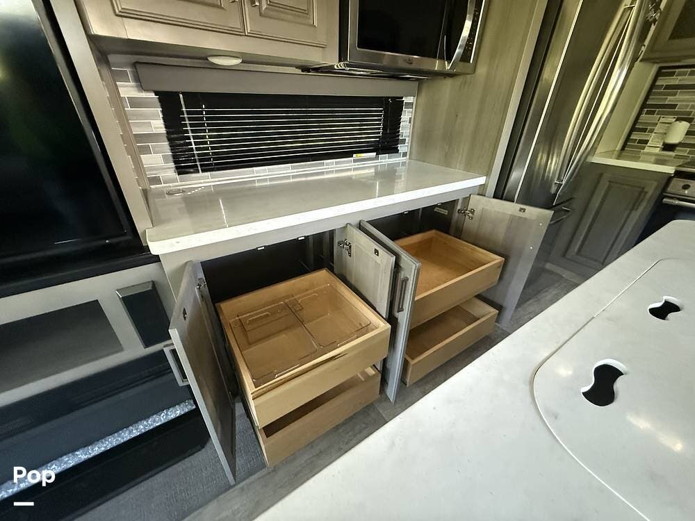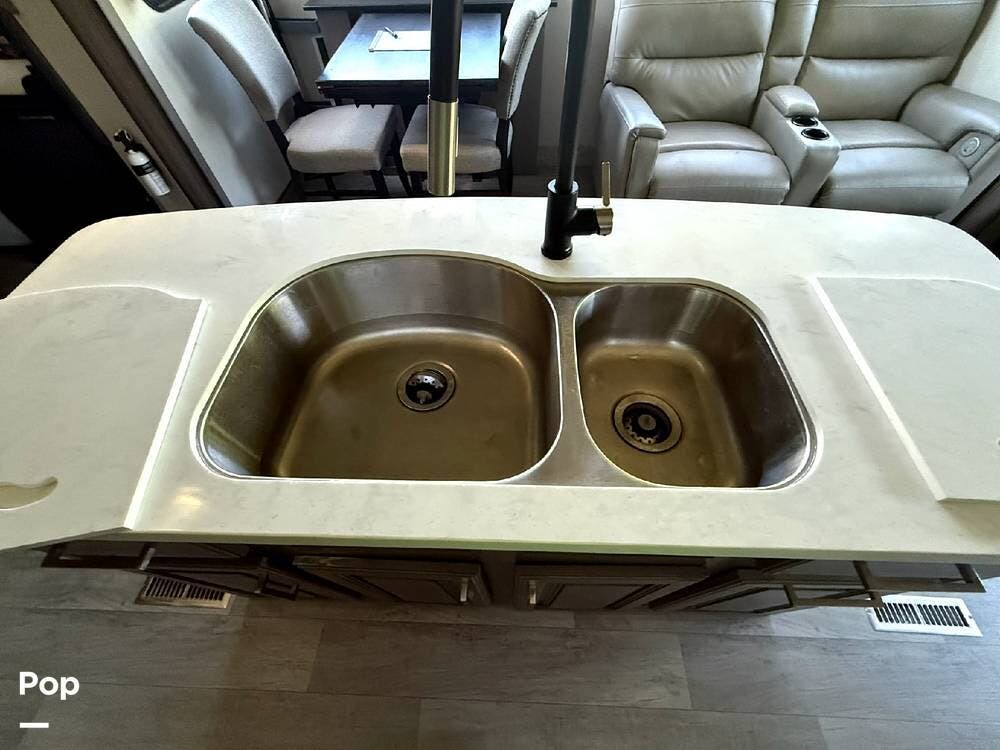 The center of the unit boasts a well-laid-out modern kitchen with stainless appliances, a residential refrigerator with ice maker and 2000-watt inverter, a kitchen island with a dual kitchen sink and solid countertops, plus a three-burner stove, and a convection microwave oven.