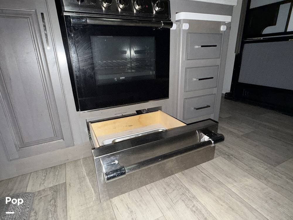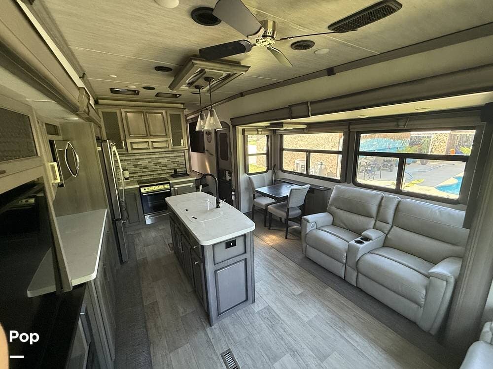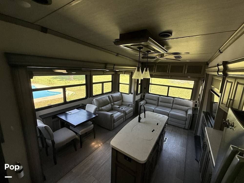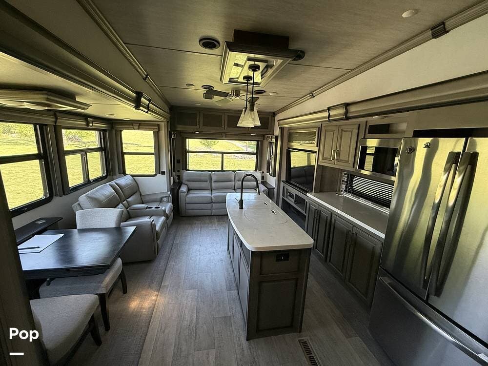 Externally, this top-of-the-line 5th Wheel by Keystone features four-season insulation, automatic hydraulic leveling, three slides with slide toppers, two awnings, exterior speakers, a roof access ladder, rear and side view cameras, and more!