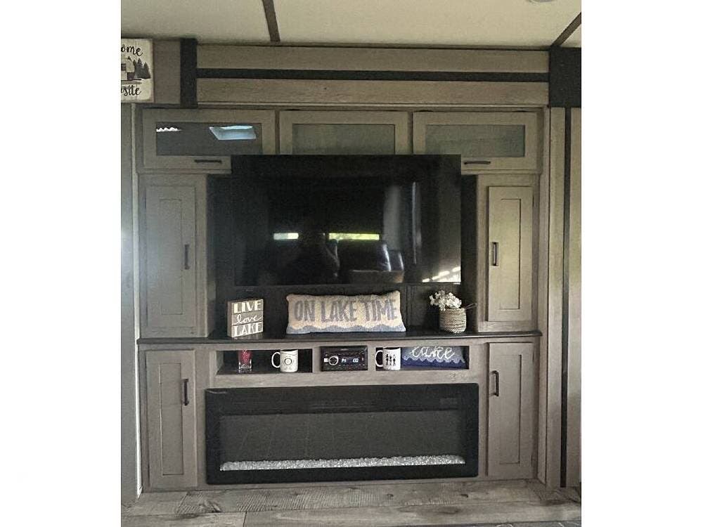 The living and kitchen areas feature a leather sleeper sofa, theater seating, an electric fireplace with remote, and a standalone table and chairs. The island kitchen boasts solid surface countertops, a refrigerator/freezer, microwave, and a 3-burner stove and oven.