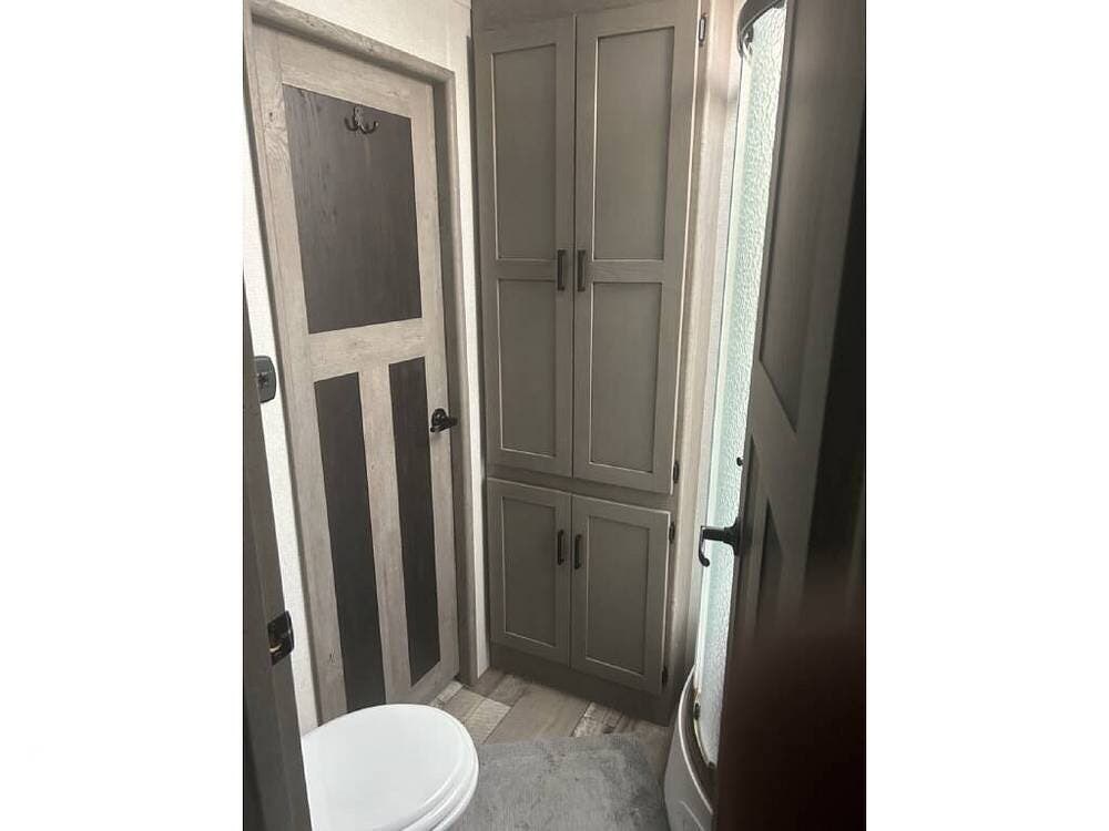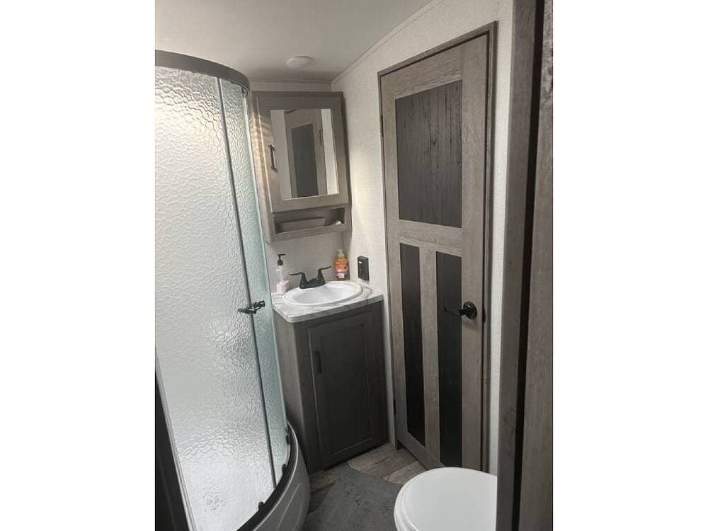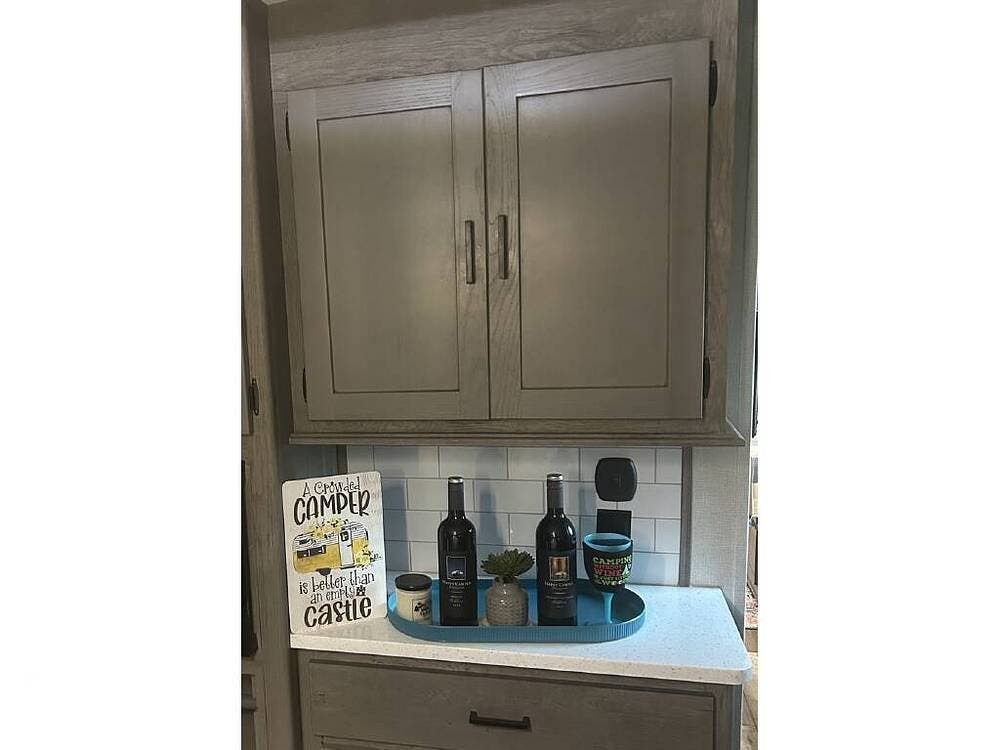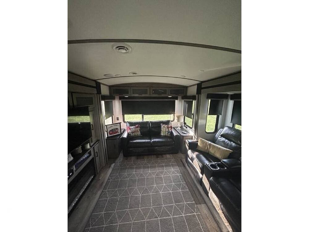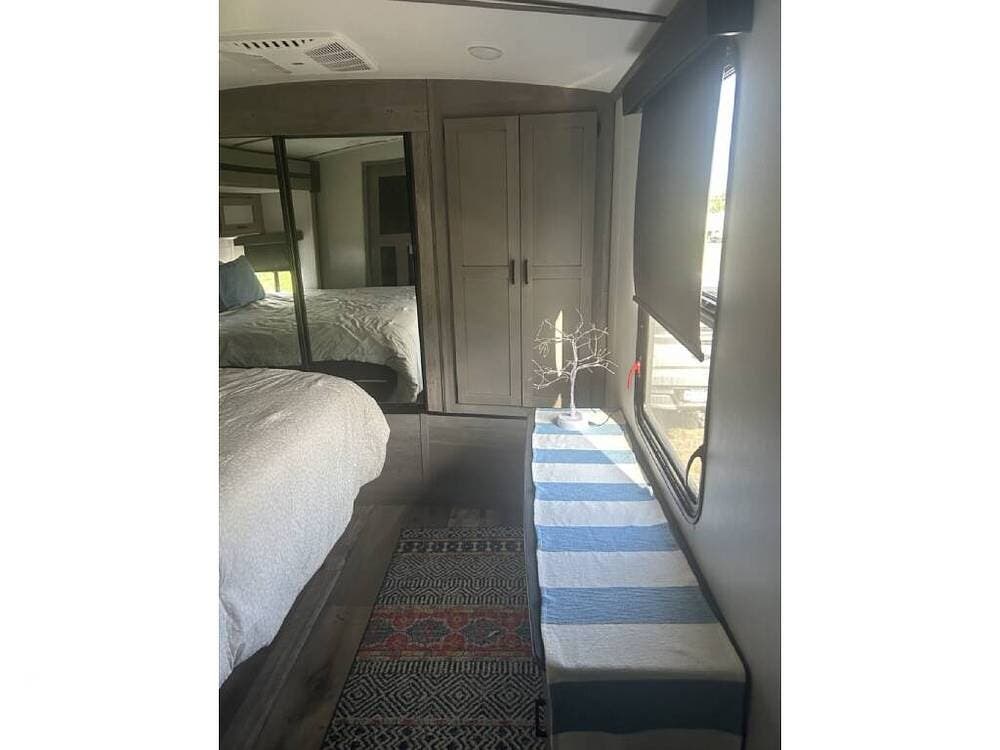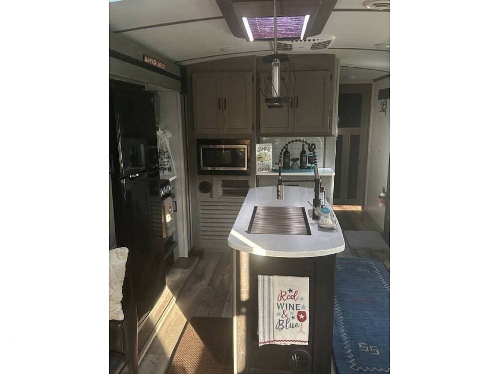 Keystone makes a nice coach, and this rear-living model is built with laminated fiberglass and aluminum framing, featuring a modern interior design with convenient storage, solid-surface countertops, farmhouse decor, and lighter features.