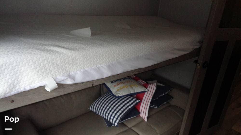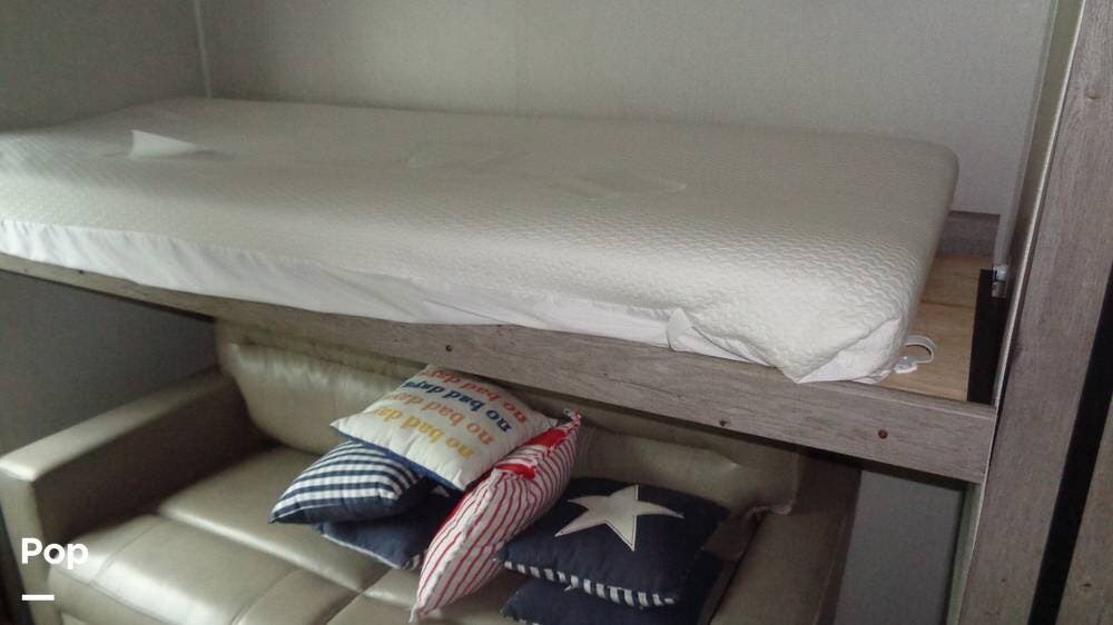 The 340BH floor plan features a dedicated bunkhouse with multiple bunks and a sleeper sofa, providing a cozy retreat for kids or additional guests.