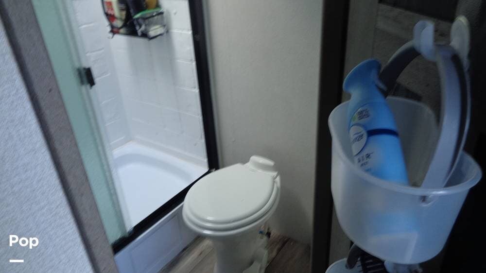 The full bathroom includes a big shower, toilet, and sink, ensuring comfort and convenience on your travels.
