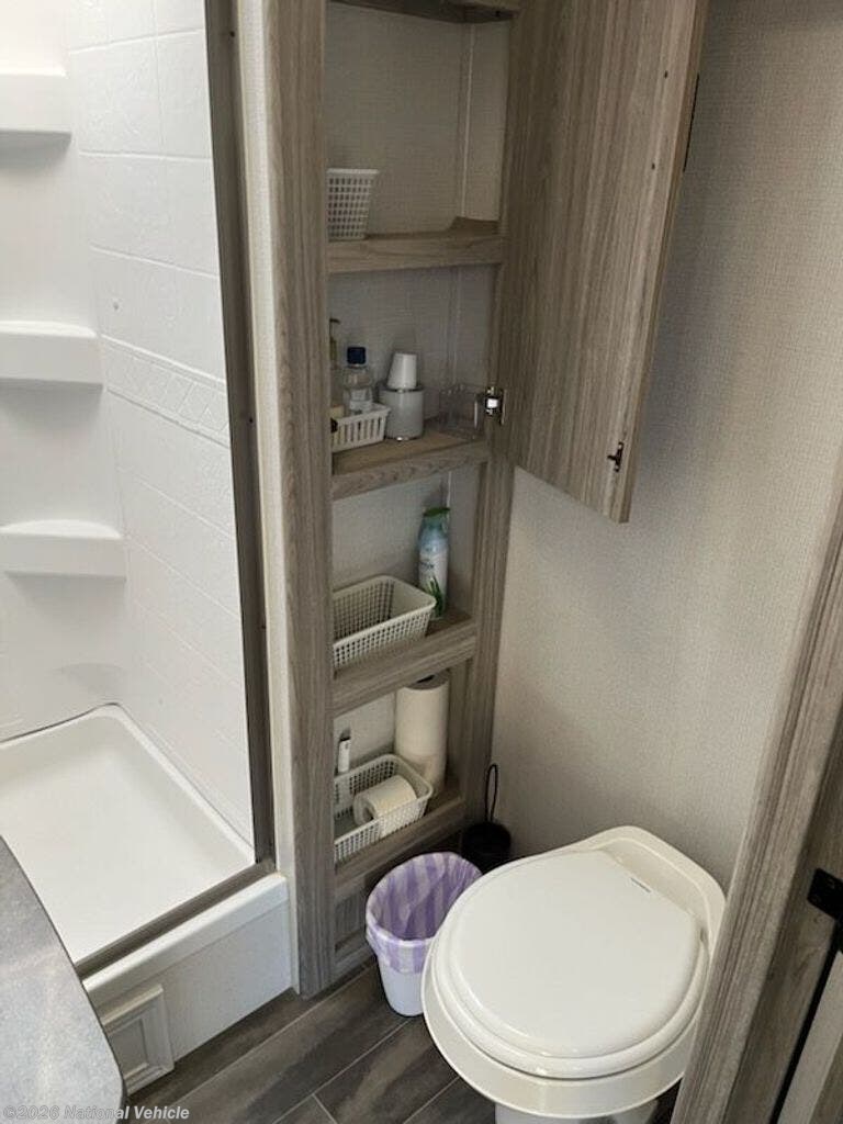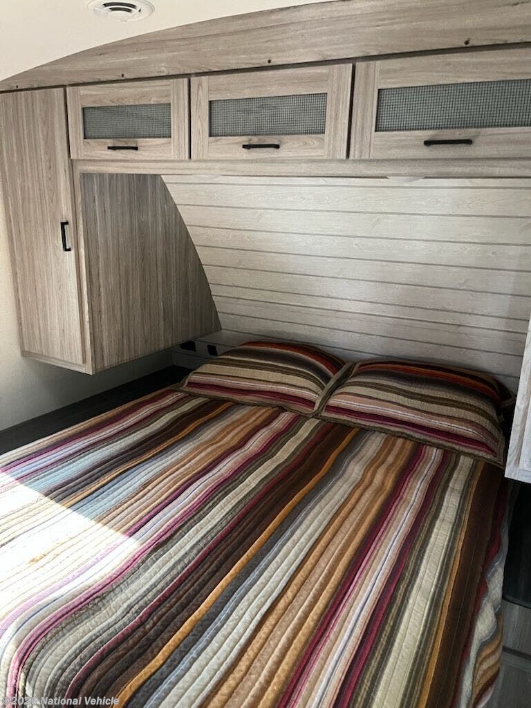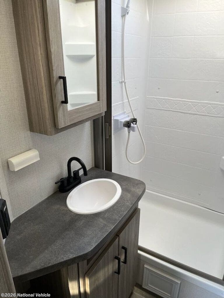 Comfortable sleeping accommodations include a private master bedroom with a cozy queen bed and ample storage, while convertible seating and optional sleeping spaces provide flexibility for family or guests. The full bath offers a convenient and clean space to refresh on the road.