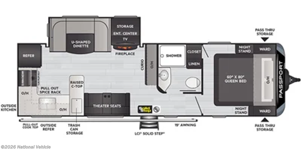 Built with smart storage throughout, the Passport GT 2704RK keeps gear organized and accessible, while exterior conveniences like pass-through storage and a power awning with LED lighting extend your living space outdoors. Quality construction and easy-towing design make this trailer a joy to hook up and go.