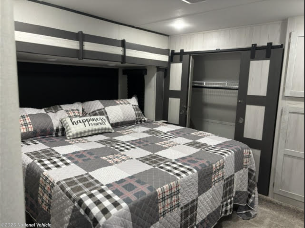 Outside, enjoy the convenience of an exterior refrigerator, ideal for entertaining, tailgating, or relaxing evenings under the awning. The RV rides confidently on newer tires, offering peace of mind and readiness for the road ahead.