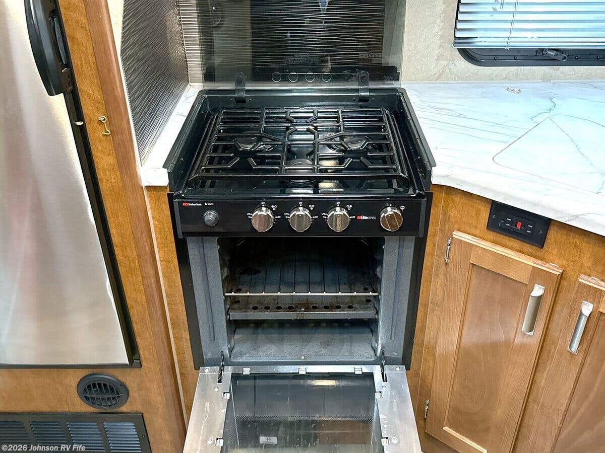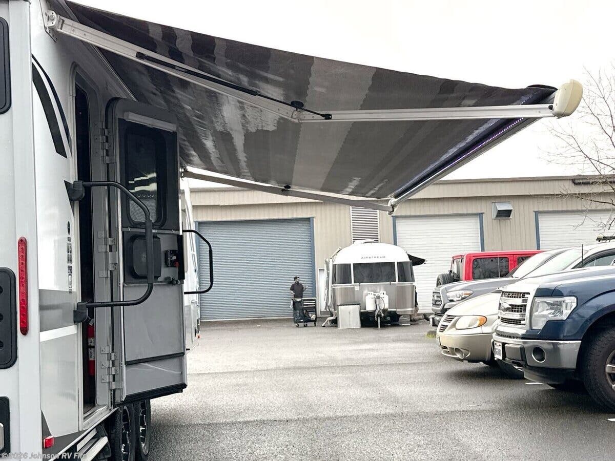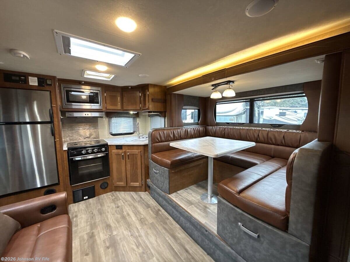 Features Include: Keyless Entry, Euro Entry Door, LED Mood Lights, Window Screen Shade, Overhead Cabinets, Dinette Skylight, 21-inch Oven, Microwave Oven, Systems Center, Thermostat, USB 110v 12v Ports, HD TV Antenna, Sleeping, Shower Miser System, 25k Furnace, Truma Aventa 15k AC, On Demand Water Pump, Black Tank Flush, Road Armor Equalizer, Aluminum Wheels, TPO Gravel Guard, Crowned Walk-On Roof, Phat Ladder, Enclosed Underbelly, Toy Lock