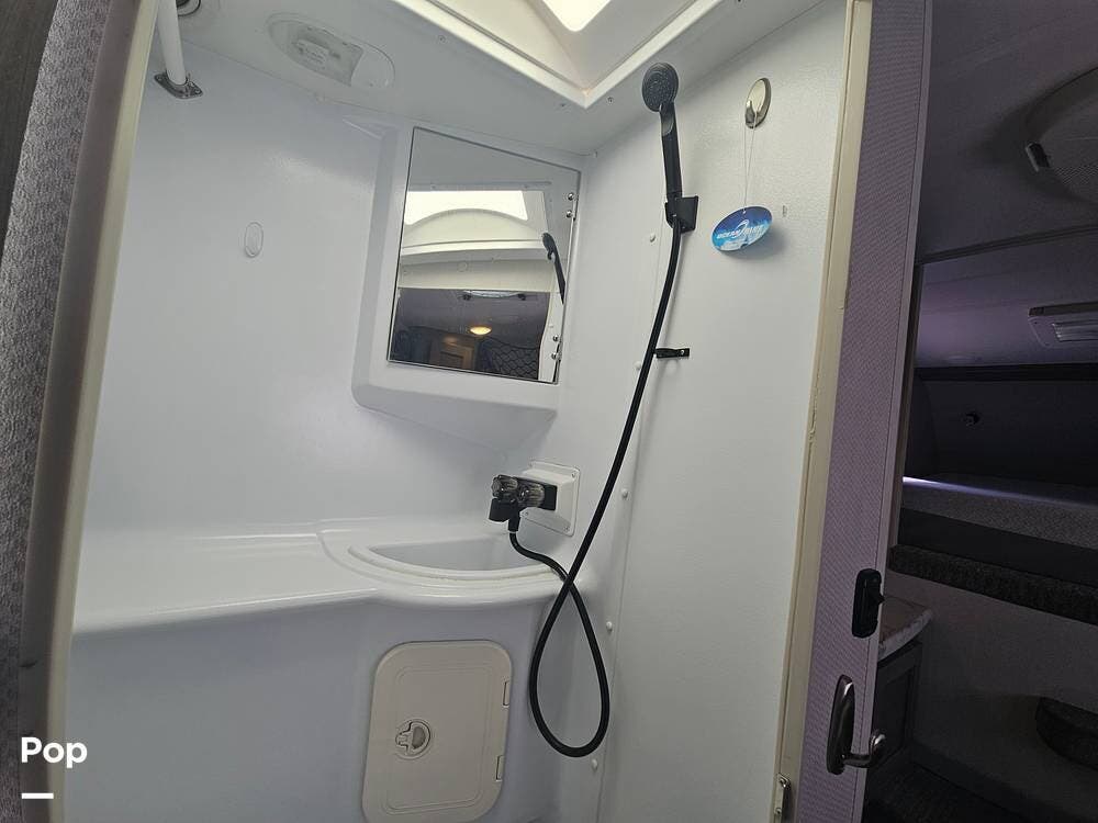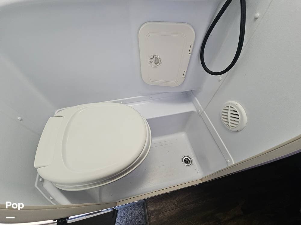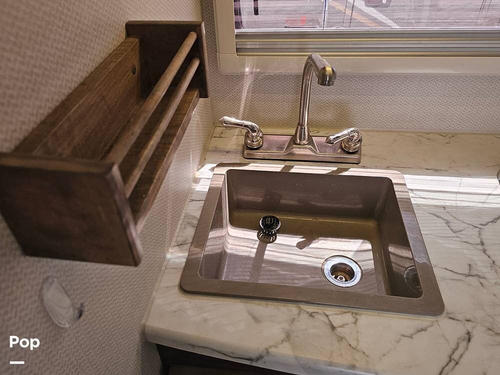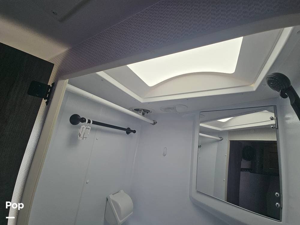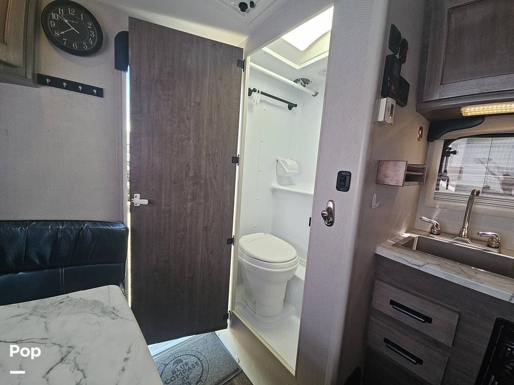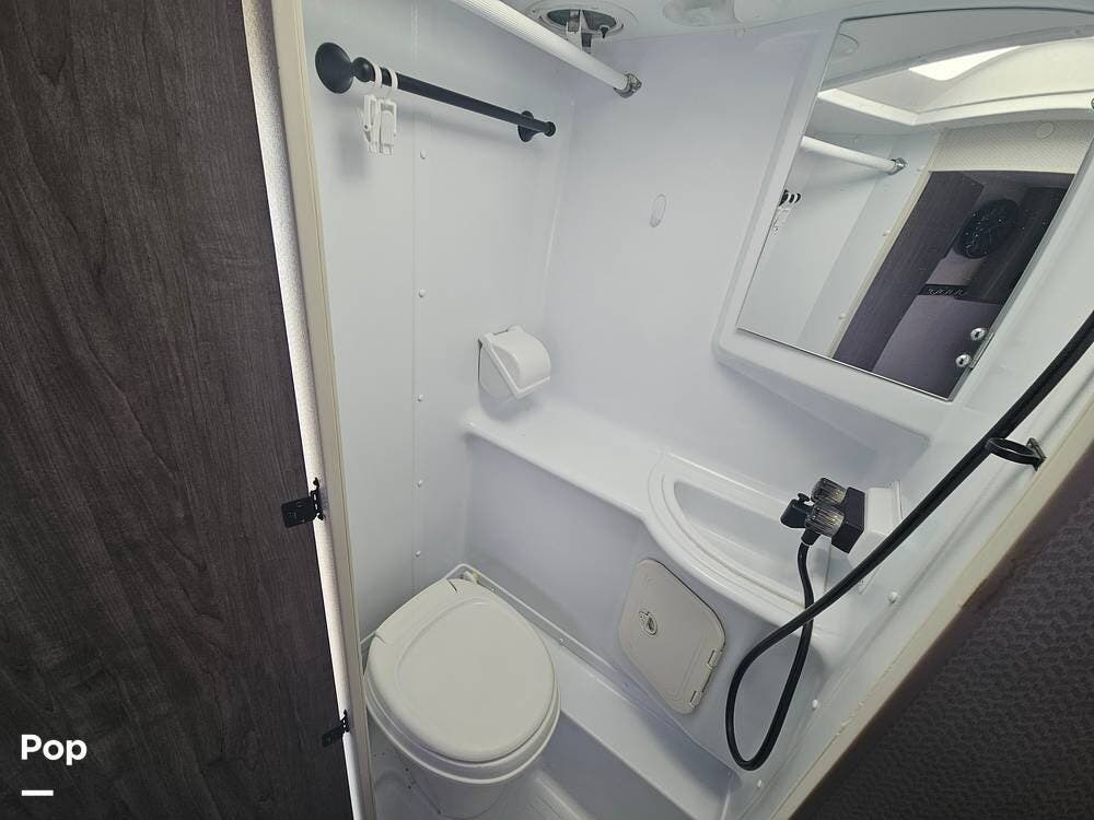 The camper has a full bathroom with a toilet and shower. The interior is thoughtfully designed with high-quality materials, LED lighting, and ample storage compartments.