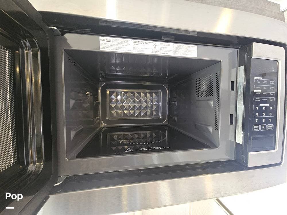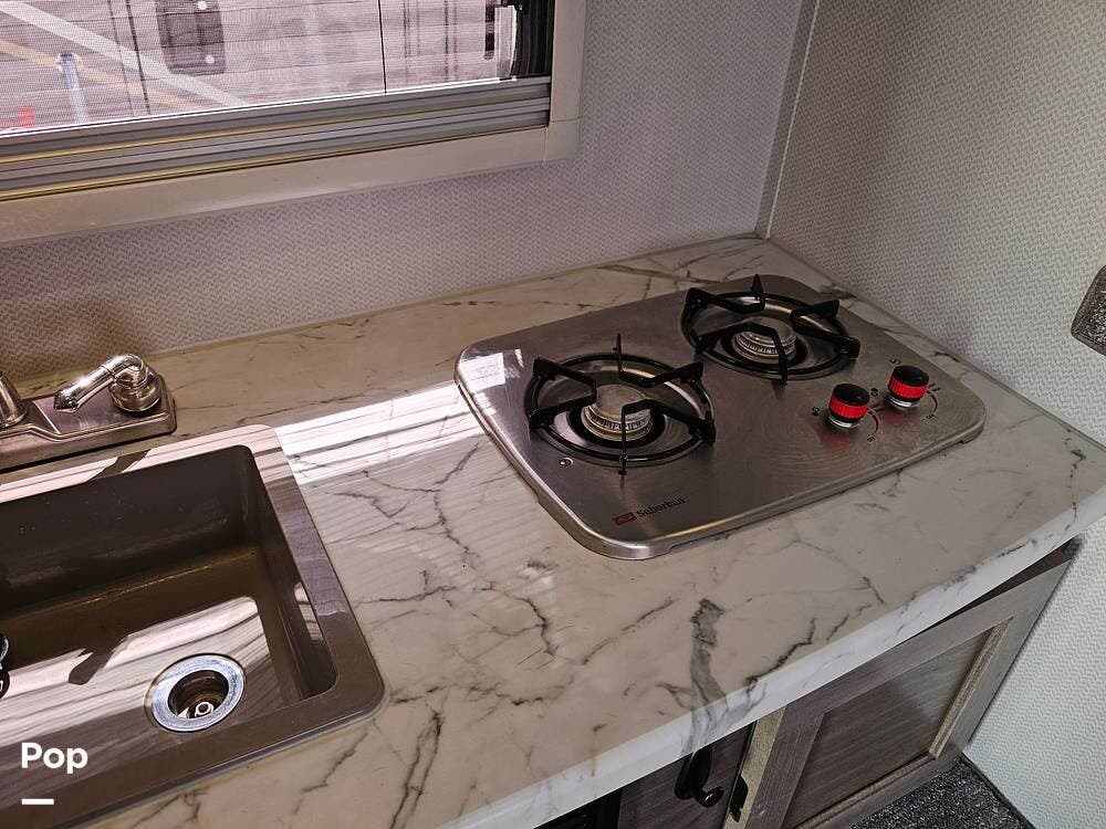 Standard features include a fully equipped kitchen with a refrigerator, convection microwave, and a two-burner stove, along with a comfortable dinette that converts into additional sleeping space.