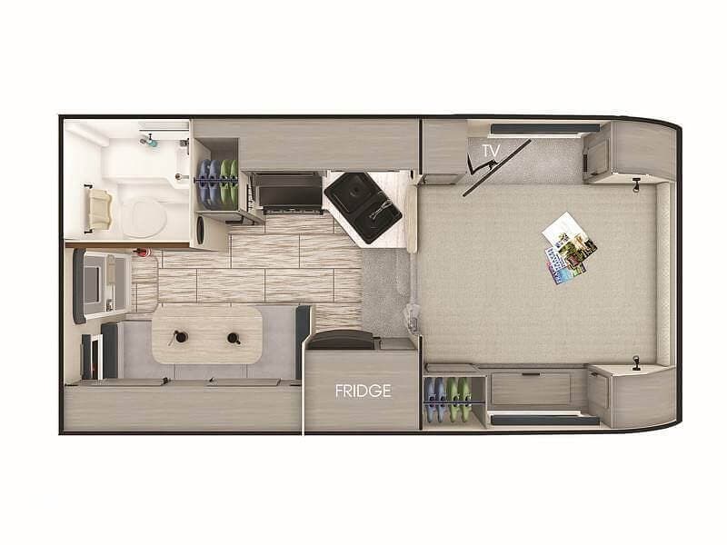 There is a large u-shaped dining area, that drops down to make an additional bed. The bathroom has a sink, mirror, toilet and hand held shower head.