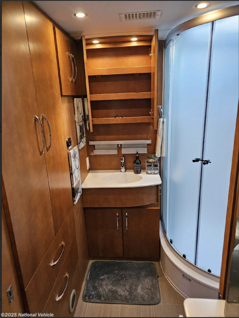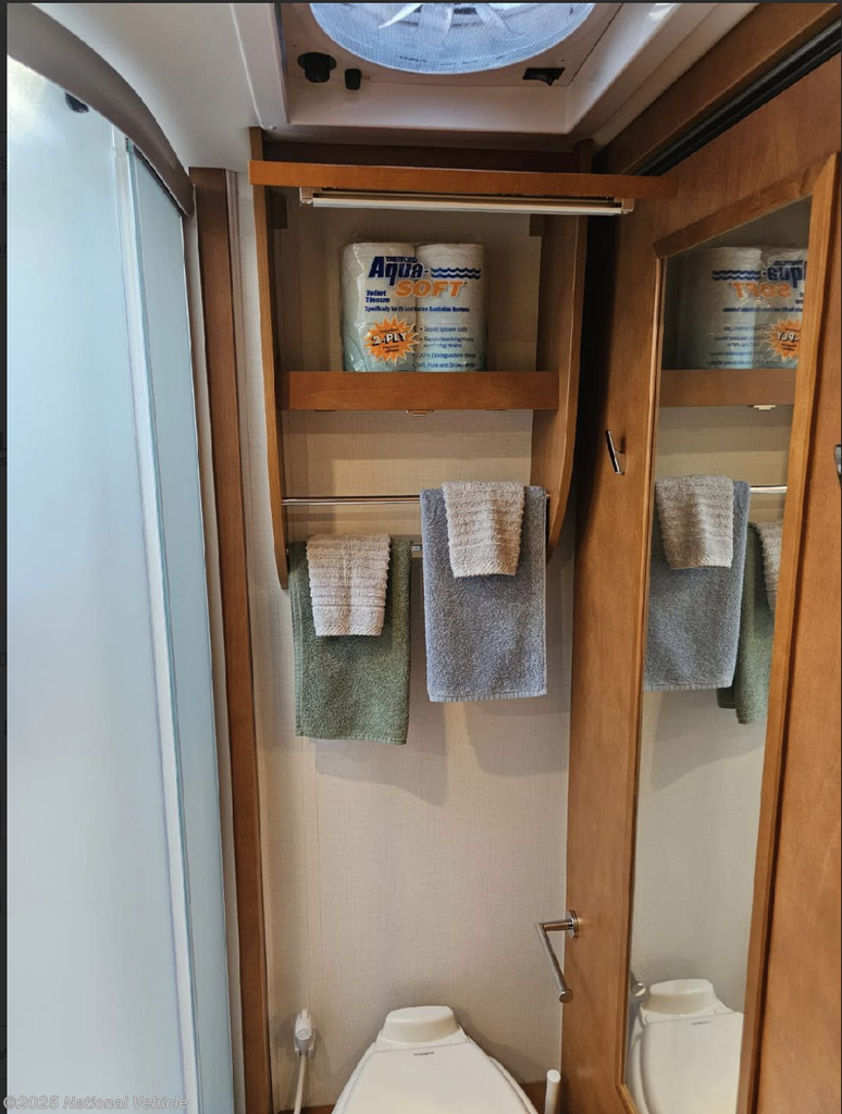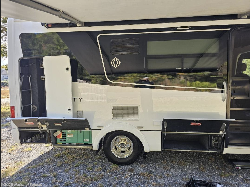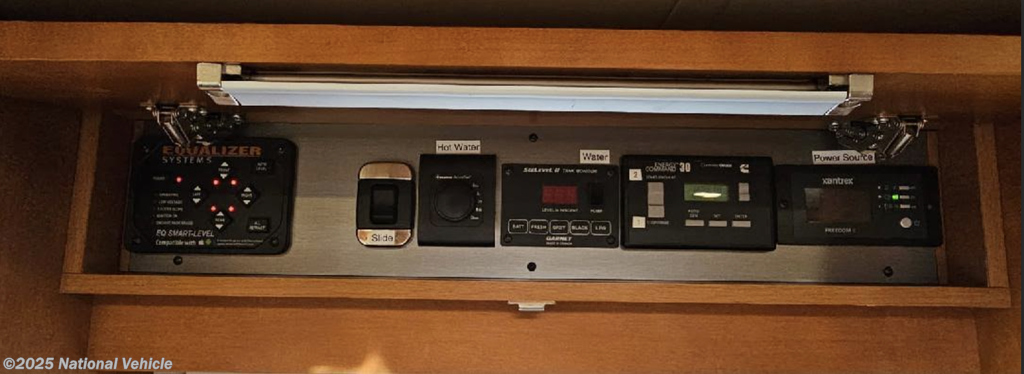 Inside, you?ll find an elegantly designed and functional layout featuring a king-size Murphy bed, two power reclining lounge chairs, a spacious bathroom with shower, and a porcelain macerator toilet. The well-equipped kitchen and dinette offer all the comforts of home, including a refrigerator, ample storage, and beautiful finishes throughout.