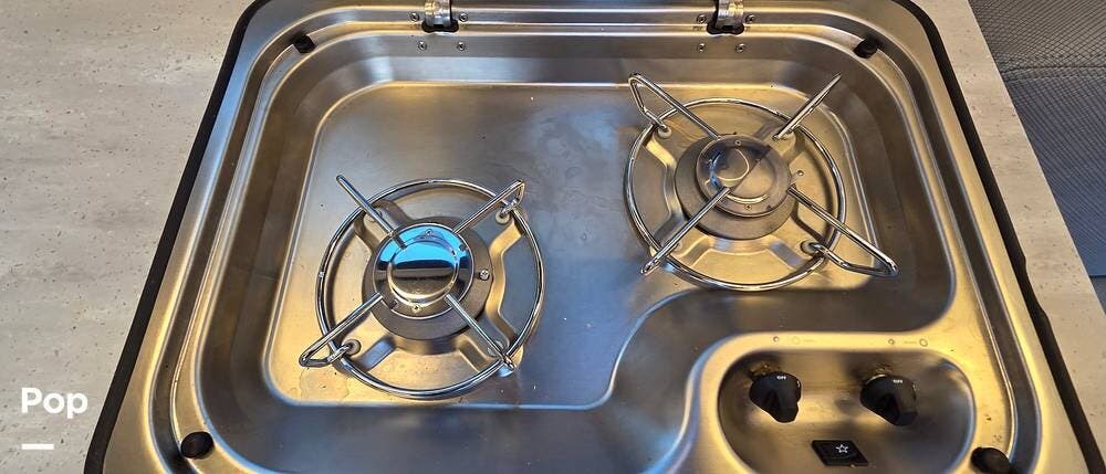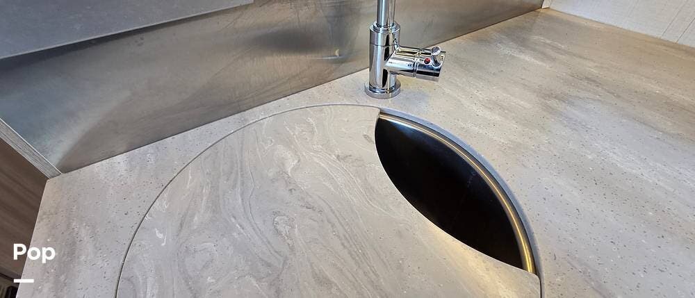 The kitchen features a complete setup, including a two-burner cooktop, convection microwave, deep stainless sink, and plenty of pantry and cabinet storage--everything you need for cooking on the go.