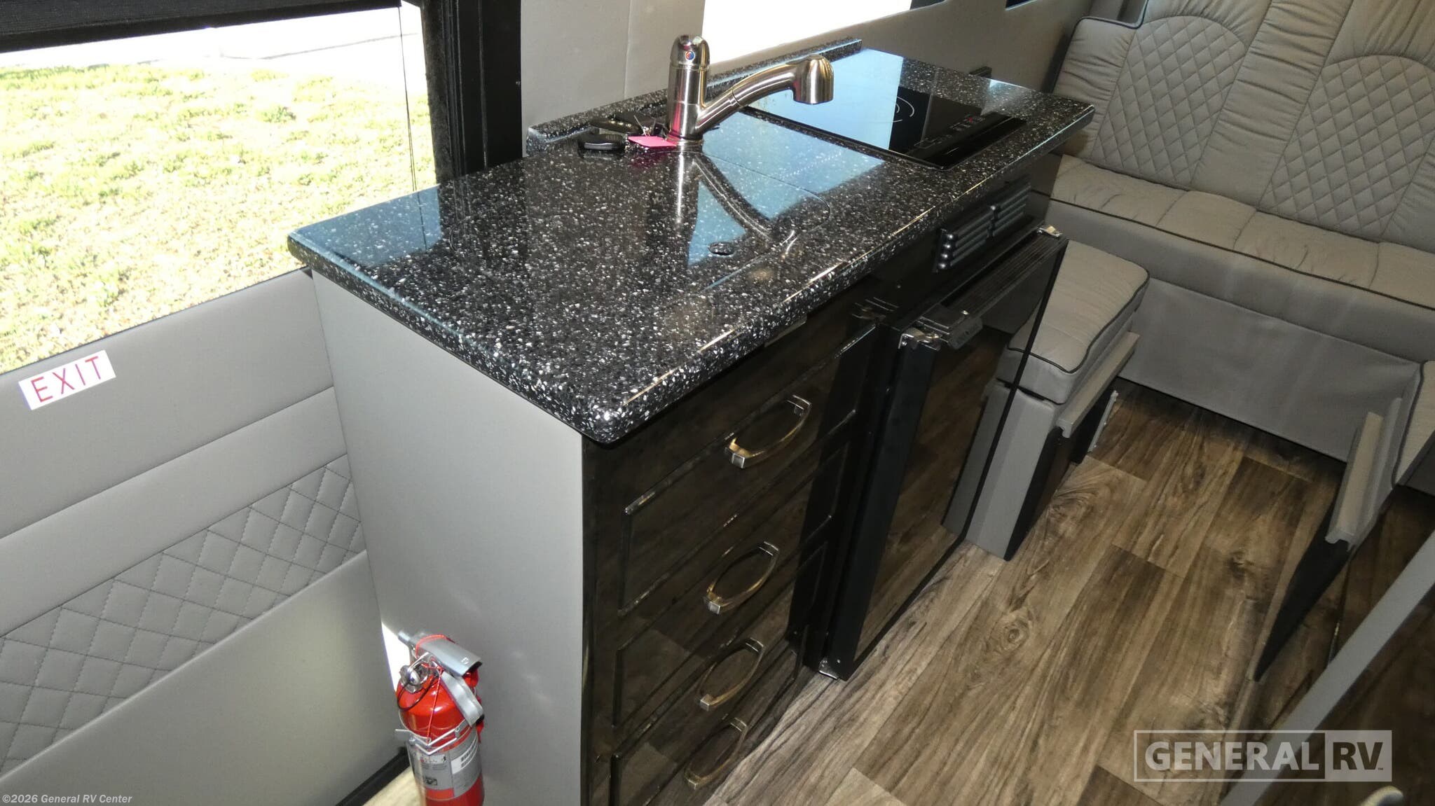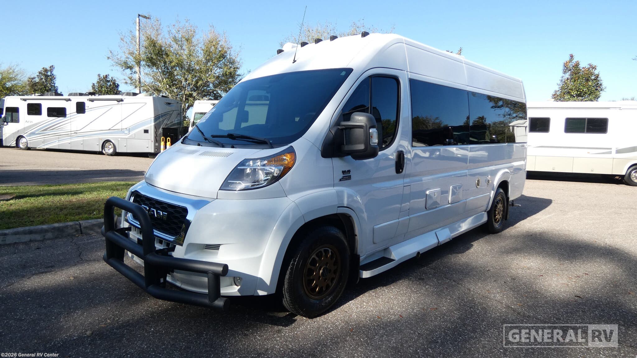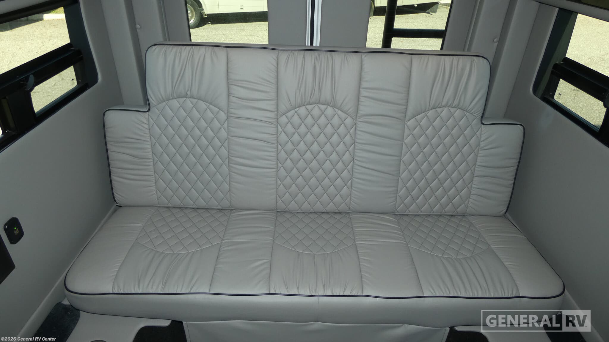 Midwest Automotive Designs Legend Class B gas motorhome FSL highlights: Power Lounge Sofa Two Captain's Chairs Dual Side Sofas Wardrobe Wet Bath Exterior Shower Start traveling like you are driving an SUV yet you will have your own bedding for two to three people once the rear power lounge is set up with the two side sofas for the night. You can watch a movie using the Blue Ray DVD/CD player on the HD LED TV when you wake up before making breakfast in the stainless steel convection microwave or on the induction cooktop. You might like to grab a snack from the overhead cabinets instead. And the removable table/dinette will allow you to eat a meal or do some work while sitting comfortably on the leather seating. There is a mid-coach wet bath to stay refreshed and ready for whatever you decide to do next! Each Legend Class B gas motorhome by Midwest Automotive Designs offers a Ram ProMaster chassis, a ECO chassis battery charging system, a 100 watt rooftop solar charging system, a rear hitch with a wiring package if you need to pull a trailer or such, and a rear back-up camera system for easy parking. Inside you can ride and stay in luxury on leather seating while appreciating the custom dash and door handle wood grain upgrade, the custom Maybach style seating with seat belts, and the kitchen amenities to make warm meals. Start traveling today in your own Legend!