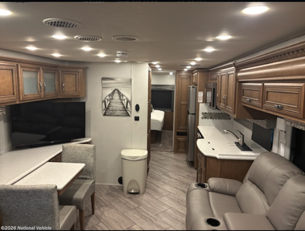 It is a couple coach, with theater seats, convection microwave, kingsize mattress, 2 slide topper, LED's, 40in x 30 in shower, lots of storage inside and outside, will row 5k lbs, it has a gas engine and is 33ft long. Newer Michelin tires (2023).