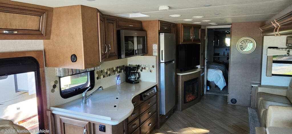 The kitchen is fully equipped with solid-surface countertops, a residential-style refrigerator, microwave, oven, and plenty of cabinet storage, making it easy to prepare meals on the road.