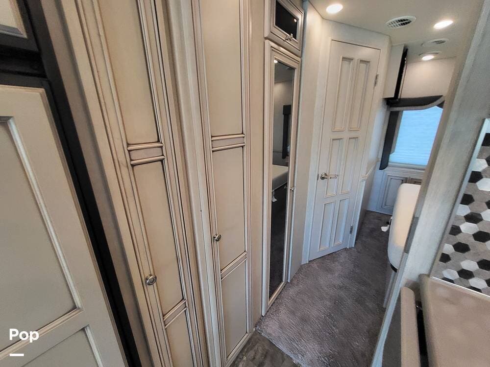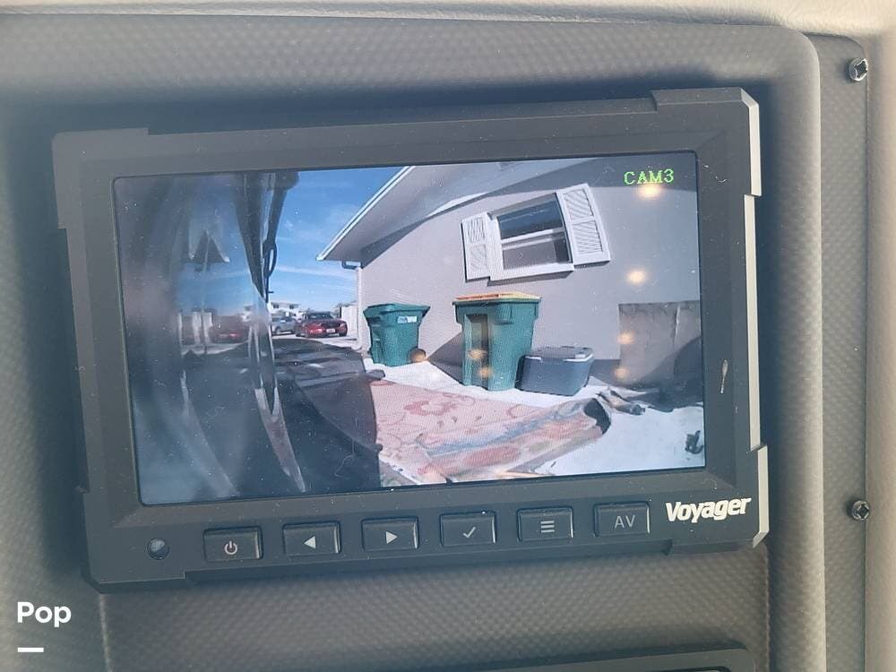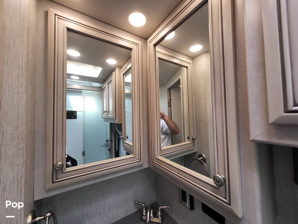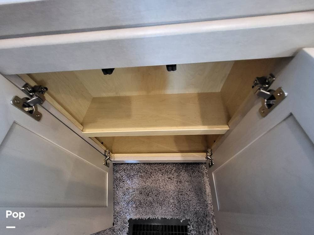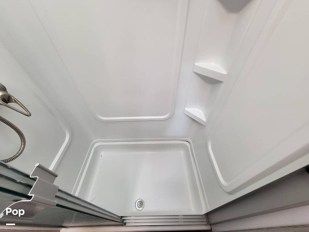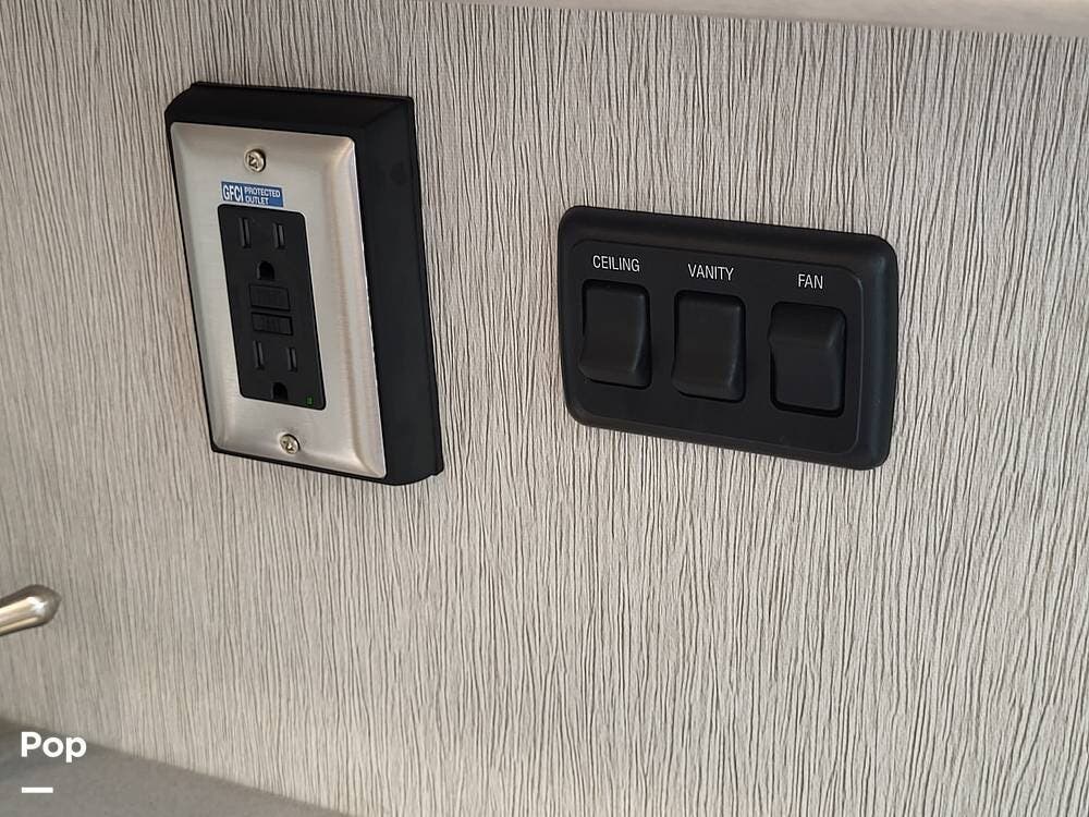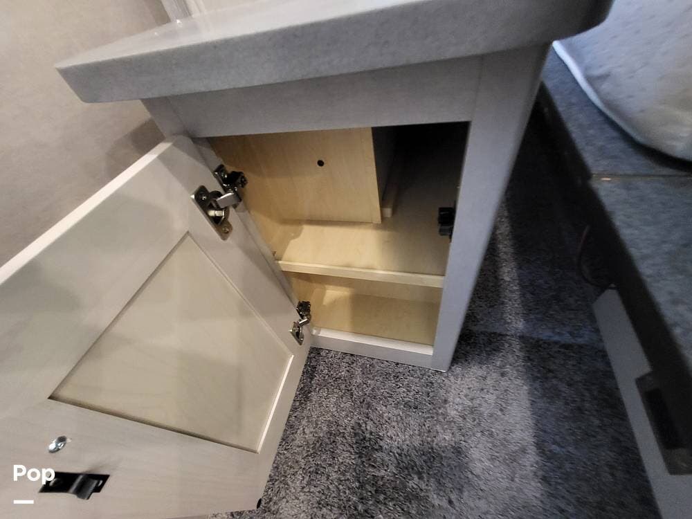 The private bedroom offers a relaxing retreat with a queen bed, an expansive wardrobe, and a mounted TV for added comfort. A spacious bathroom completes the interior, boasting a large shower, sink, and medicine cabinet--bringing the comforts of home along for the ride.