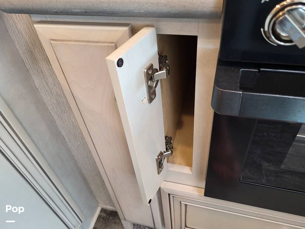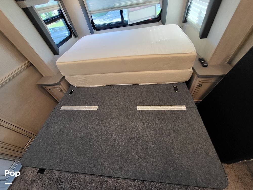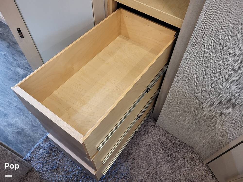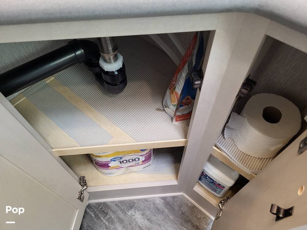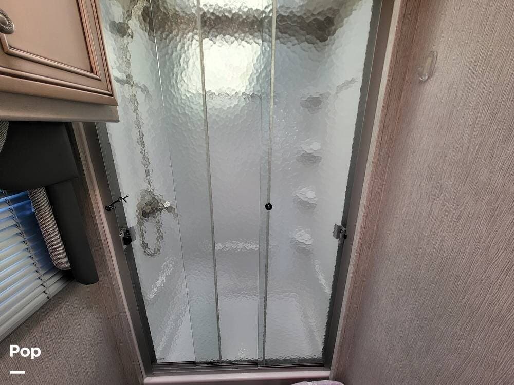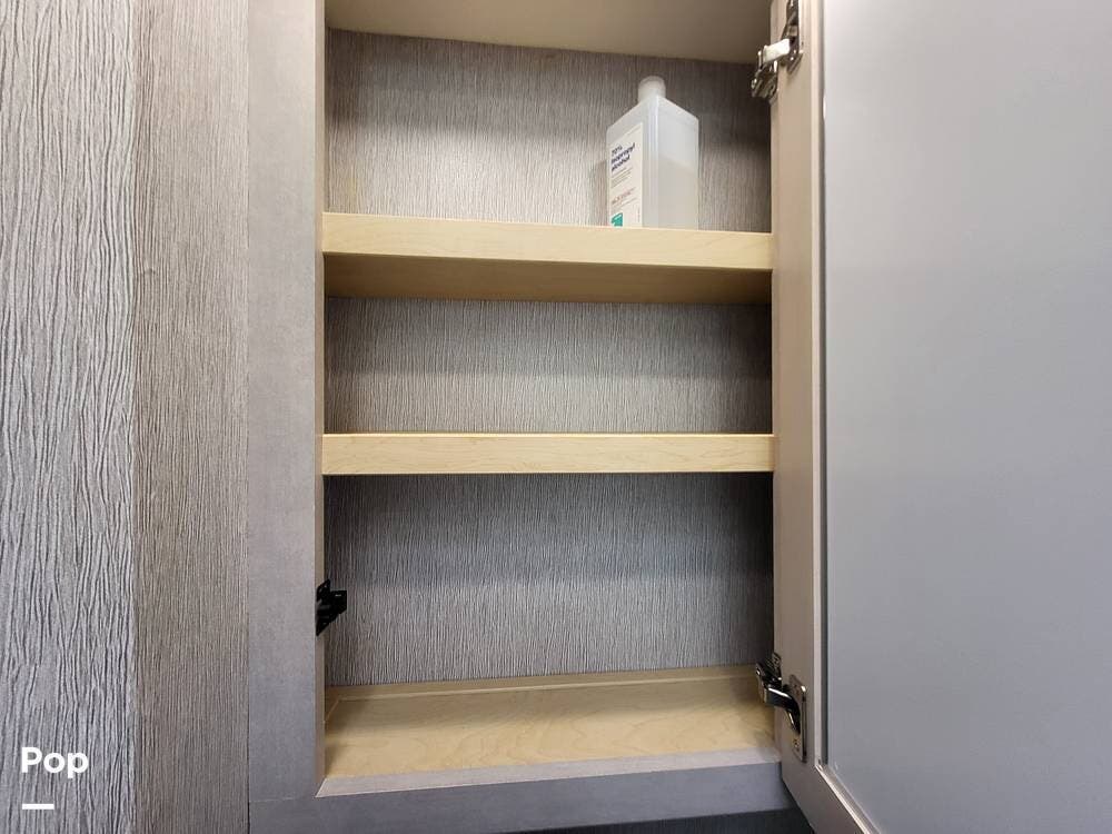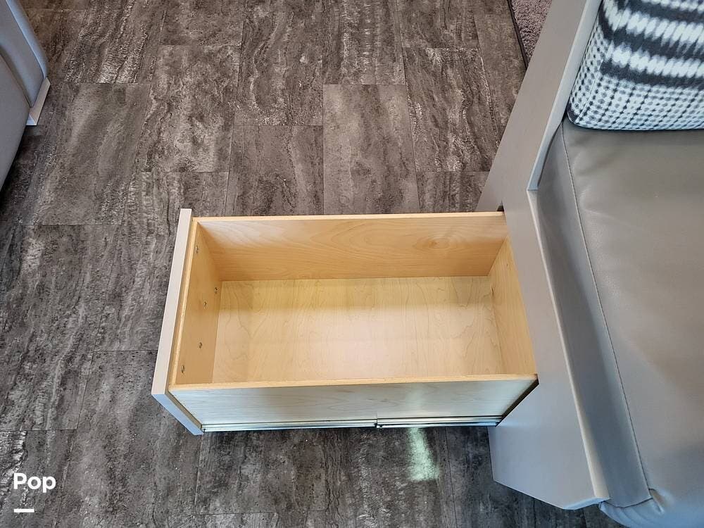 The private bedroom offers a relaxing retreat with a queen bed, an expansive wardrobe, and a mounted TV for added comfort. A spacious bathroom completes the interior, boasting a large shower, sink, and medicine cabinet--bringing the comforts of home along for the ride.