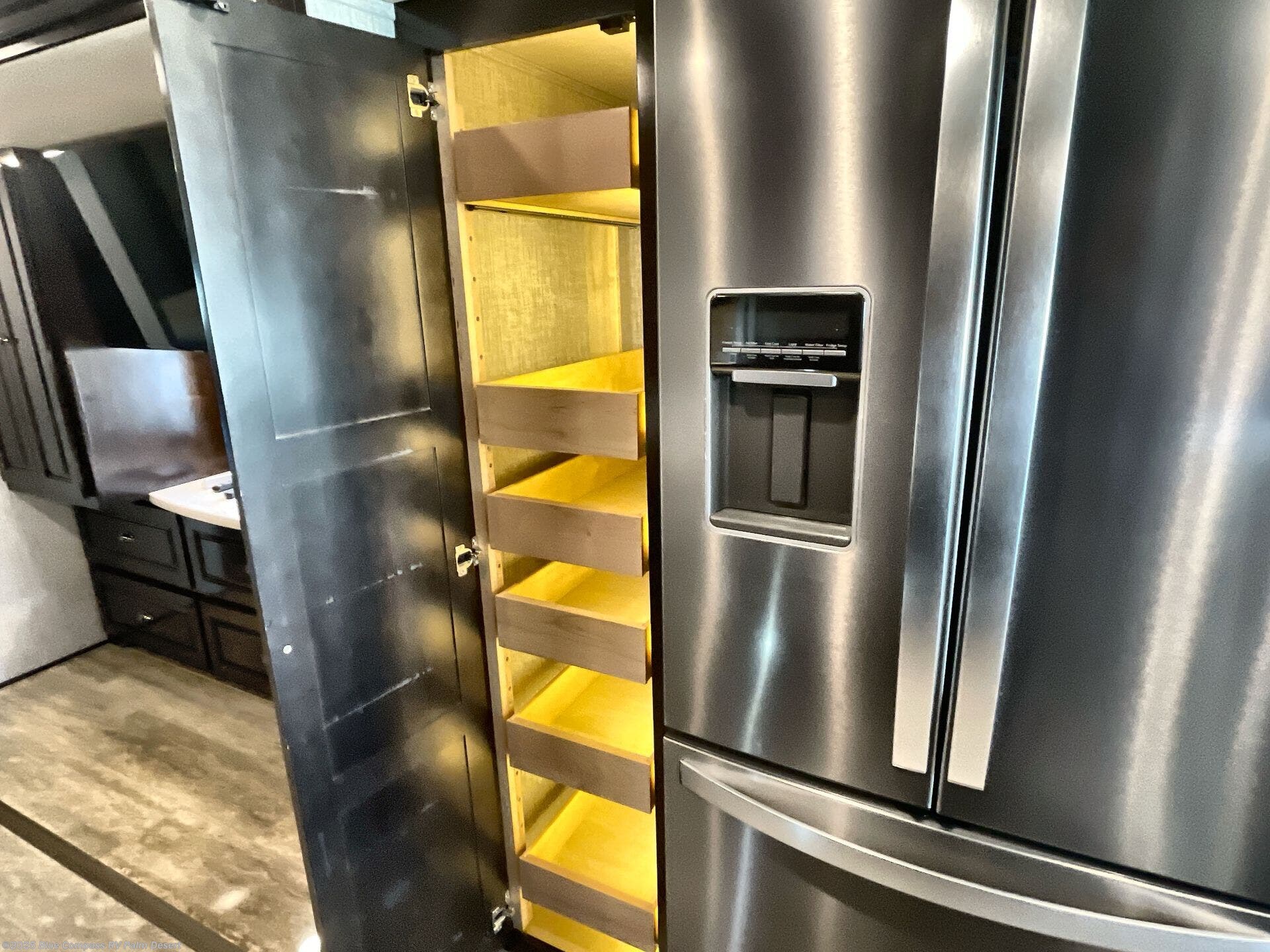 Luxury is waiting for you in this spacious motorhome that can comfortably sleep five each night. The full-wall slide plus two additional slides will open up the whole unit for a more at-home feel. Relax on the hide-a-bed sofa with two ottomans or read a book on the jack-knife sofa. The passenger workstation or hide-a-leaf dinette will be the perfect place to catch up on some work while you're away from home. Easily prepare breakfast, lunch, and dinner on the three burner recessed gas cooktop, or use the convenient stainless steel convection microwave. This model features a master bedroom with a slide out pillow top king bed, dual wardrobes and a dresser, plus a 4K LED TV. You will love the rear bath cathedral ceiling that will add additional height, plus there is plenty of storage space and two bath sinks so you and your spouse can freshen up at once!