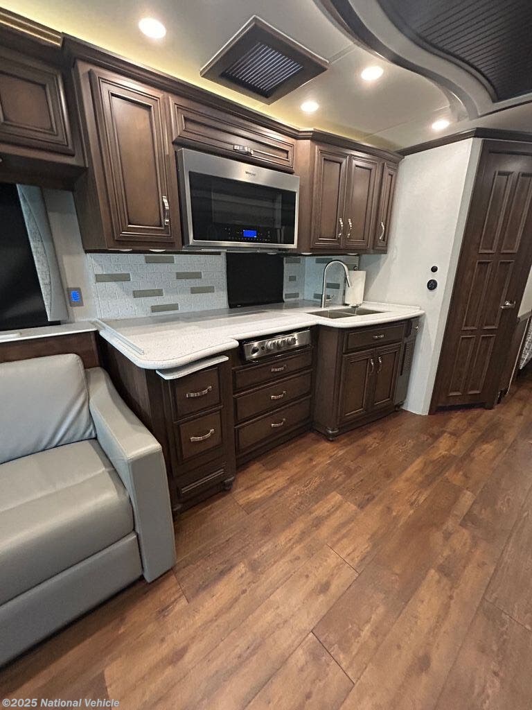 Step inside to a spacious, open-concept interior featuring multiple slide-outs that expand the living and dining areas. The living room is thoughtfully designed with plush seating, theater-style recliners, and a premium entertainment center with TV, creating the perfect space for relaxing after a day of travel. The fully equipped gourmet kitchen boasts solid-surface countertops, residential-grade appliances, a convection microwave, a three-burner cooktop, and ample storage, allowing you to prepare meals with ease while on the road.