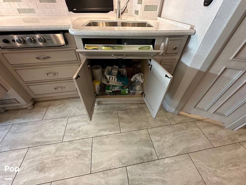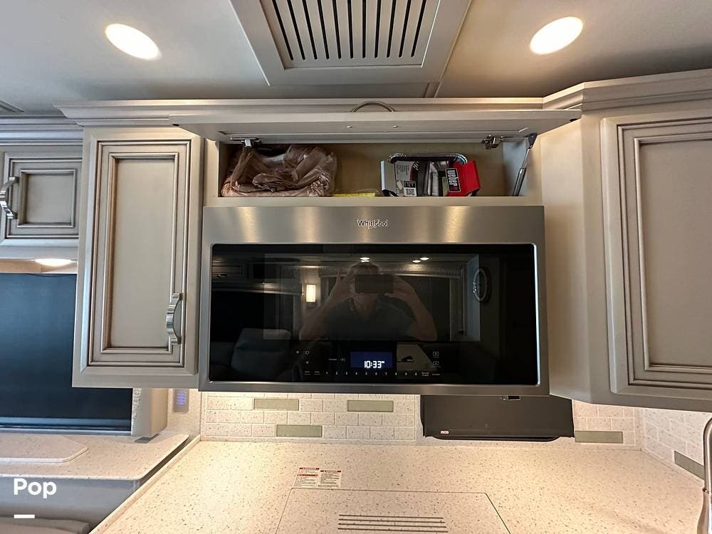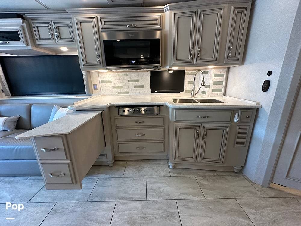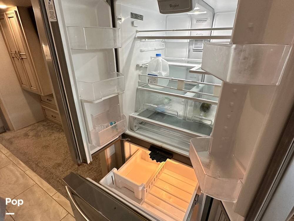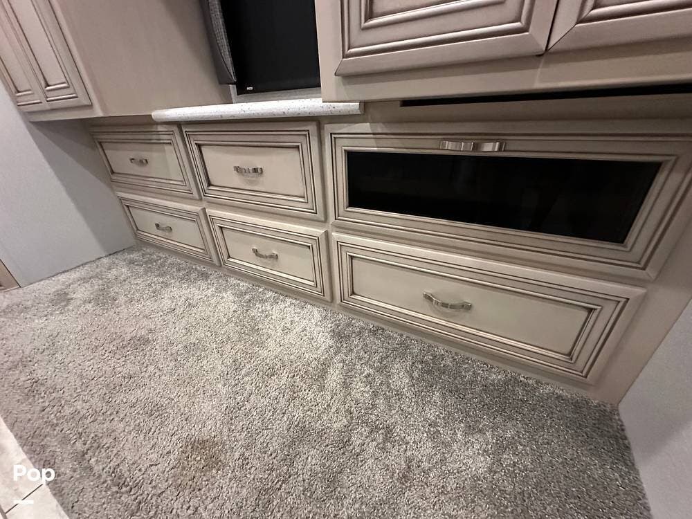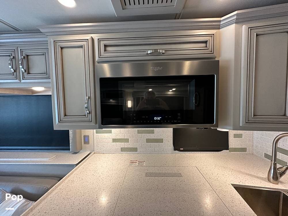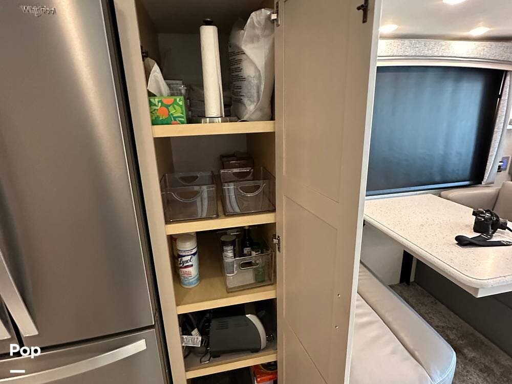The passenger-side kitchen is fully equipped with polished countertops, a stainless-steel sink, and a sink cover. The cook will appreciate the 30" over-the-range stainless steel microwave convection oven, the 3-burner cooktop, and the 10 cubic foot stainless steel French door residential-size refrigerator. There are lots of hardwood cabinets and pantry storage, including a pull-out cabinet and a counter extension.