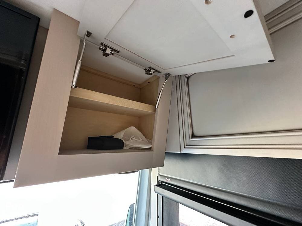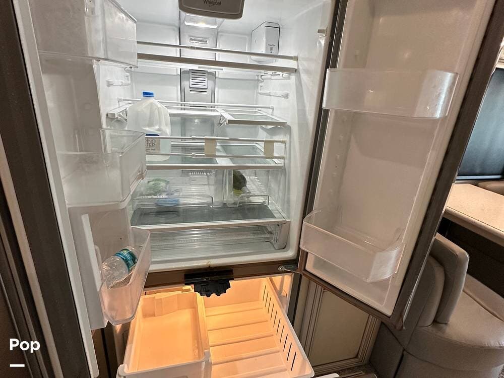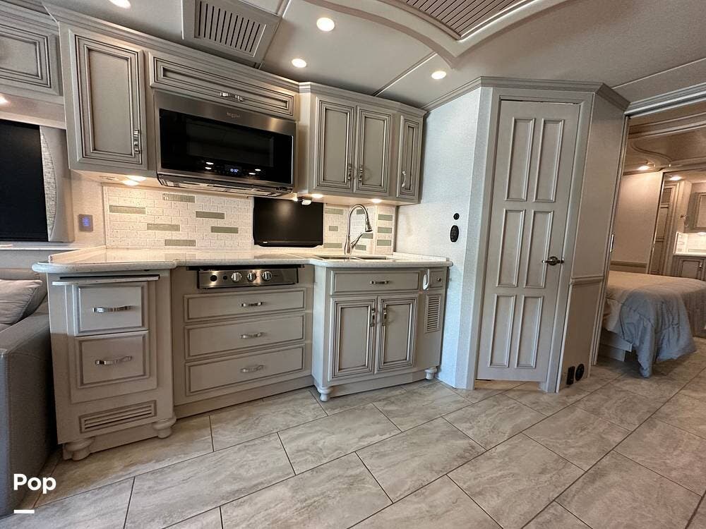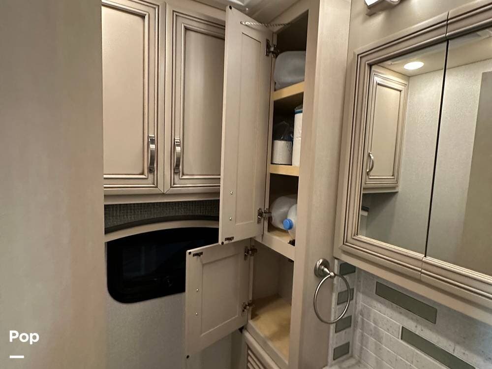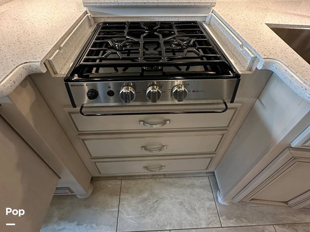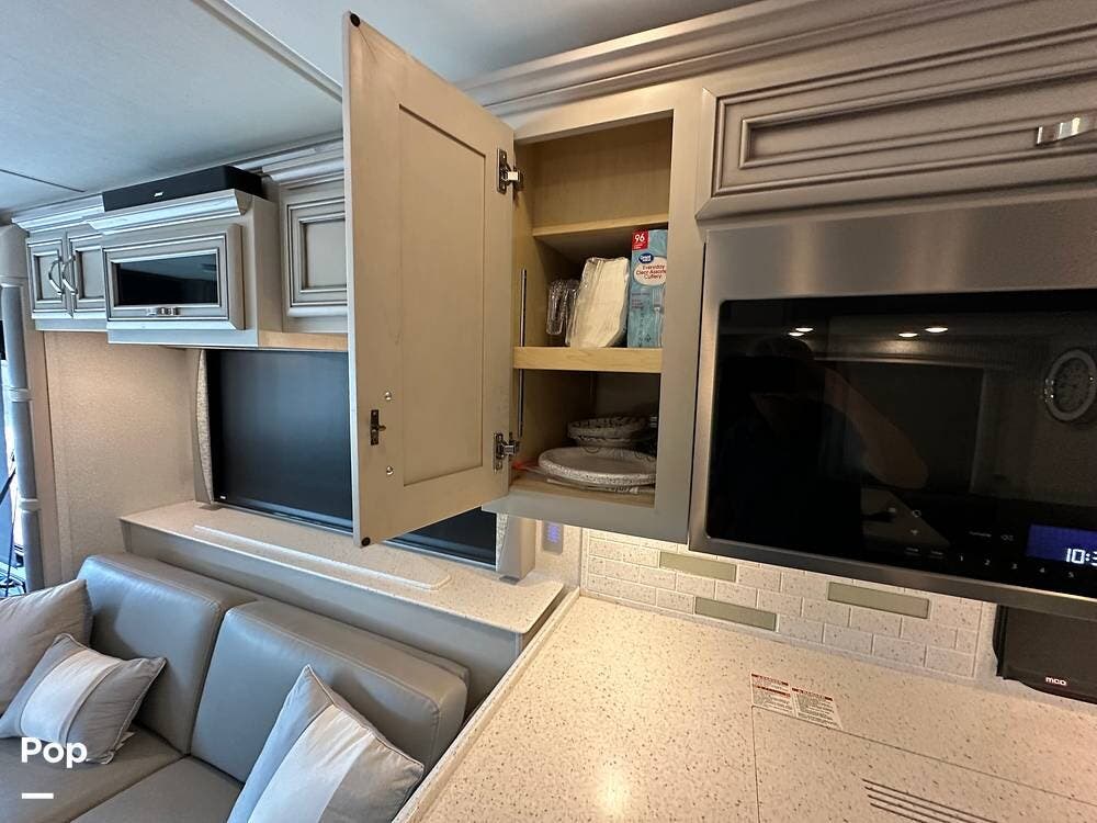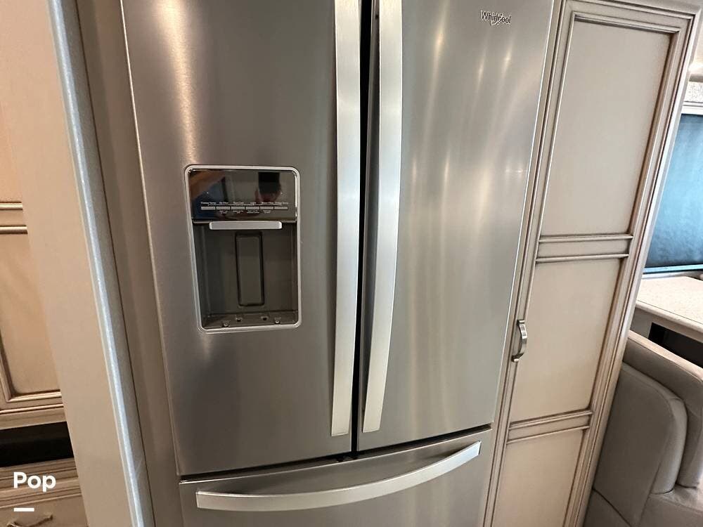 The passenger-side kitchen is fully equipped with polished countertops, a stainless-steel sink, and a sink cover. The cook will appreciate the 30" over-the-range stainless steel microwave convection oven, the 3-burner cooktop, and the 10 cubic foot stainless steel French door residential-size refrigerator. There are lots of hardwood cabinets and pantry storage, including a pull-out cabinet and a counter extension.