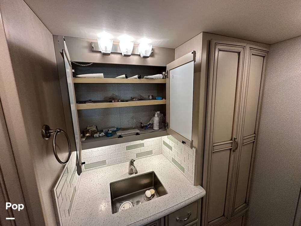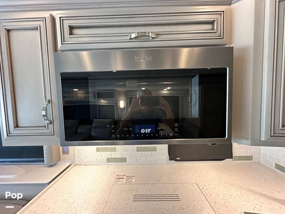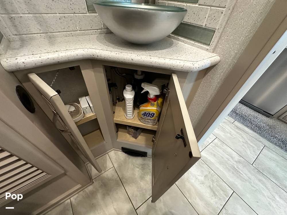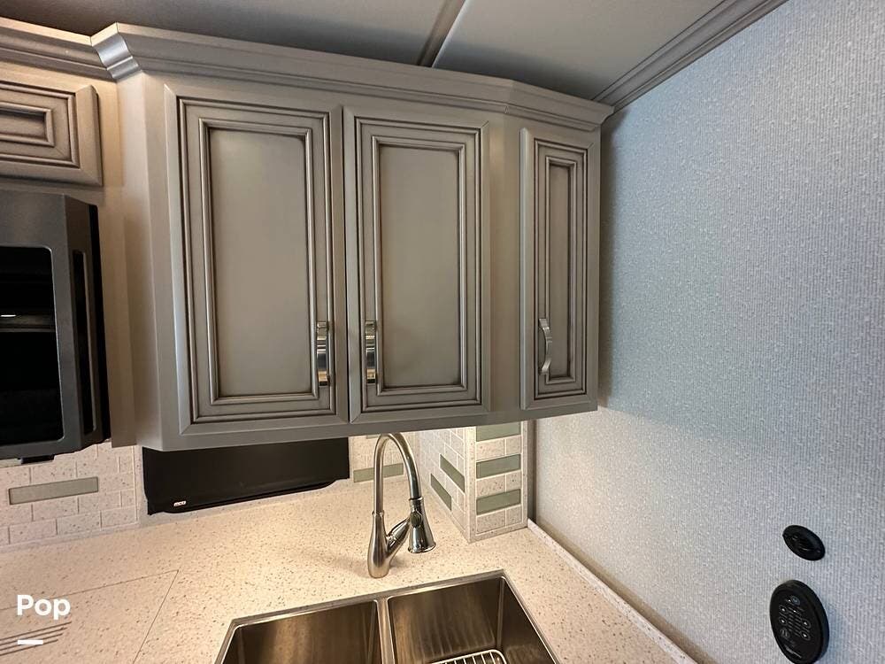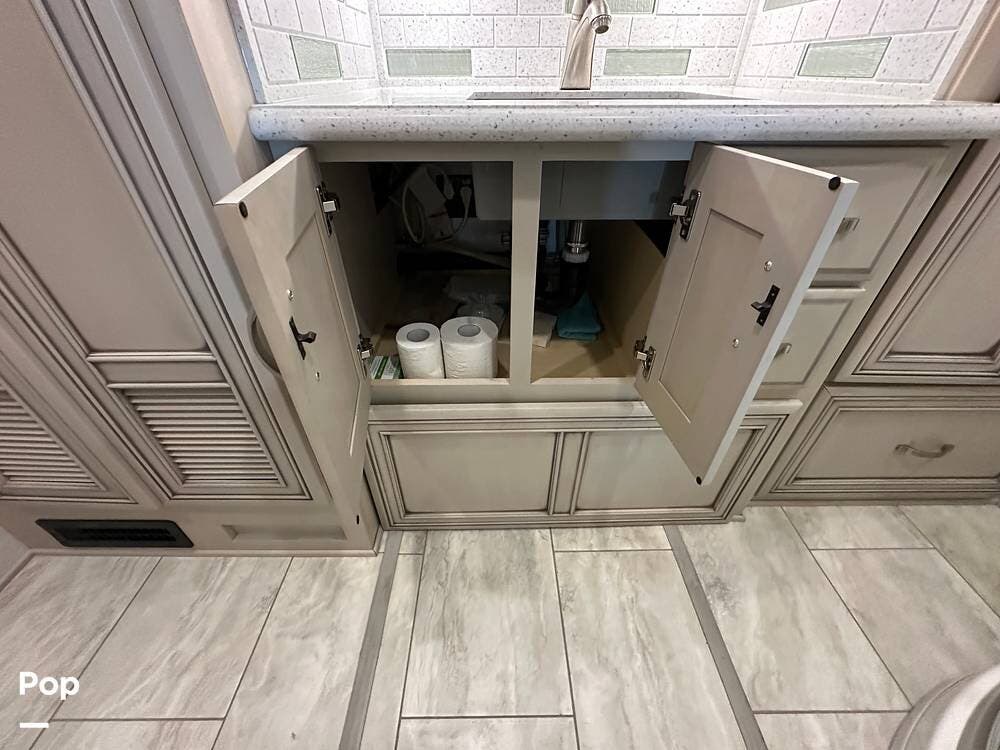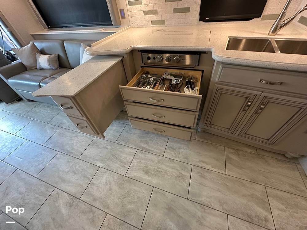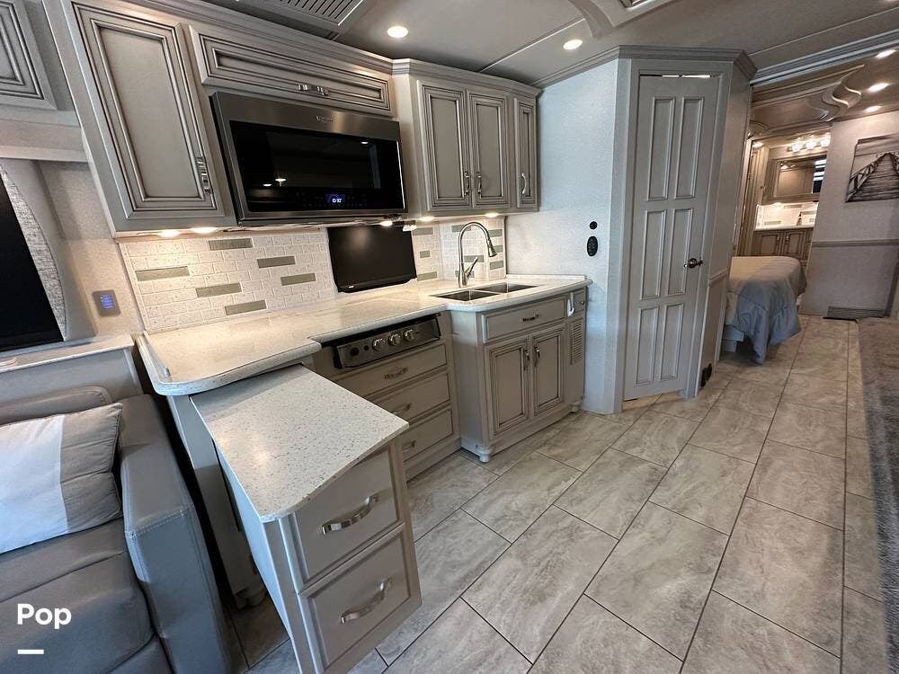 The passenger-side kitchen is fully equipped with polished countertops, a stainless-steel sink, and a sink cover. The cook will appreciate the 30" over-the-range stainless steel microwave convection oven, the 3-burner cooktop, and the 10 cubic foot stainless steel French door residential-size refrigerator. There are lots of hardwood cabinets and pantry storage, including a pull-out cabinet and a counter extension.