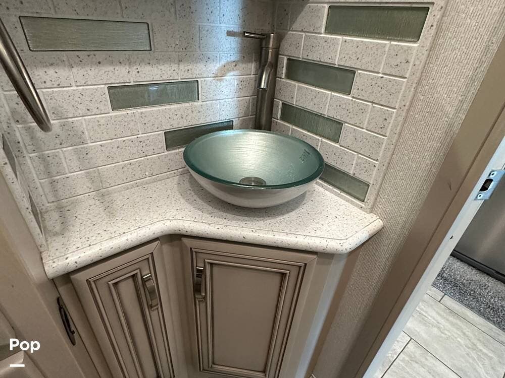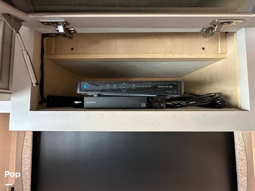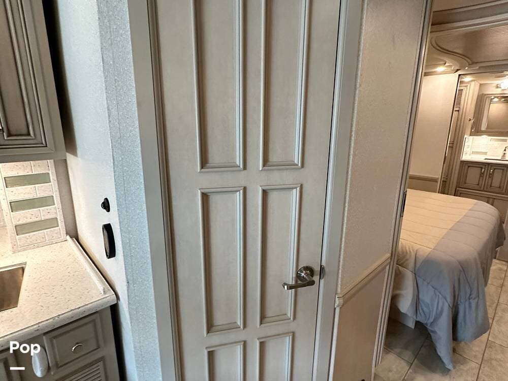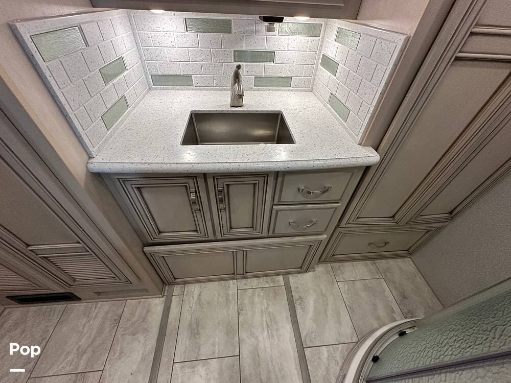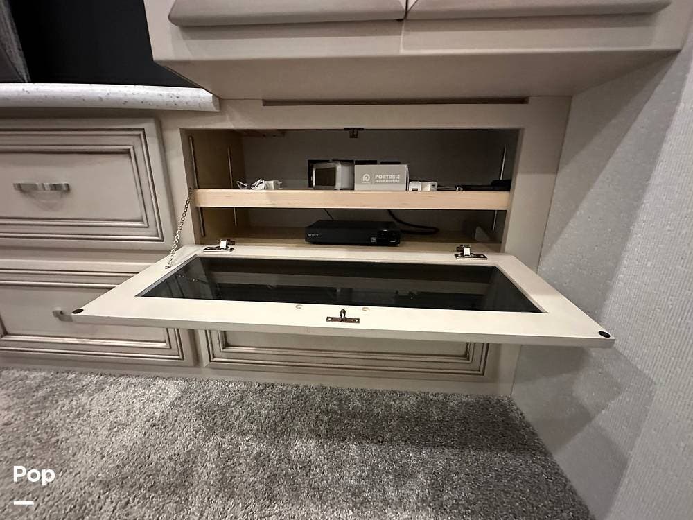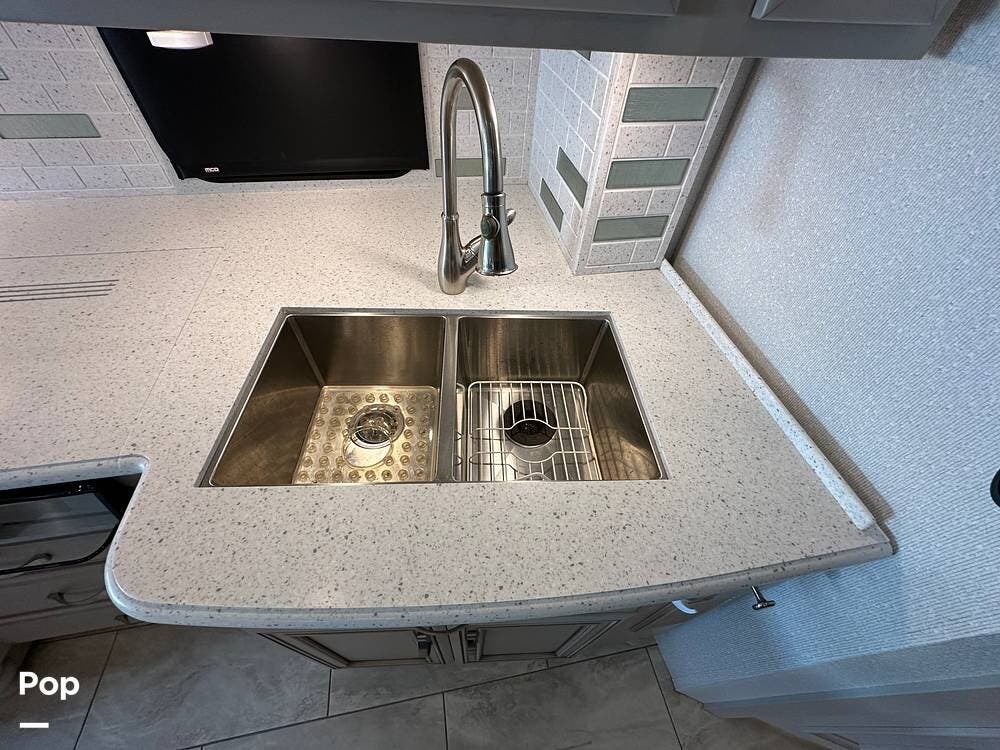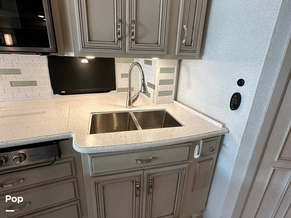 The passenger-side kitchen is fully equipped with polished countertops, a stainless-steel sink, and a sink cover. The cook will appreciate the 30" over-the-range stainless steel microwave convection oven, the 3-burner cooktop, and the 10 cubic foot stainless steel French door residential-size refrigerator. There are lots of hardwood cabinets and pantry storage, including a pull-out cabinet and a counter extension.