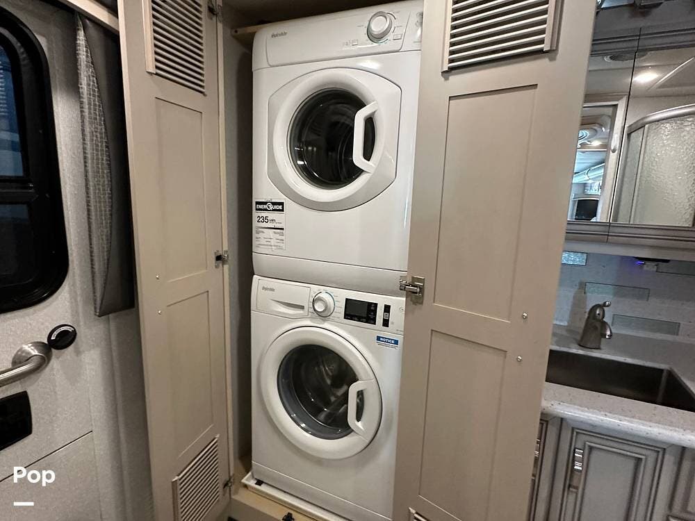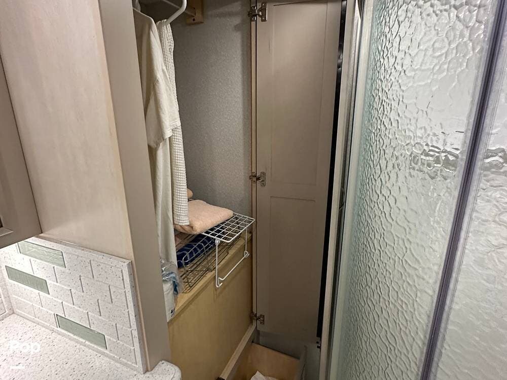 The rear bath has a large shower, a vanity with a sink, lots of storage, a porcelain toilet, and a closet containing a separate Splendide clothes washer and dryer.