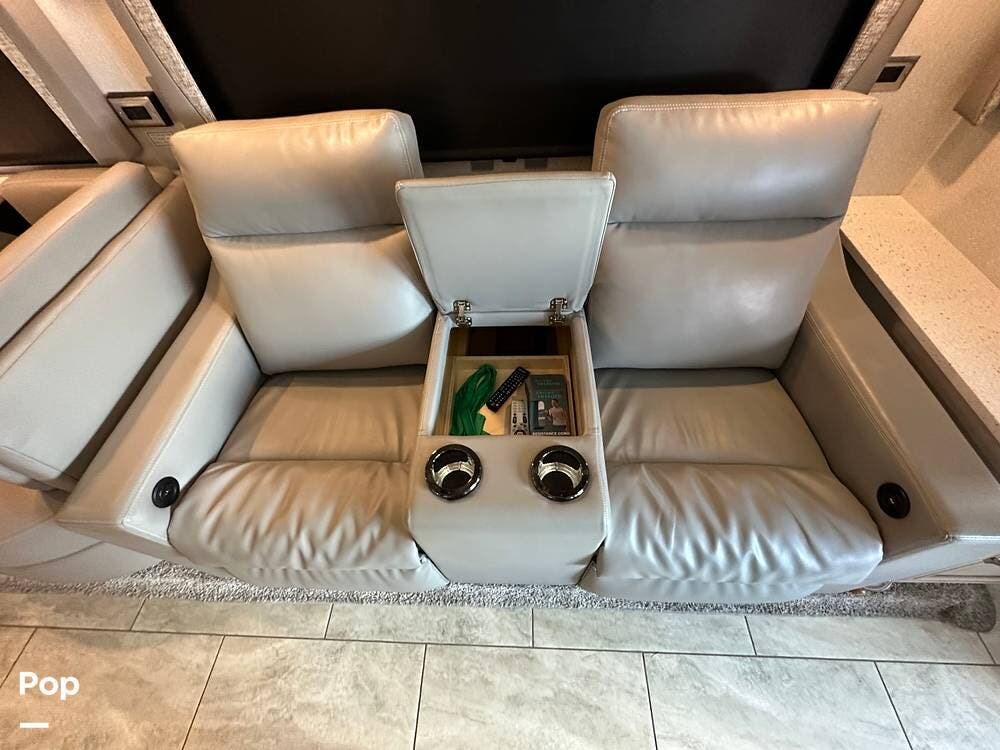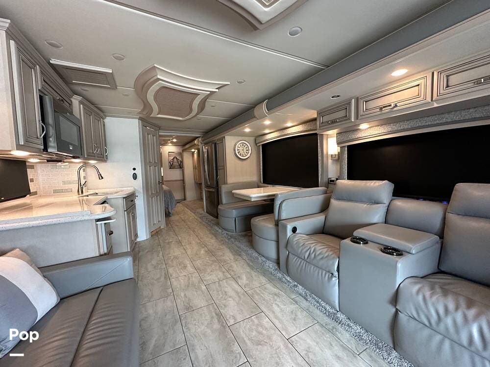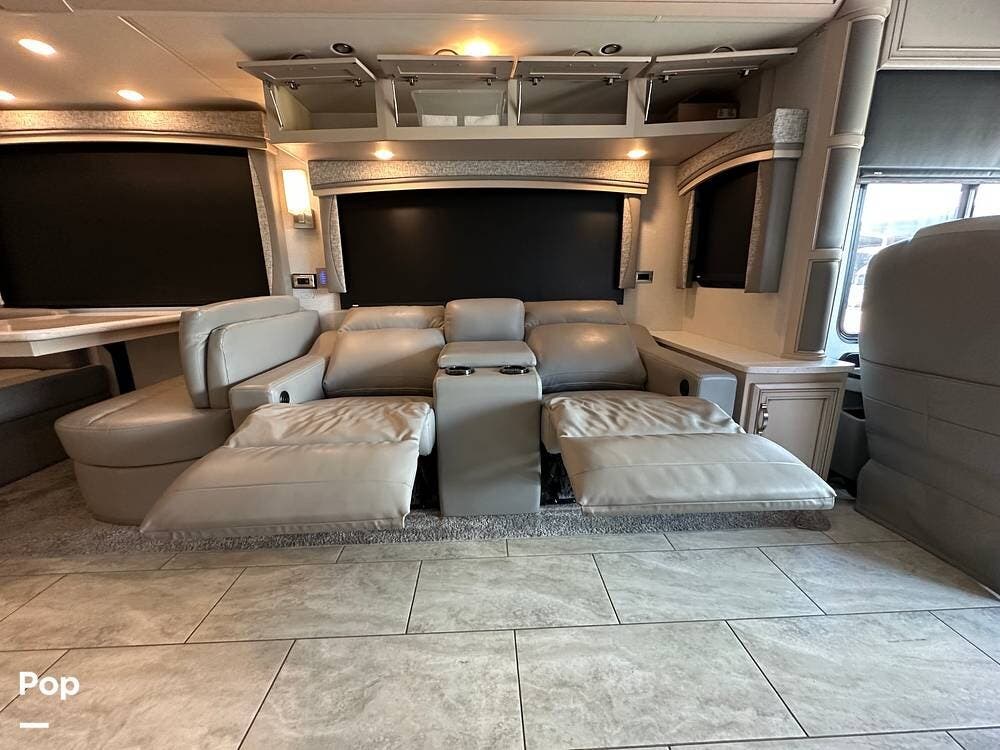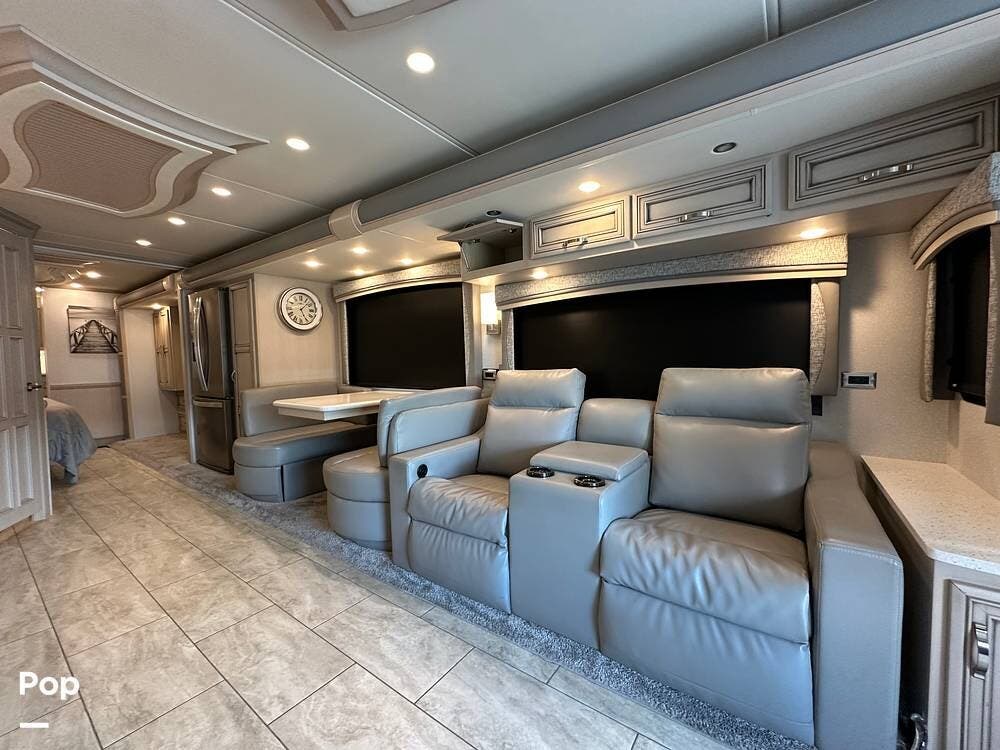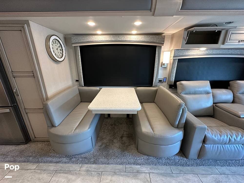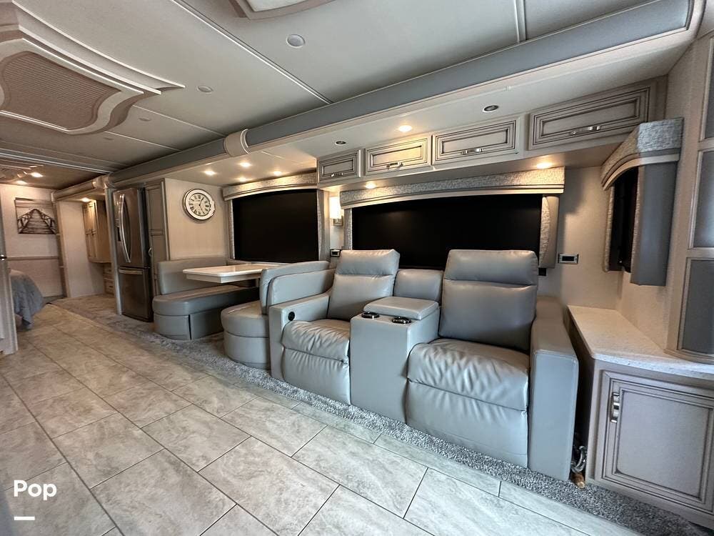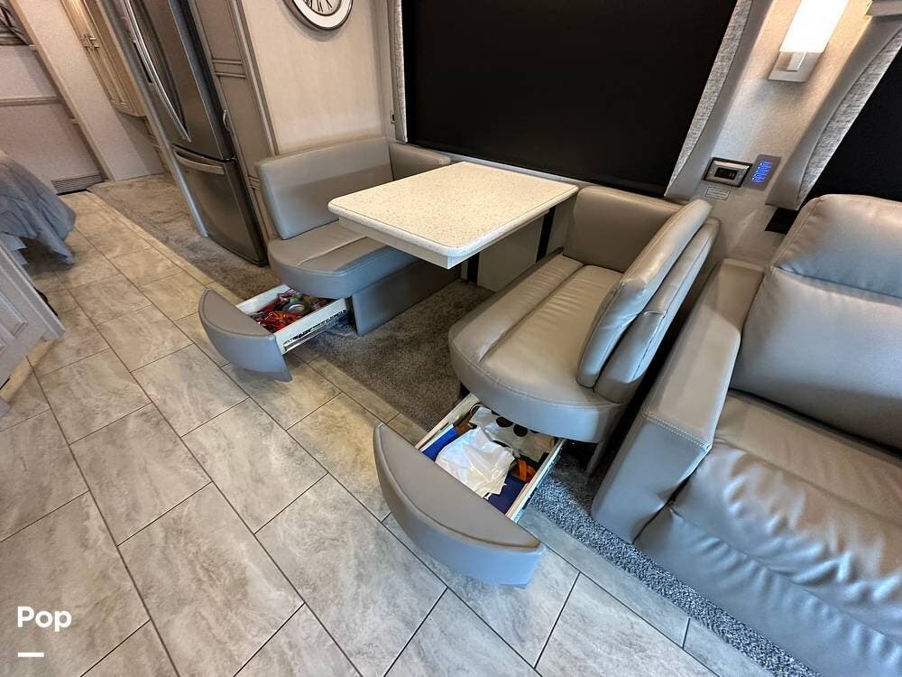 To the left is an upholstered convertible dinette with storage below and a 50"high definition TV above. Just across for comfortable viewing or just relaxing, you will find twin power recliner theater seats and a U-kralux sofa.