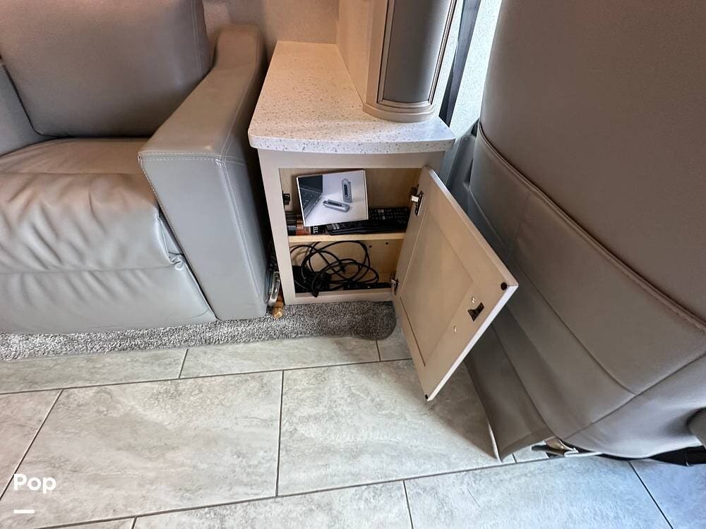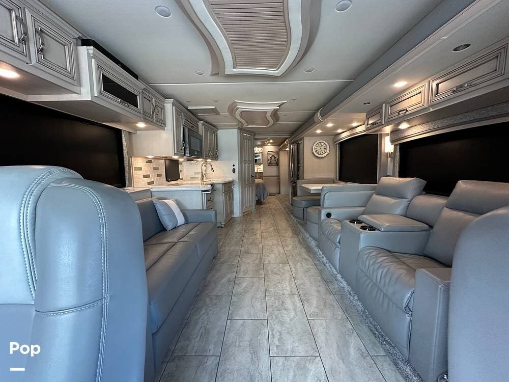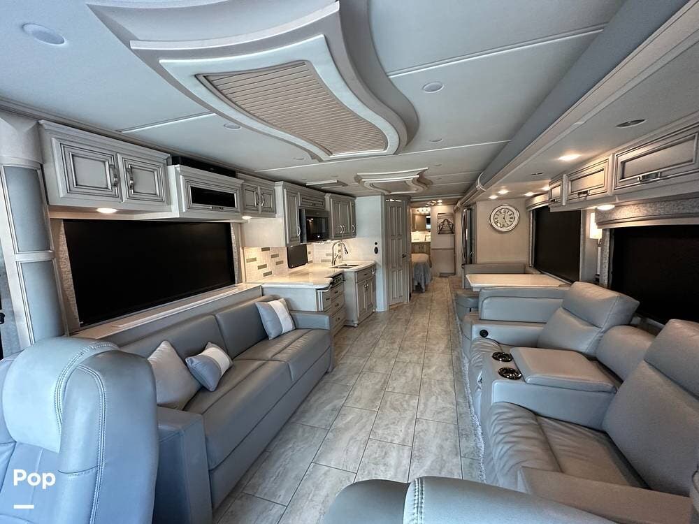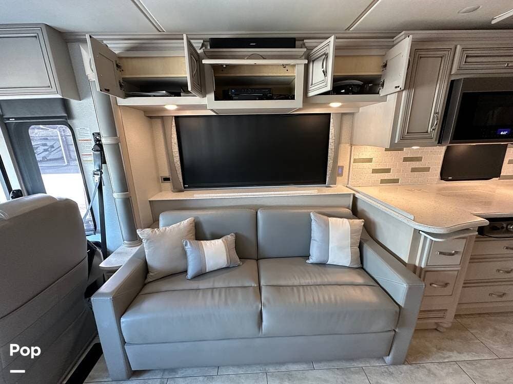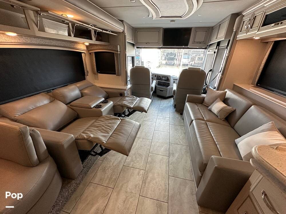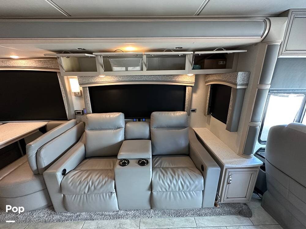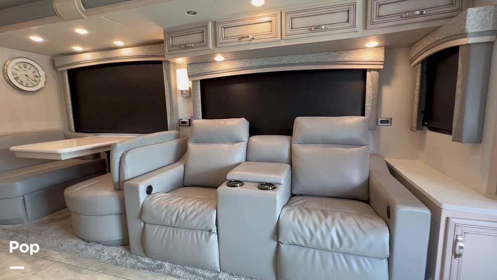 To the left is an upholstered convertible dinette with storage below and a 50"high definition TV above. Just across for comfortable viewing or just relaxing, you will find twin power recliner theater seats and a U-kralux sofa.