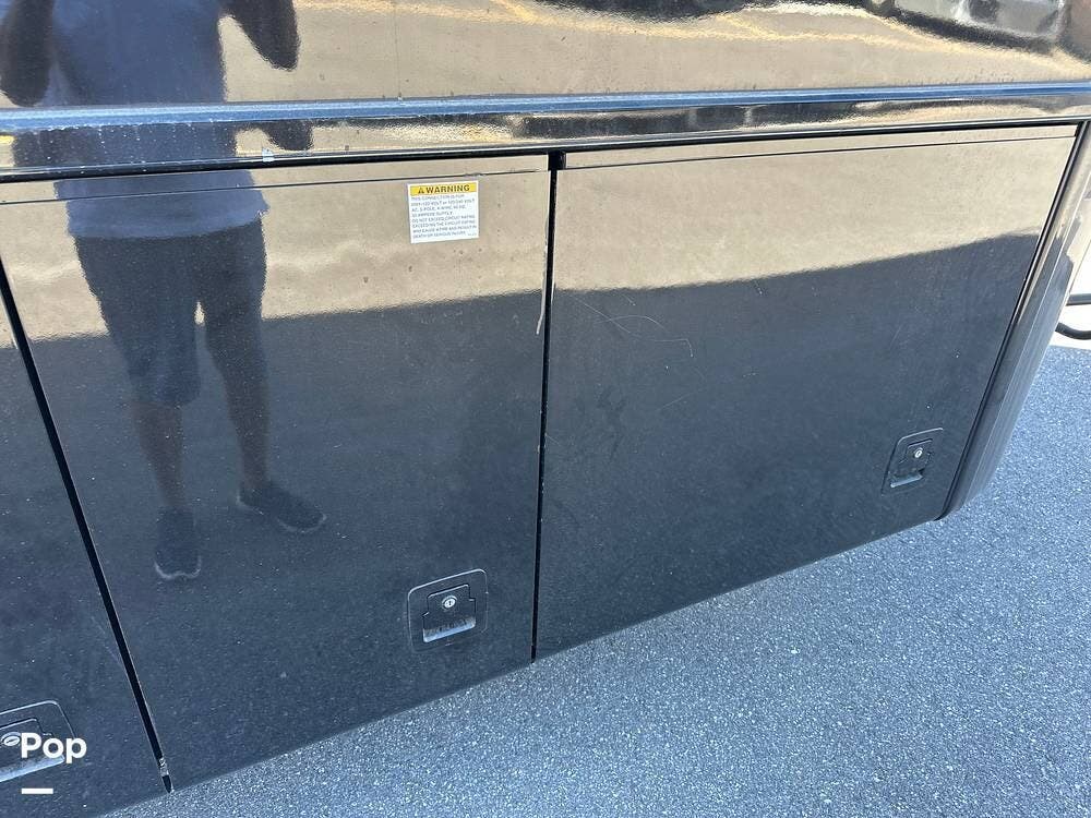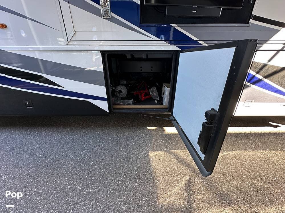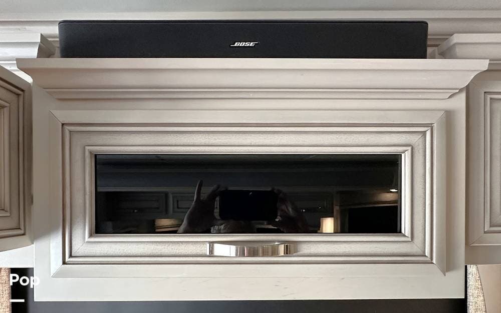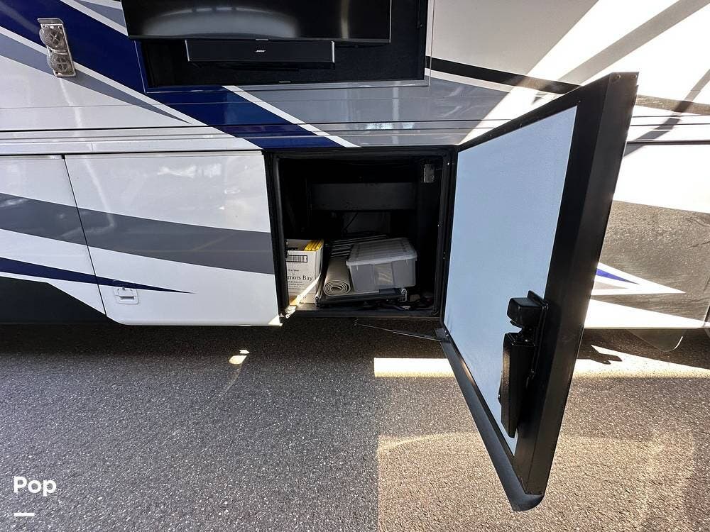 convex exterior mirrors with remote control and defrost, an entrance door with automatic step, and Smart Level hydraulic leveling jacks. 2 awnings. Outdoor entertainment is provided by a 43-inch Samsung LED TV and a soundbar.