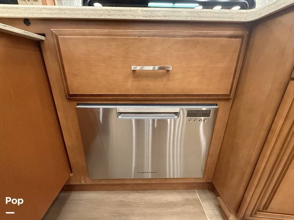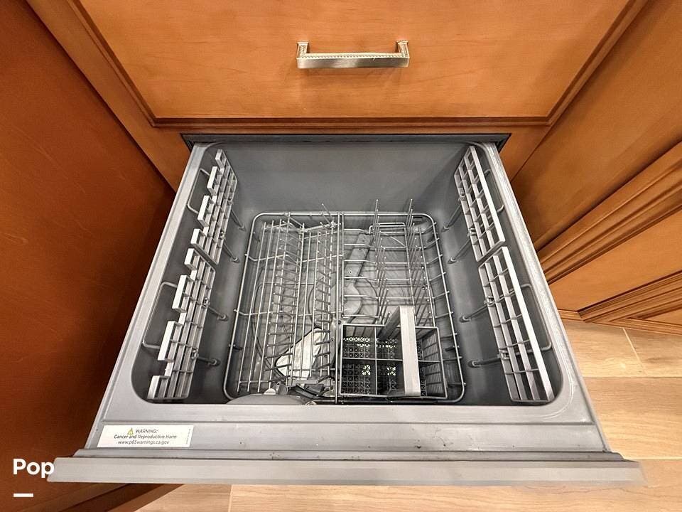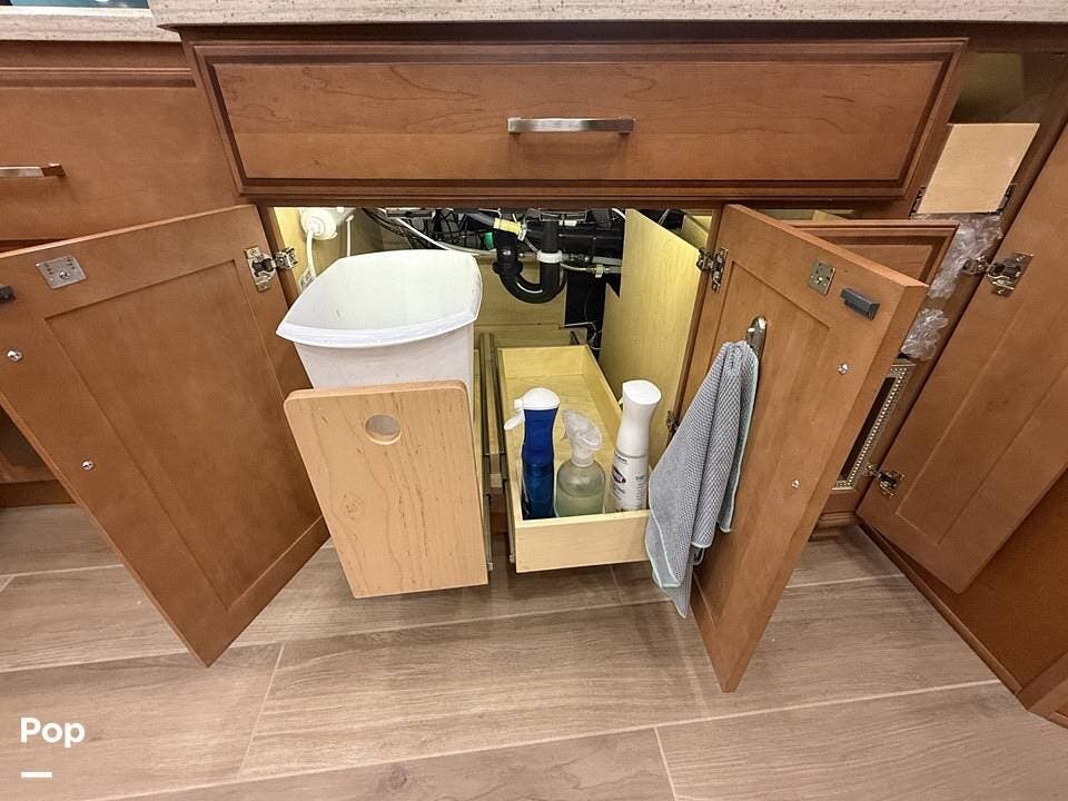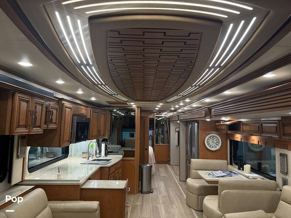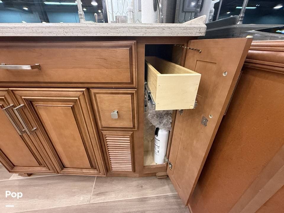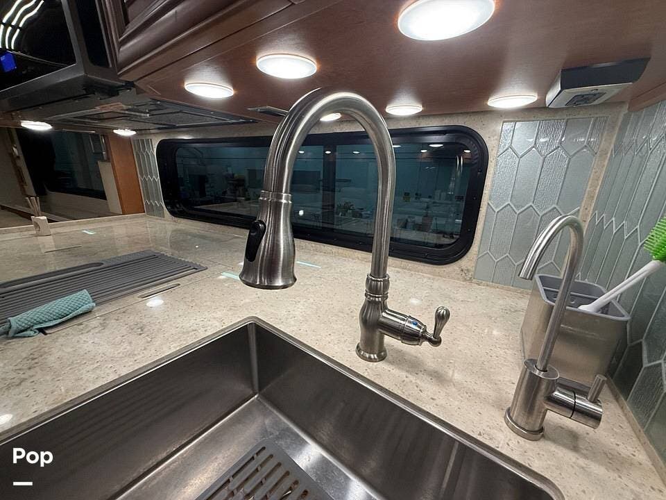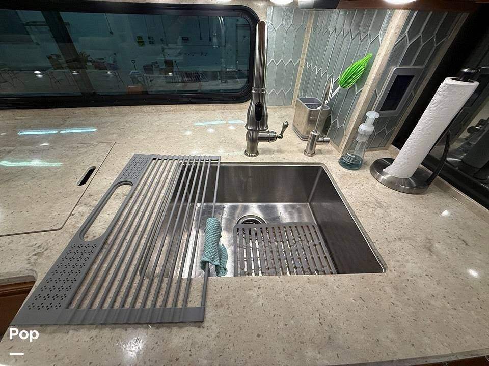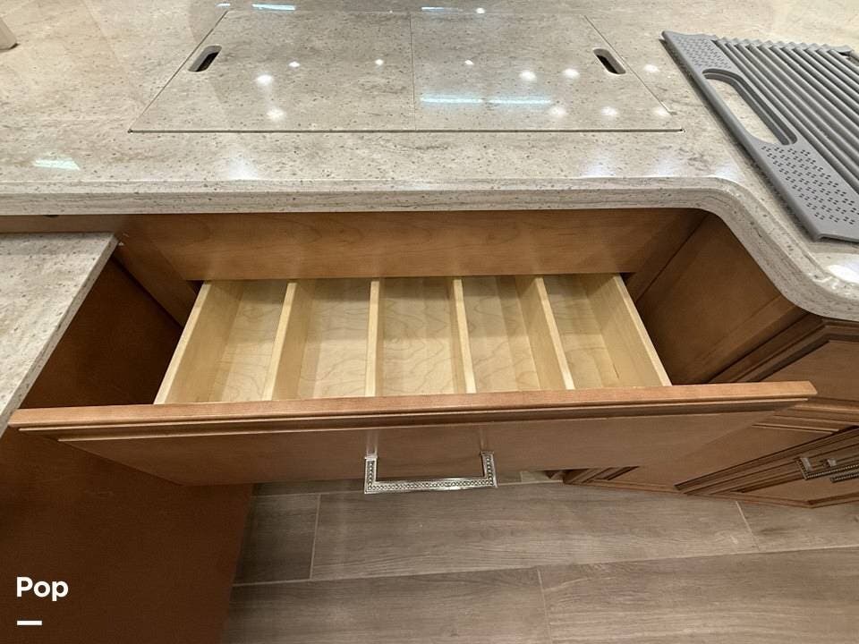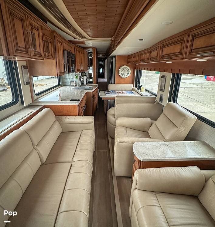 Inside, you'll find top-of-the-line residential features, including a full-sized French door refrigerator/freezer, a two-burner induction cooktop, a convection microwave oven, a large single-bowl sink, a dishwasher, a slide-out countertop extension with drawers, a pantry, a washer and dryer, and a built-in safe. Motion-powered shades and a basement-mounted refrigerator/freezer provide added convenience and storage flexibility for extended journeys.