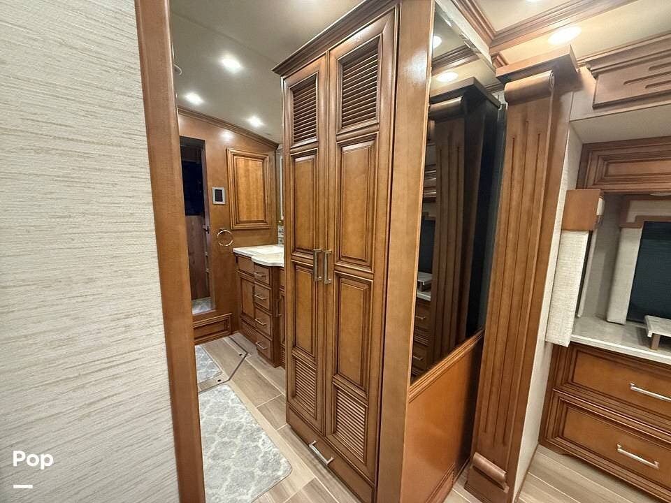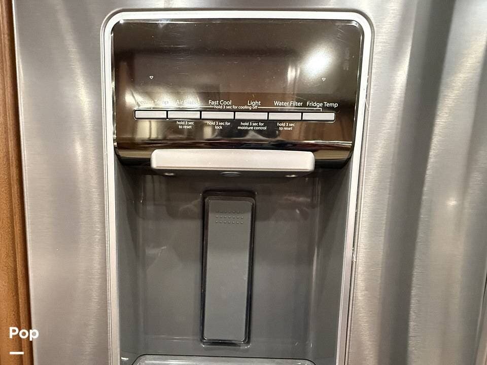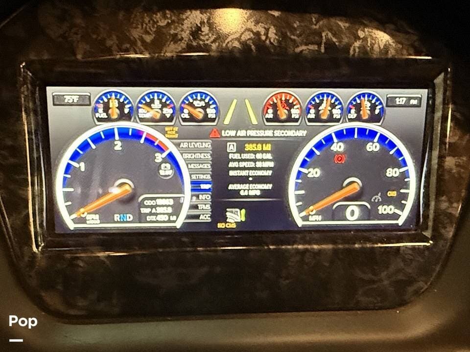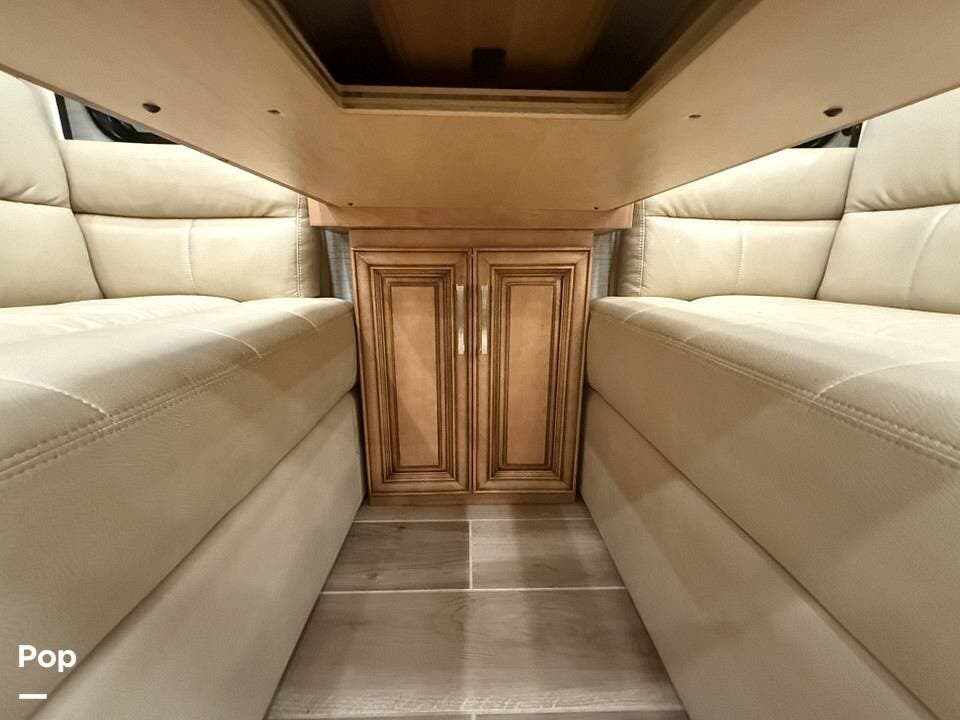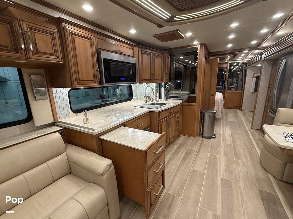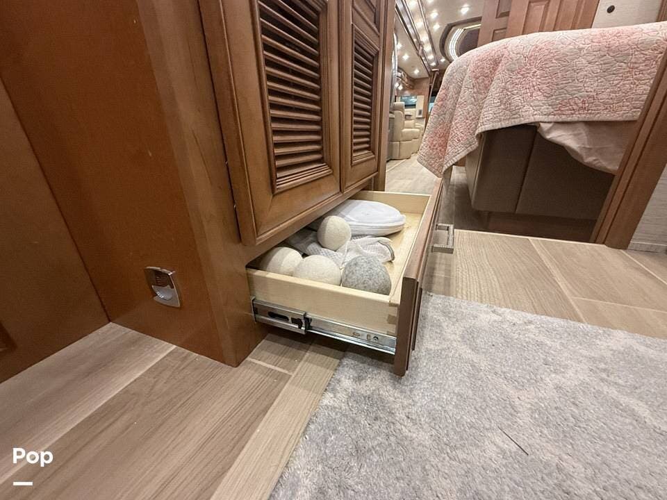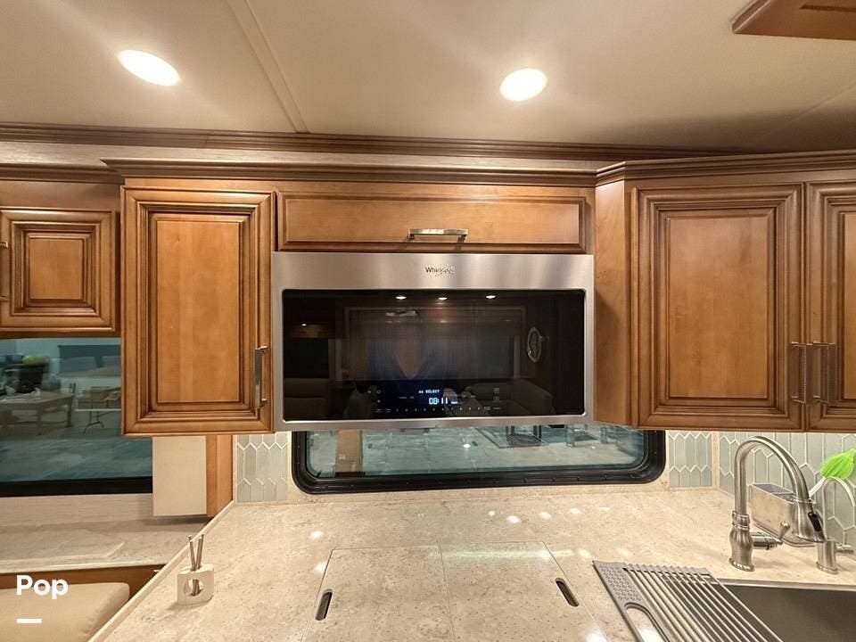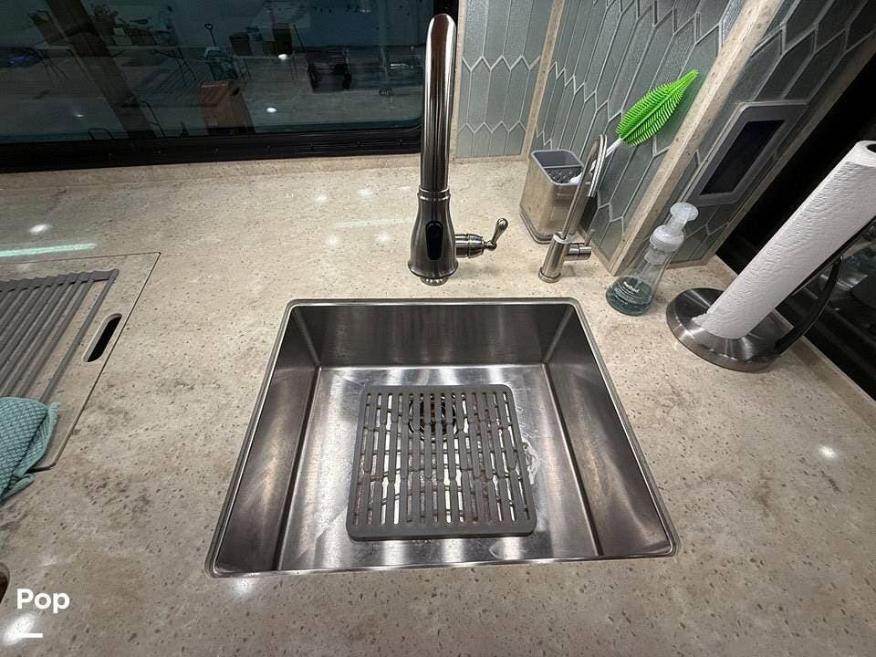 Inside, you'll find top-of-the-line residential features, including a full-sized French door refrigerator/freezer, a two-burner induction cooktop, a convection microwave oven, a large single-bowl sink, a dishwasher, a slide-out countertop extension with drawers, a pantry, a washer and dryer, and a built-in safe. Motion-powered shades and a basement-mounted refrigerator/freezer provide added convenience and storage flexibility for extended journeys.