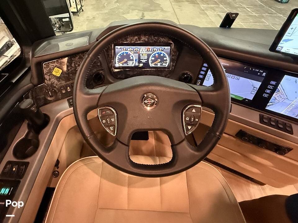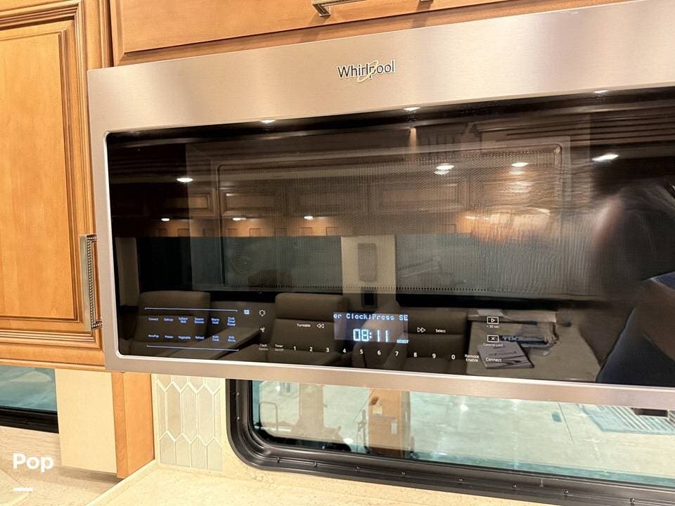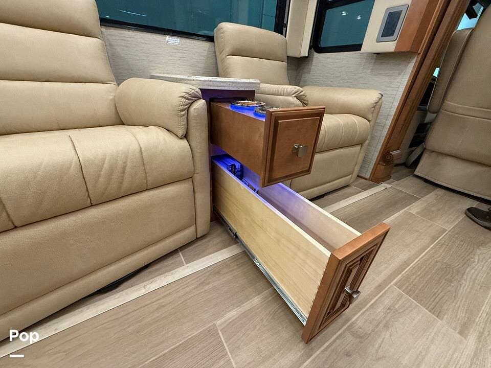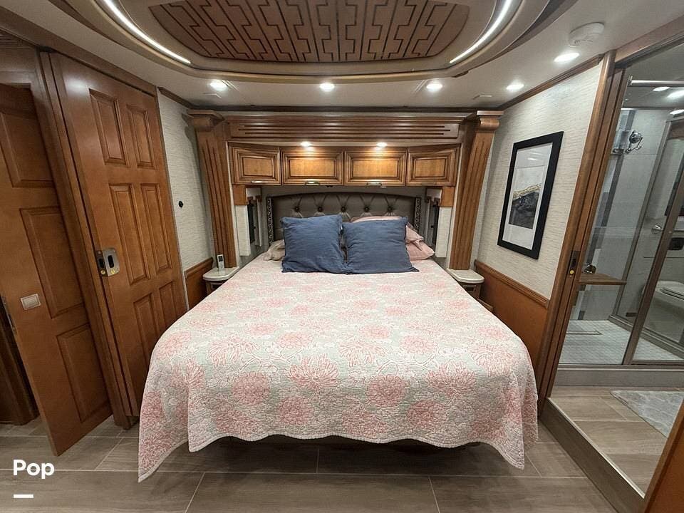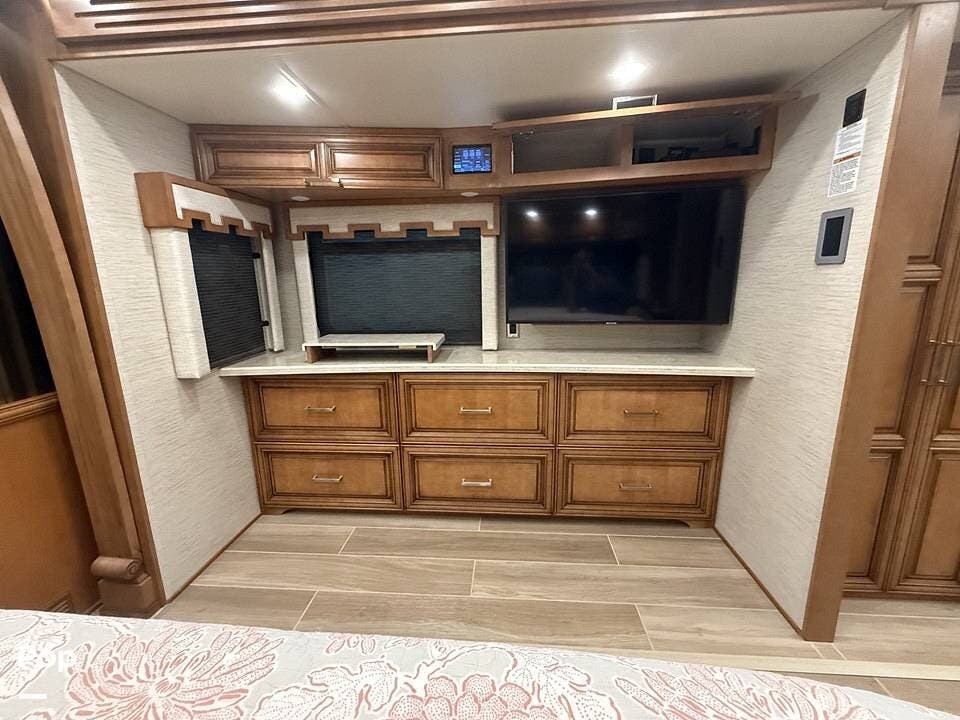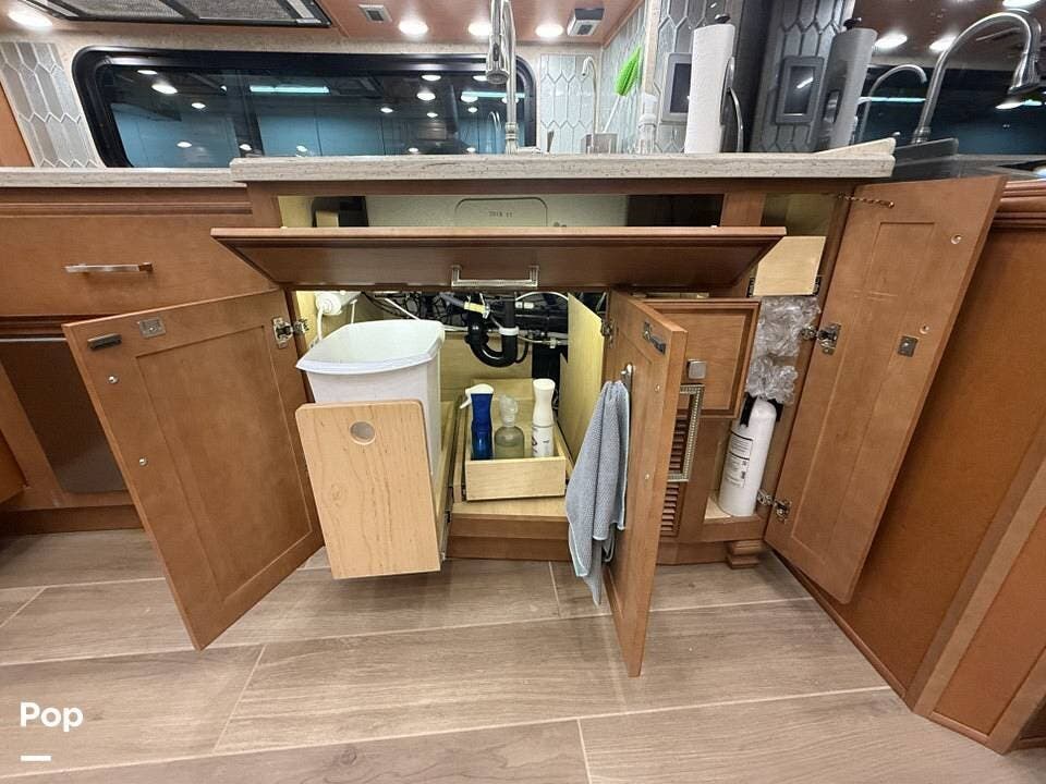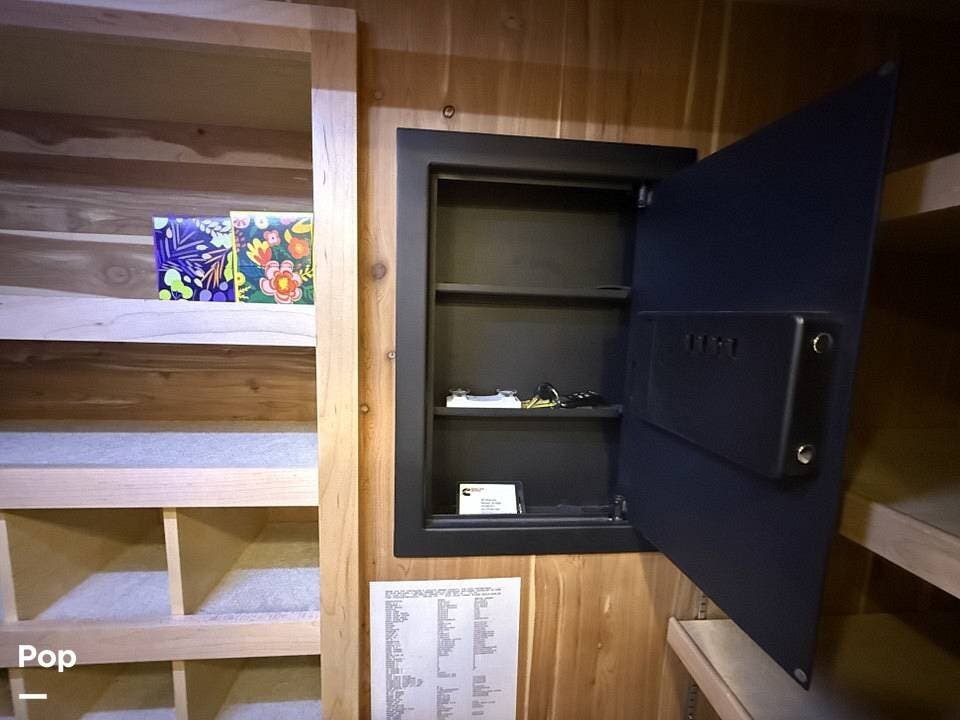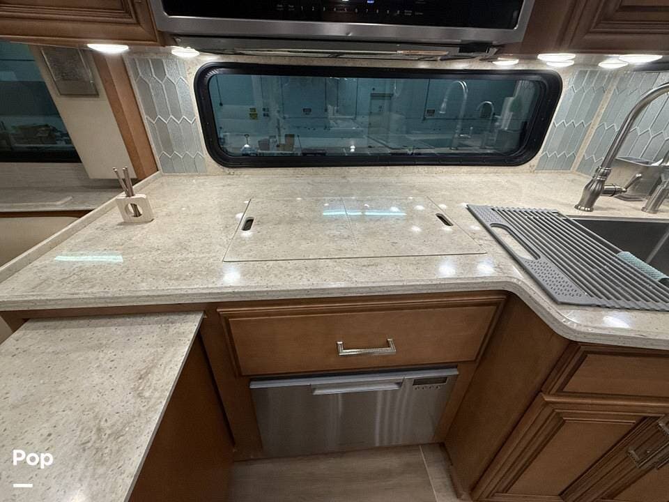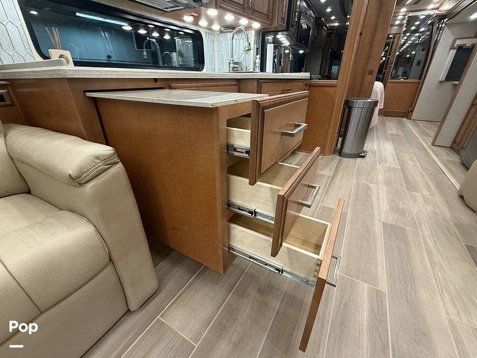 Inside, you'll find top-of-the-line residential features, including a full-sized French door refrigerator/freezer, a two-burner induction cooktop, a convection microwave oven, a large single-bowl sink, a dishwasher, a slide-out countertop extension with drawers, a pantry, a washer and dryer, and a built-in safe. Motion-powered shades and a basement-mounted refrigerator/freezer provide added convenience and storage flexibility for extended journeys.
