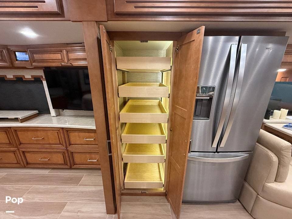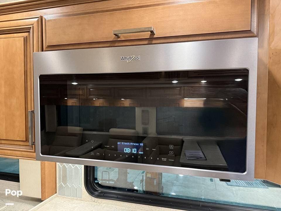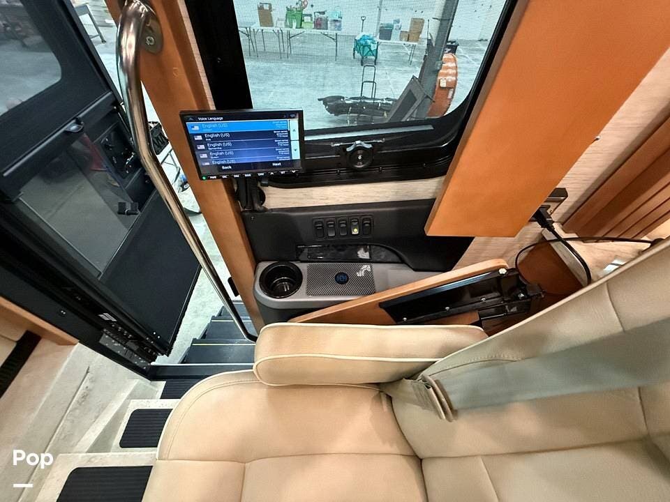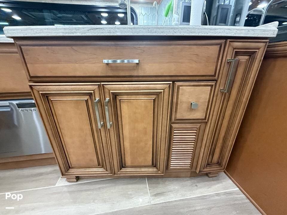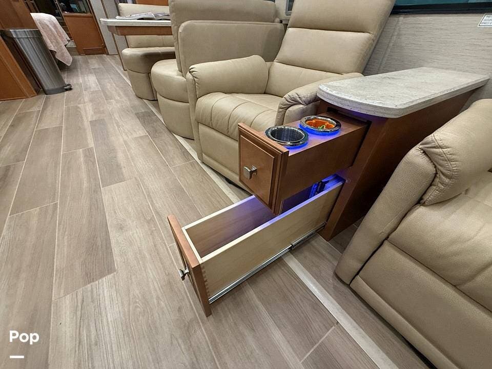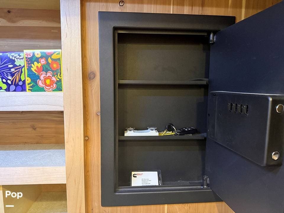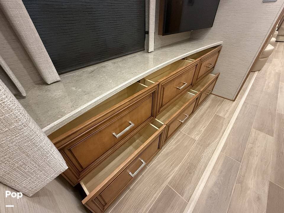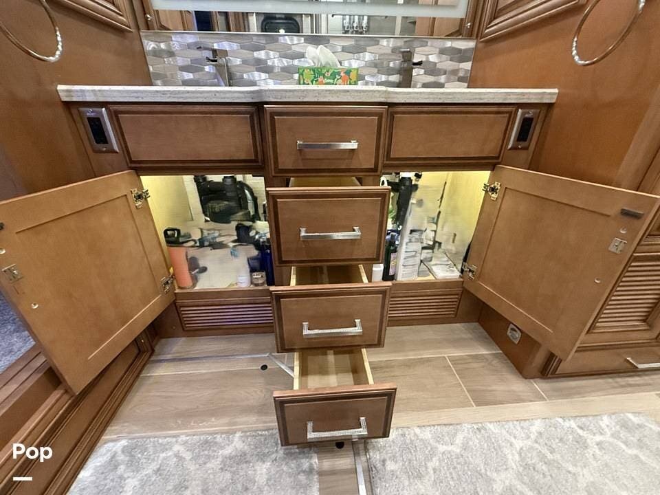Inside, you'll find top-of-the-line residential features, including a full-sized French door refrigerator/freezer, a two-burner induction cooktop, a convection microwave oven, a large single-bowl sink, a dishwasher, a slide-out countertop extension with drawers, a pantry, a washer and dryer, and a built-in safe. Motion-powered shades and a basement-mounted refrigerator/freezer provide added convenience and storage flexibility for extended journeys.