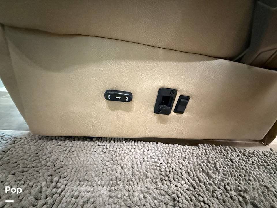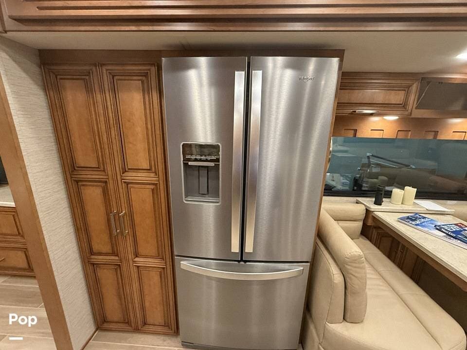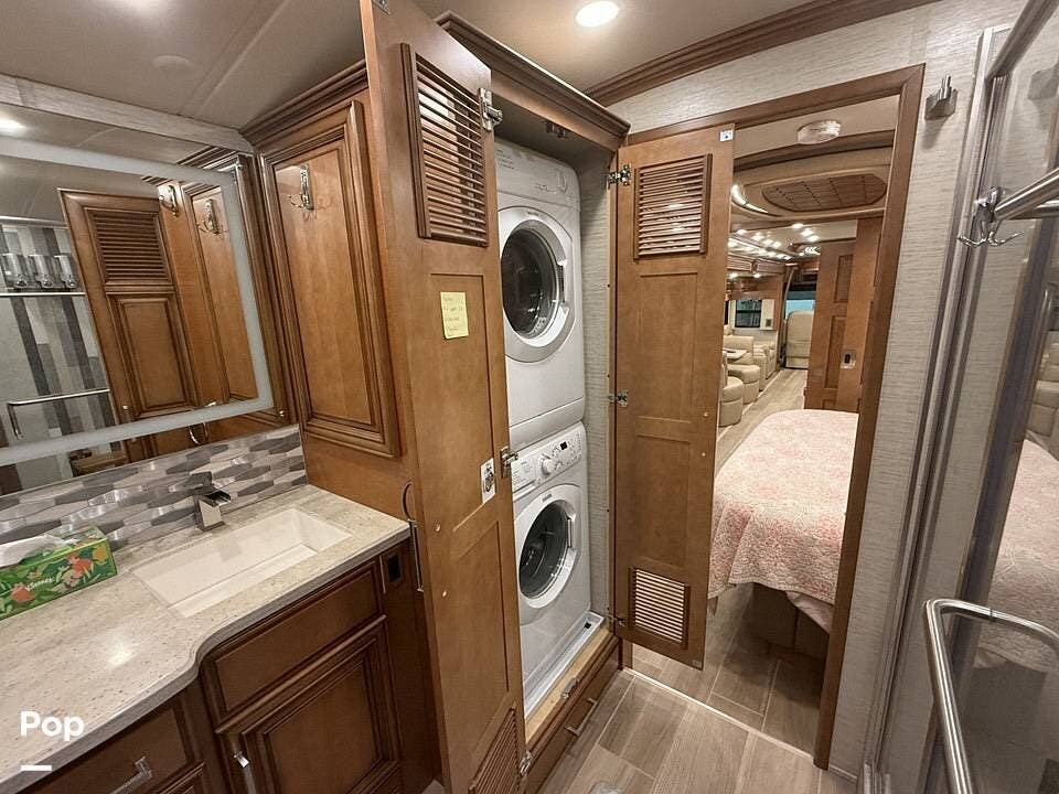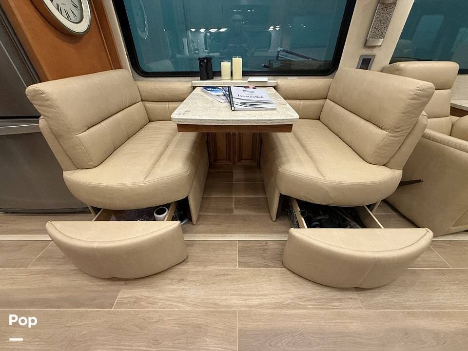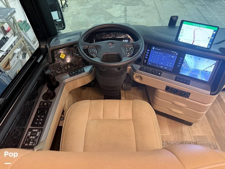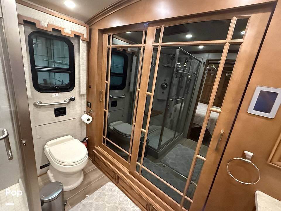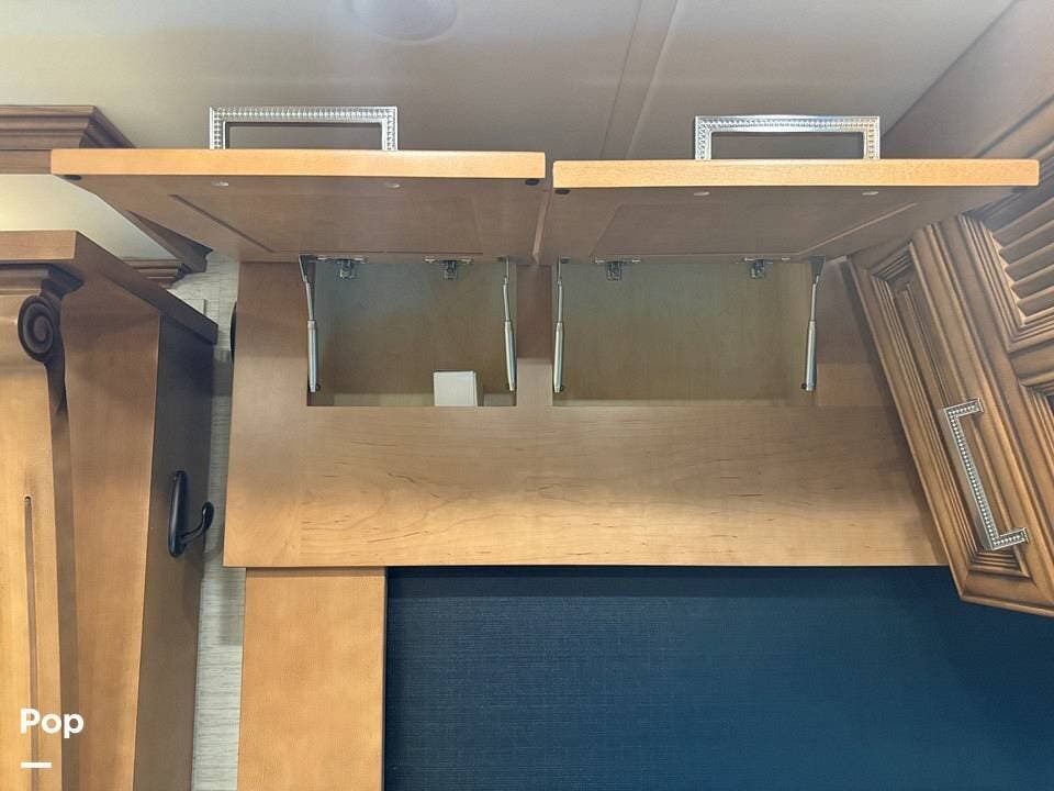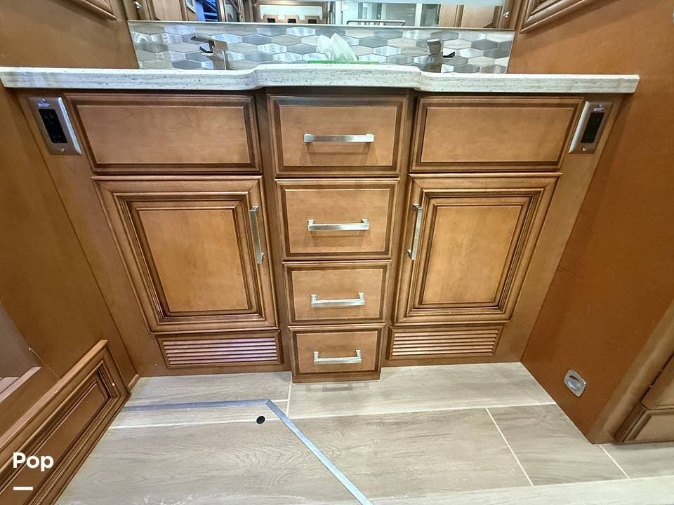 Inside, you'll find top-of-the-line residential features, including a full-sized French door refrigerator/freezer, a two-burner induction cooktop, a convection microwave oven, a large single-bowl sink, a dishwasher, a slide-out countertop extension with drawers, a pantry, a washer and dryer, and a built-in safe. Motion-powered shades and a basement-mounted refrigerator/freezer provide added convenience and storage flexibility for extended journeys.
